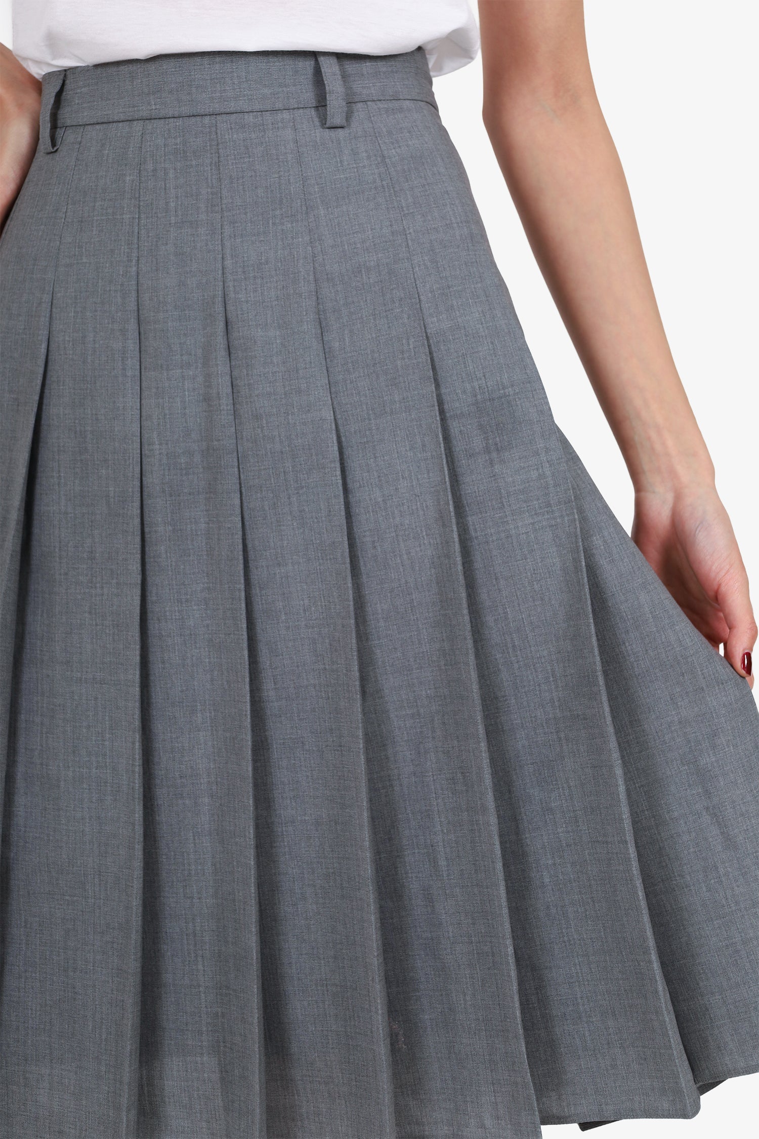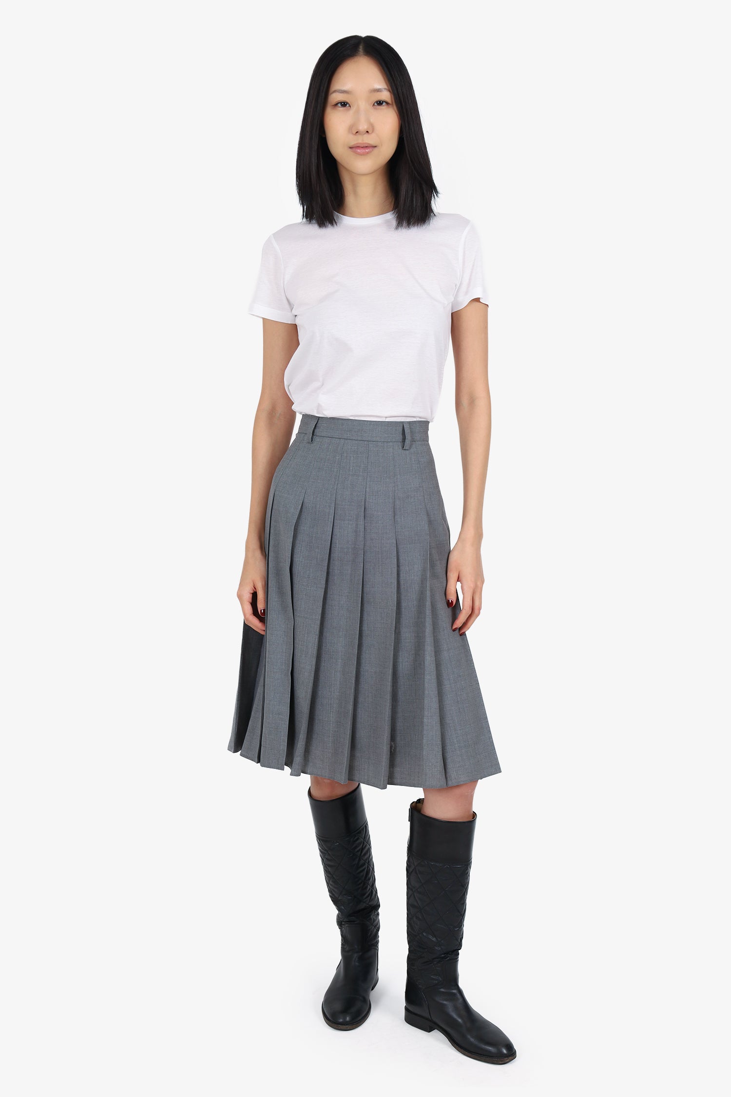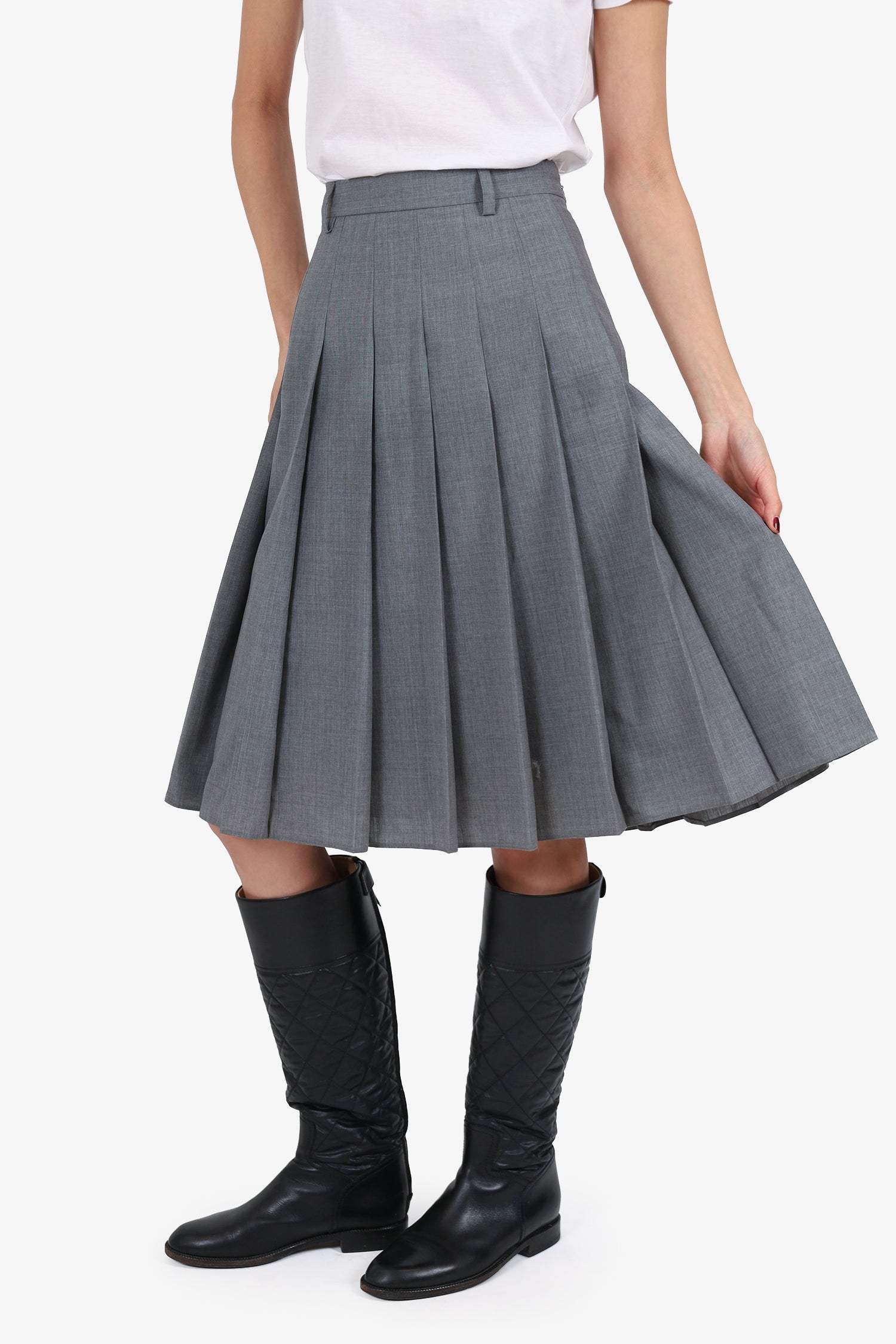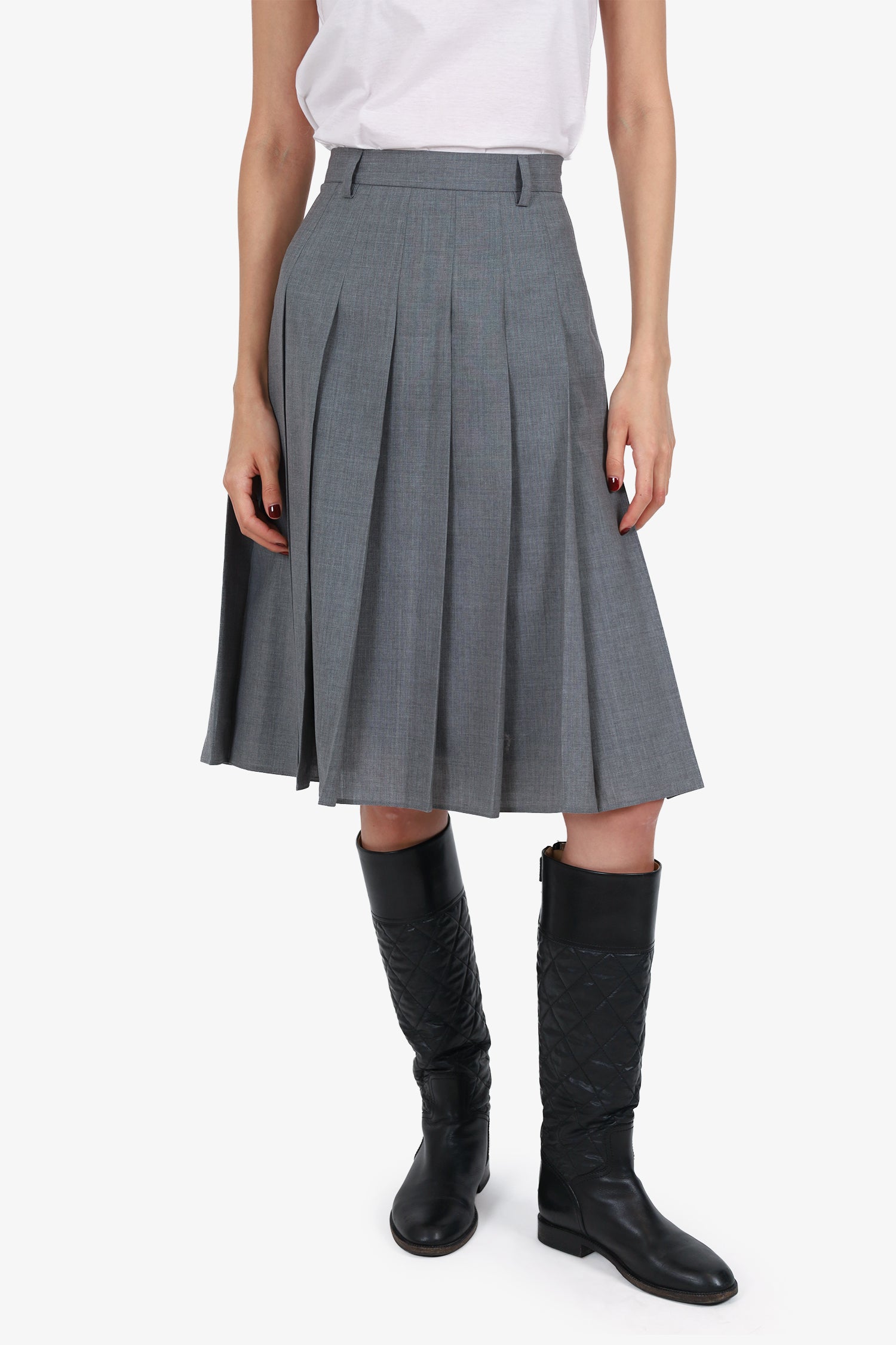 Refresh availabilityPrada Grey Wool Pleated Skirt. Slip-on. Side zip closure. Waistband belt loops. Lined interior. Tonal stitching.