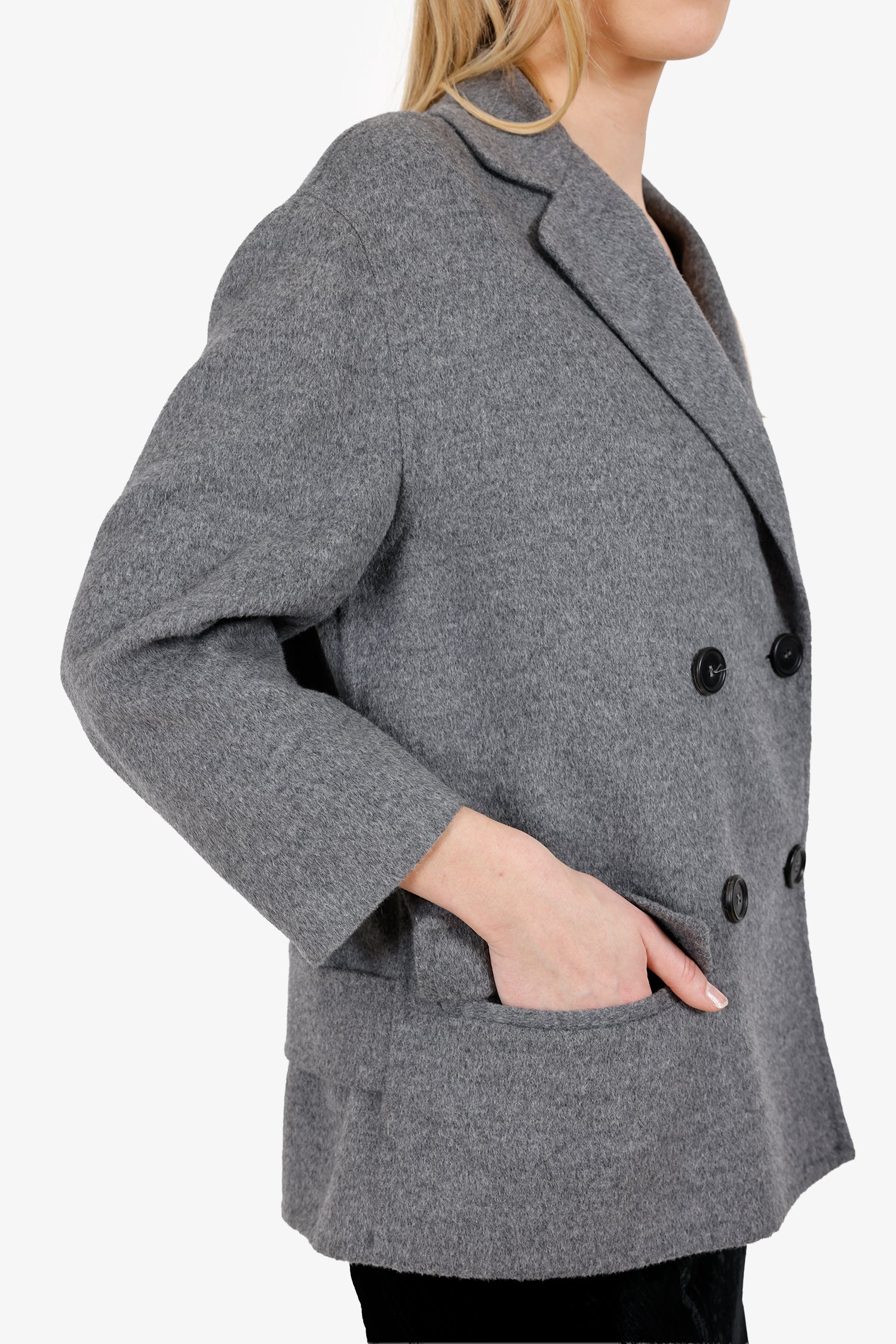 Refresh availabilityPrada Grey Wool/Angora Double Breasted Blazer. Pull-on. Notch lapel. Front button-up closure. 2 exterior front fold-over-flap pockets. Tonal stitching.