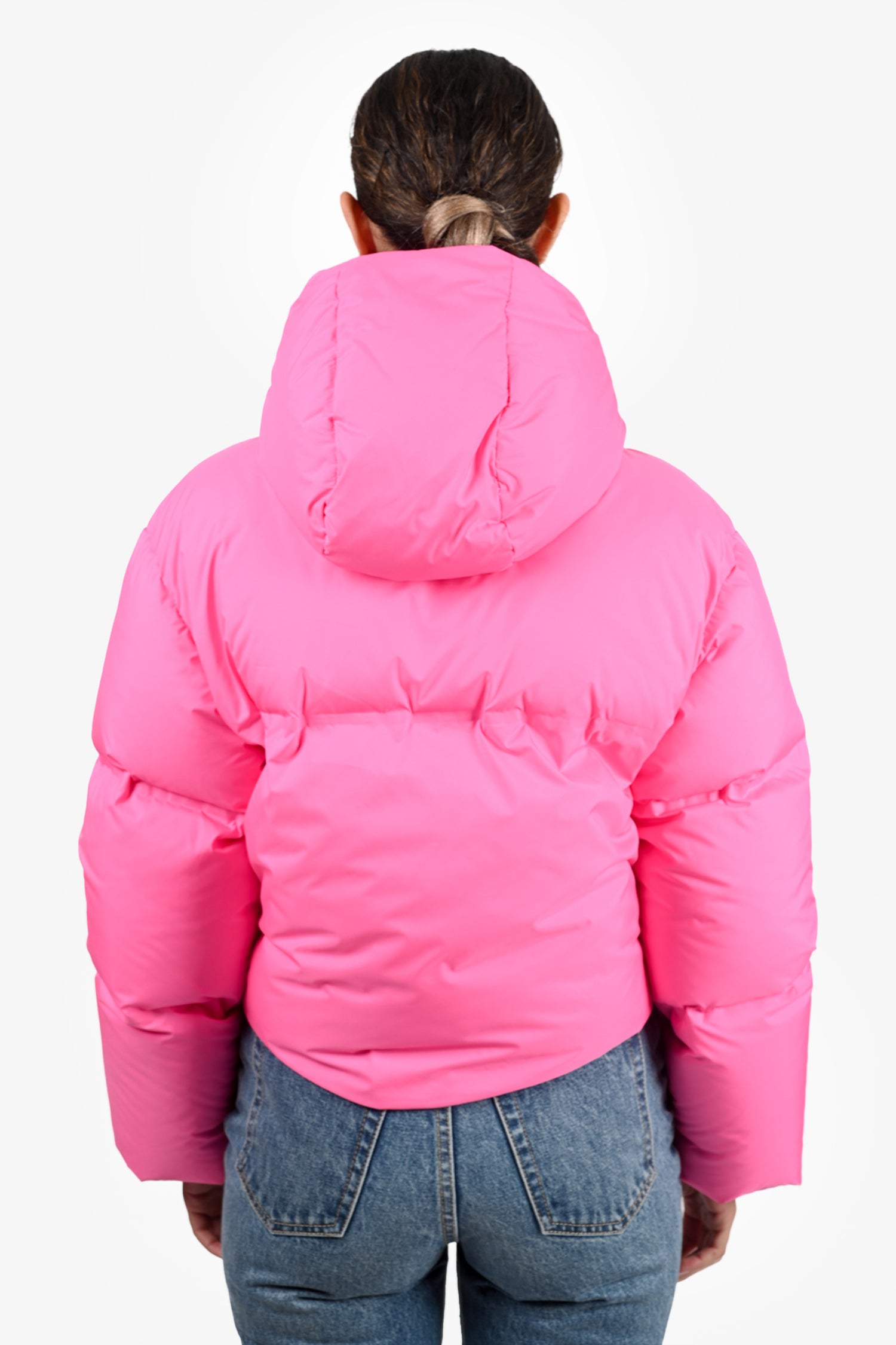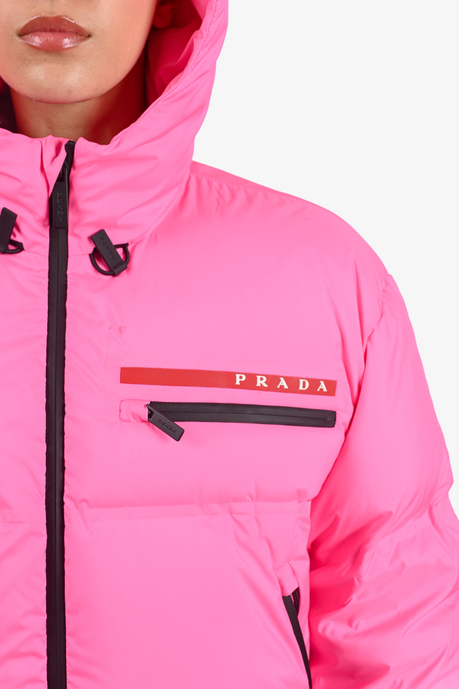 Refresh availabilityPrada Hot Pink Nylon Down Cropped Technical Jacket. Front zip closure. Front zip pockets. Ribbed, elasticized cuffs.