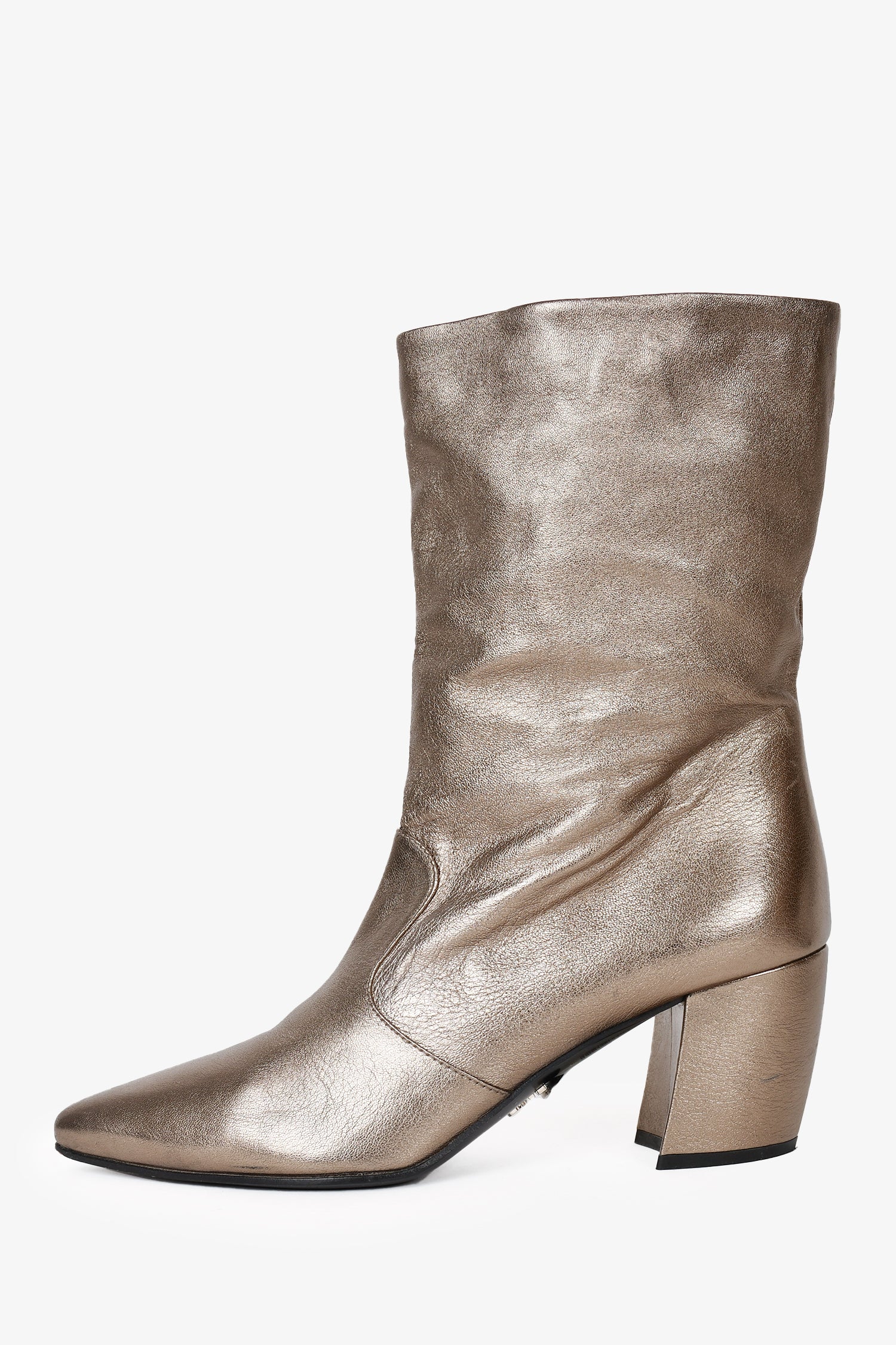 Refresh availabilityPrada Metallic Leather Pointed Ruched Heeled Boots. Pull-on. Block heel. Tonal stitching.