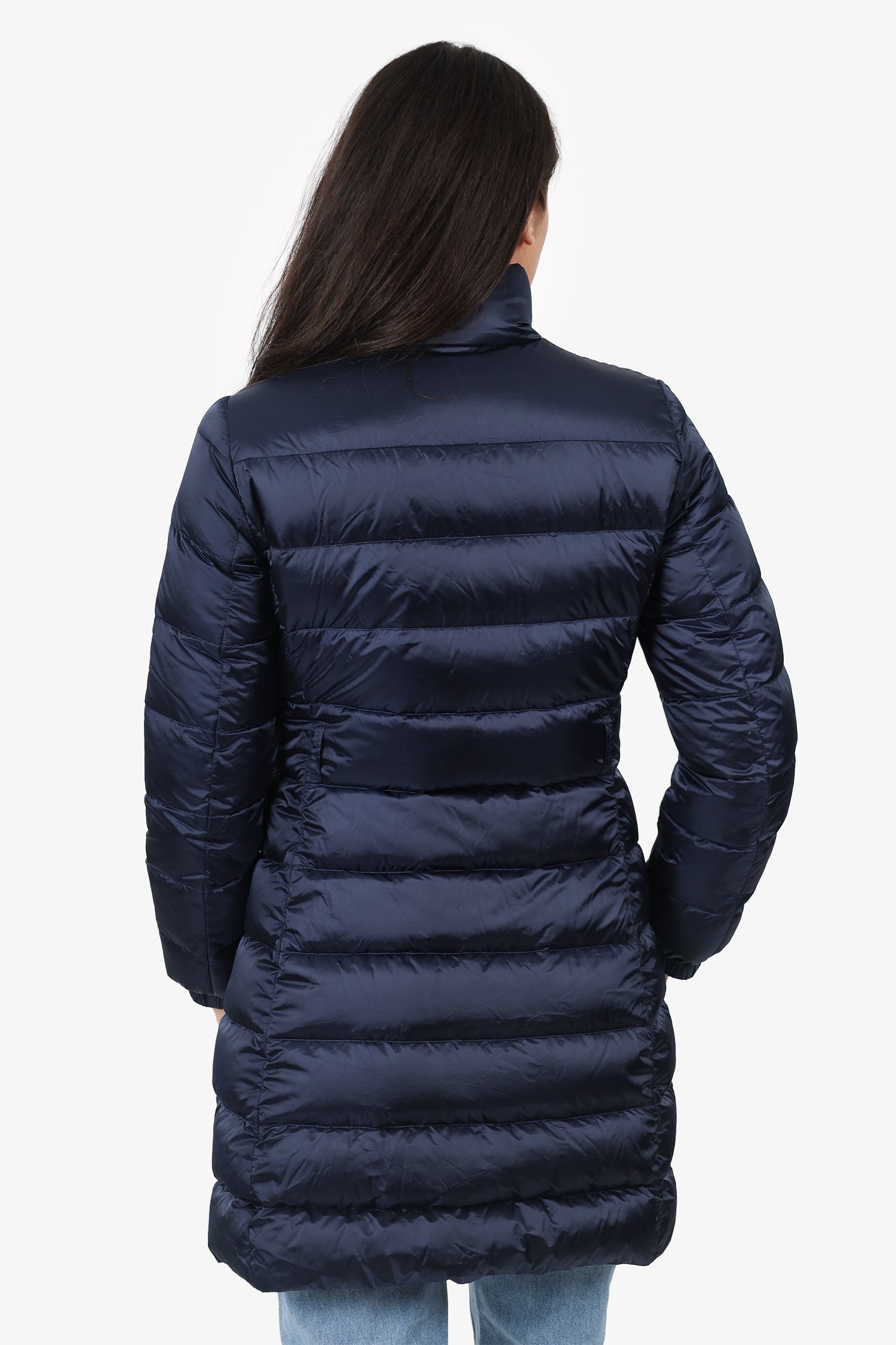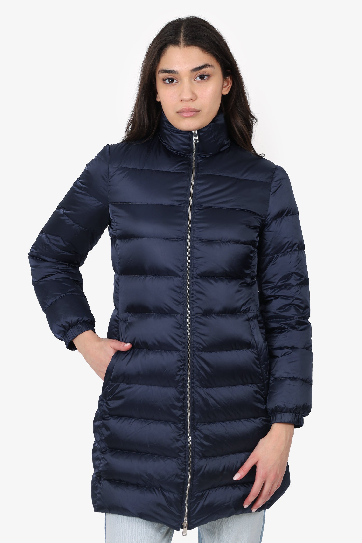 Refresh availabilityPrada Navy Down Quilted Puffer Coat. Pull-on. High neckline. Front zip closure. Elasticized sleeve cuffs. 2 exterior slip pockets. Lined interior. Silver-tone hardware. Tonal stitching.