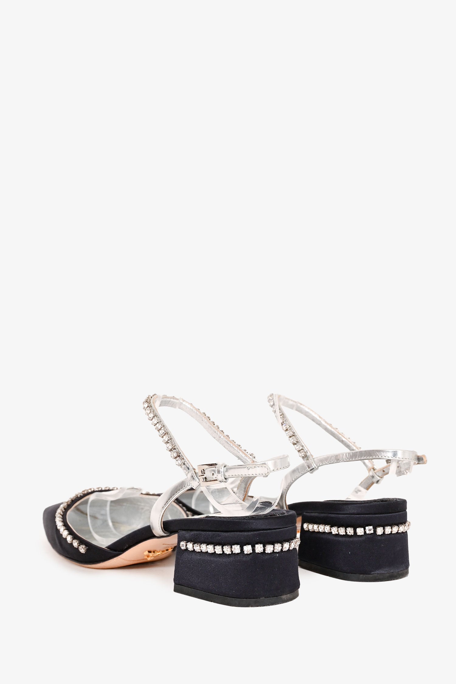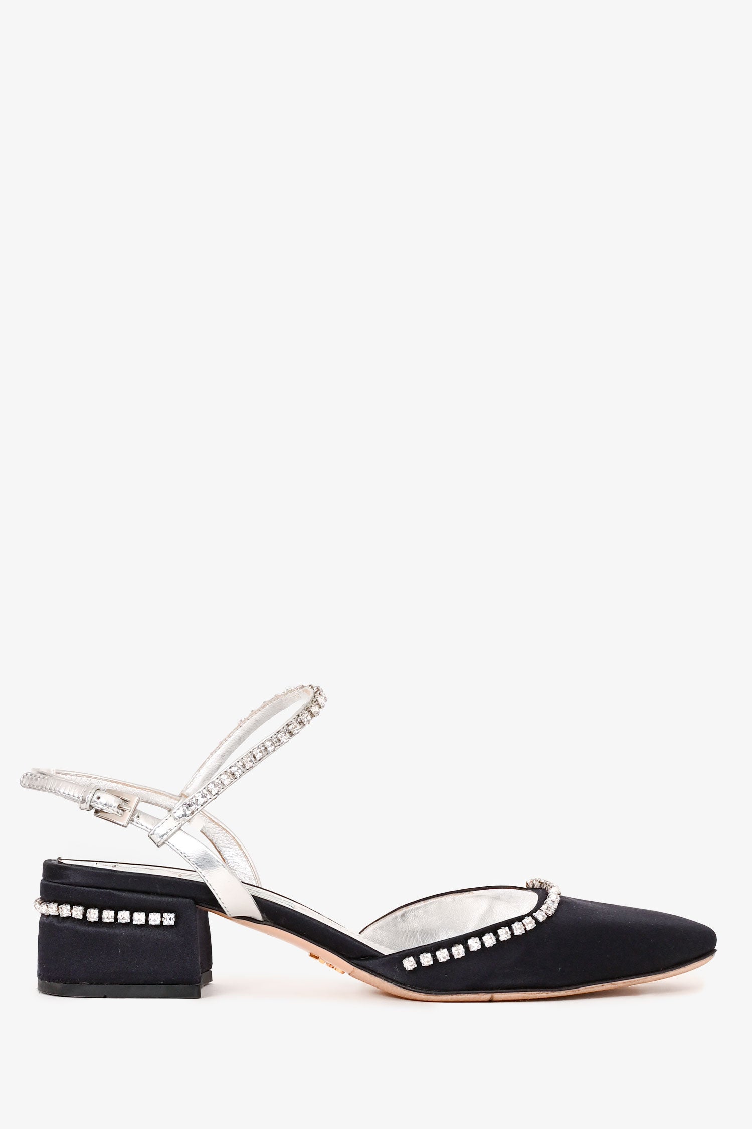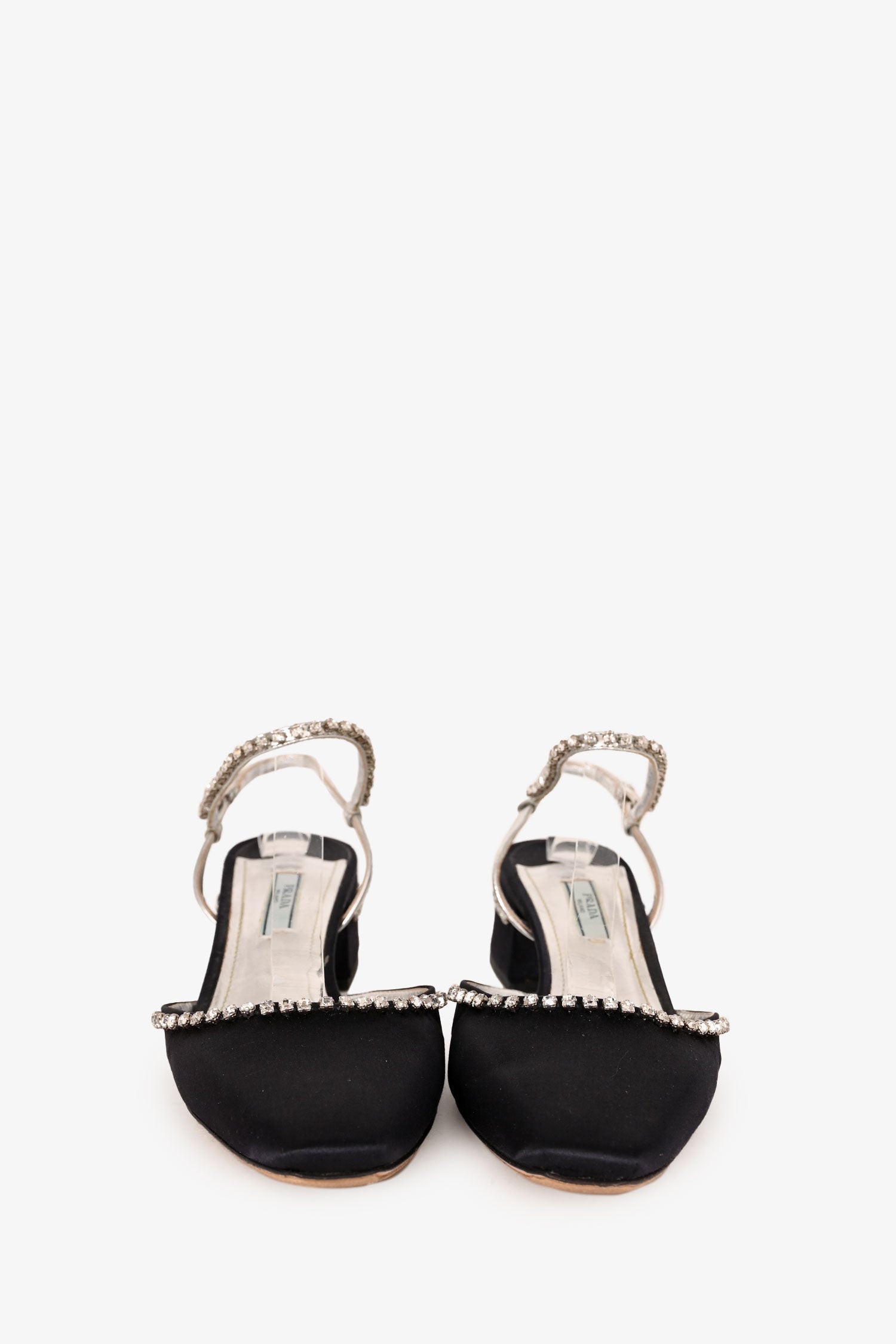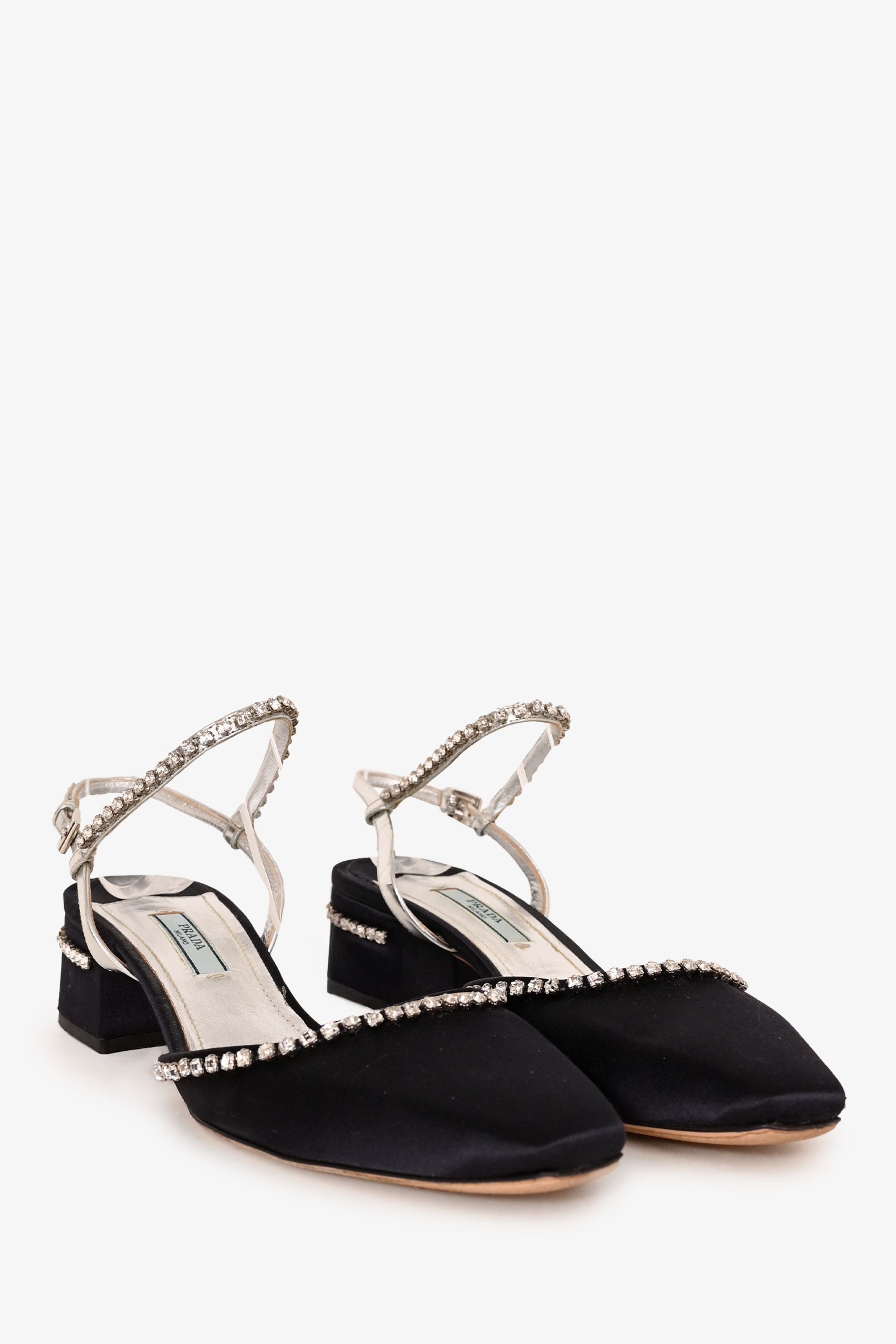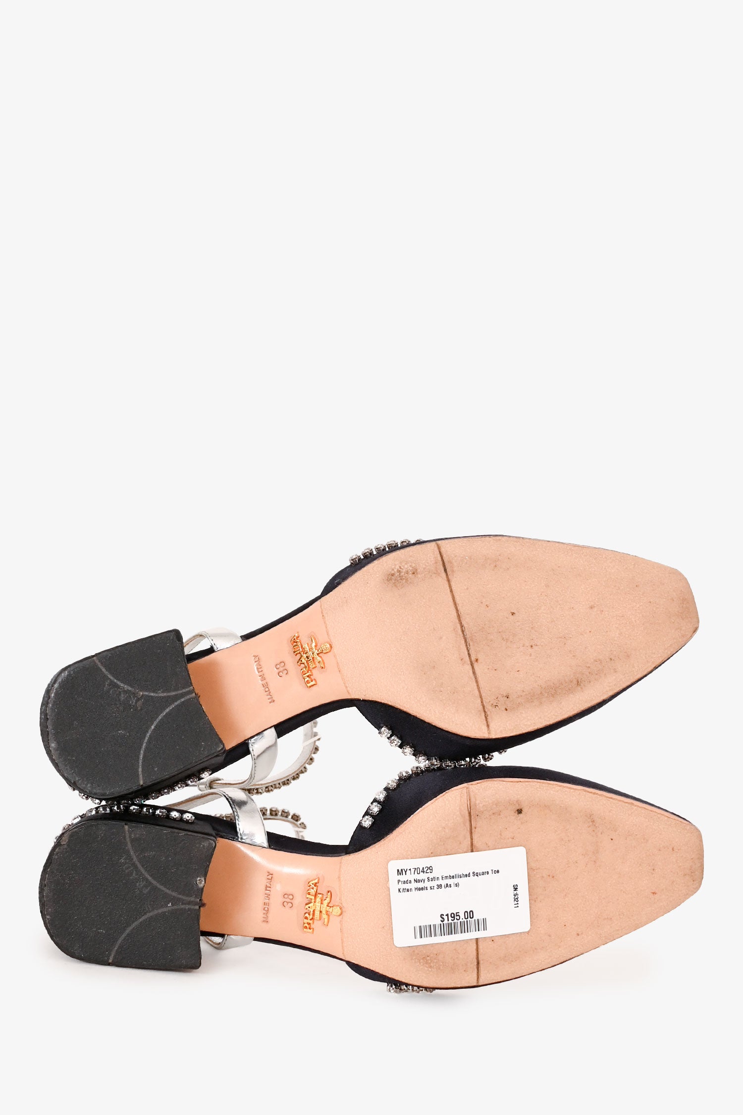 Refresh availabilityPrada Black Satin Embellished Square Toe Kitten Heels. Slip-on. Ankle strap with buckle closure. Block heel.
