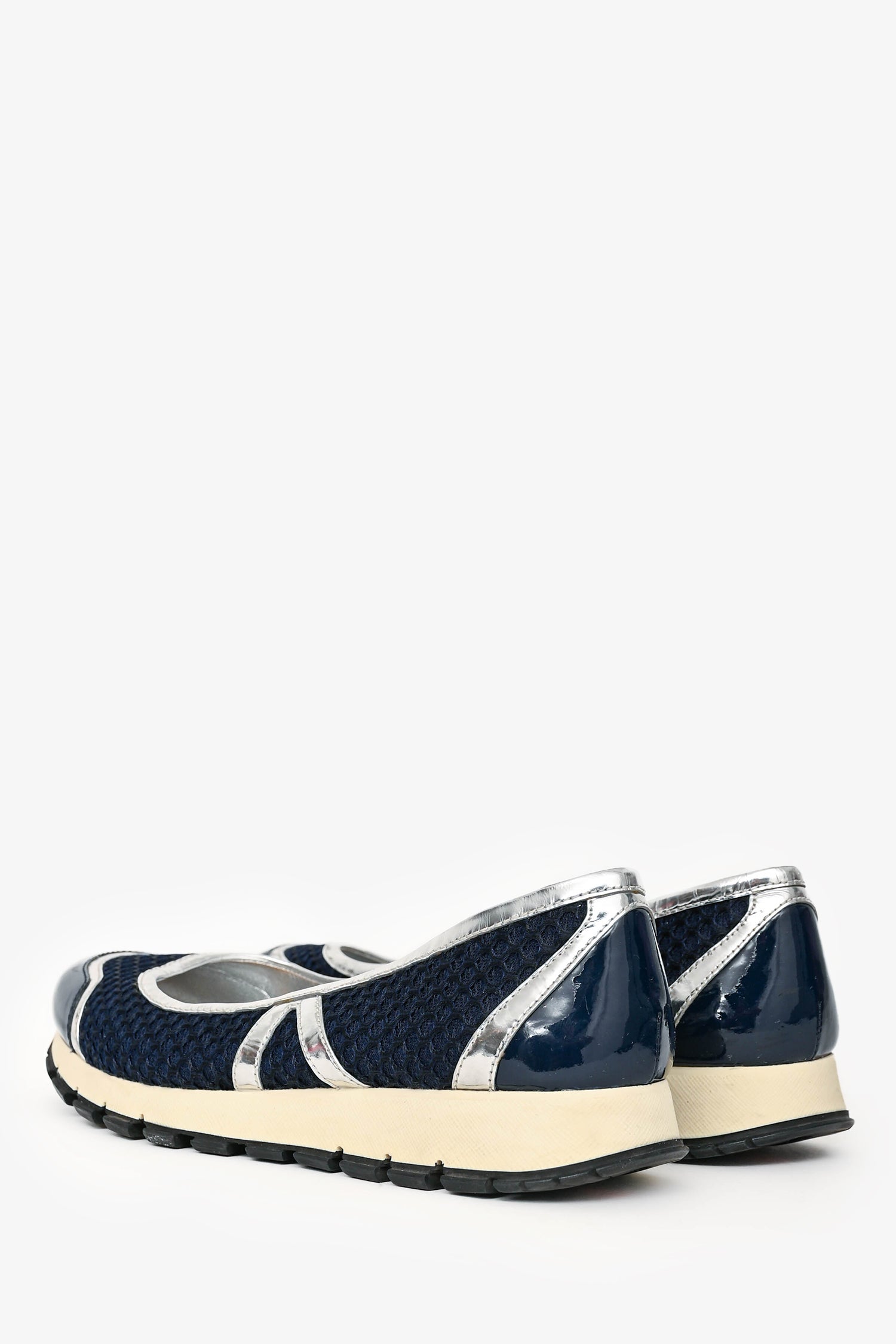 Refresh availabilityPrada Navy/Silver Metallic Leather Sneaker Pumps. Rounded toe. Metallic insole. Navy-tone mesh exterior. Metallic trimming. Tonal stitching.