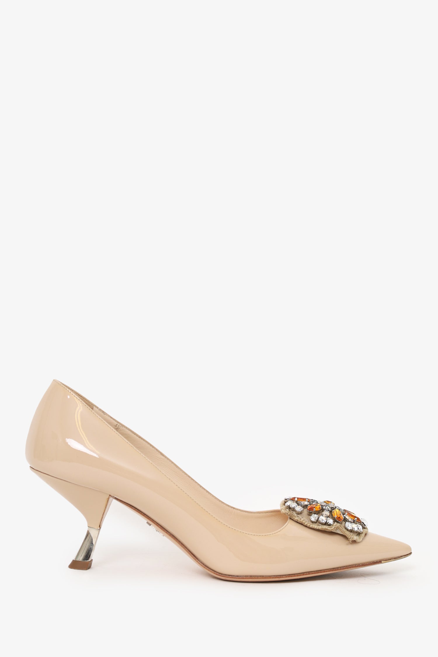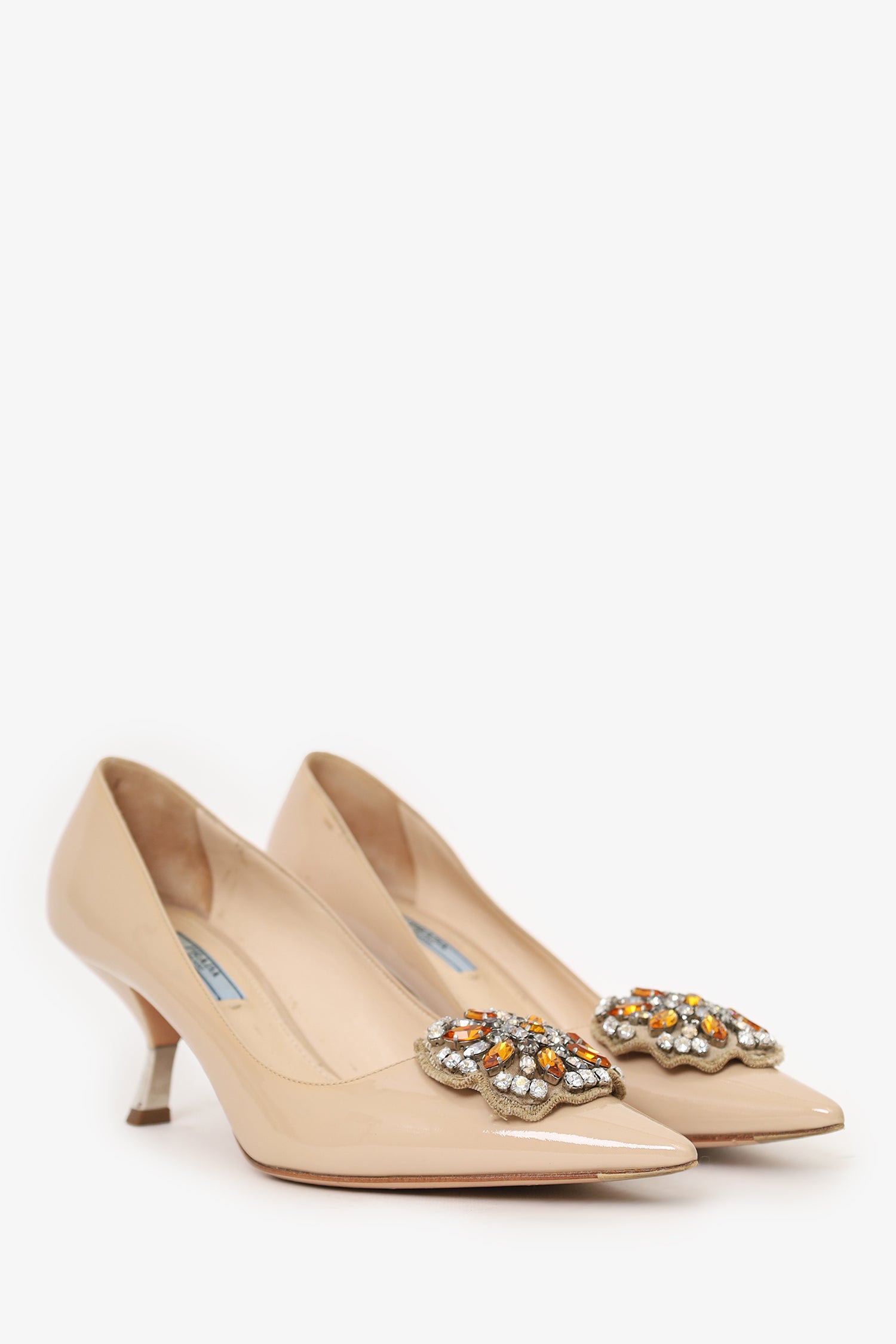 Refresh availabilityPrada Nude Patent Leather Crystal Embellishments Pumps. Slip-on. Pointed toe. Glossy finish. Silver-tone hardware. Tonal stitching.