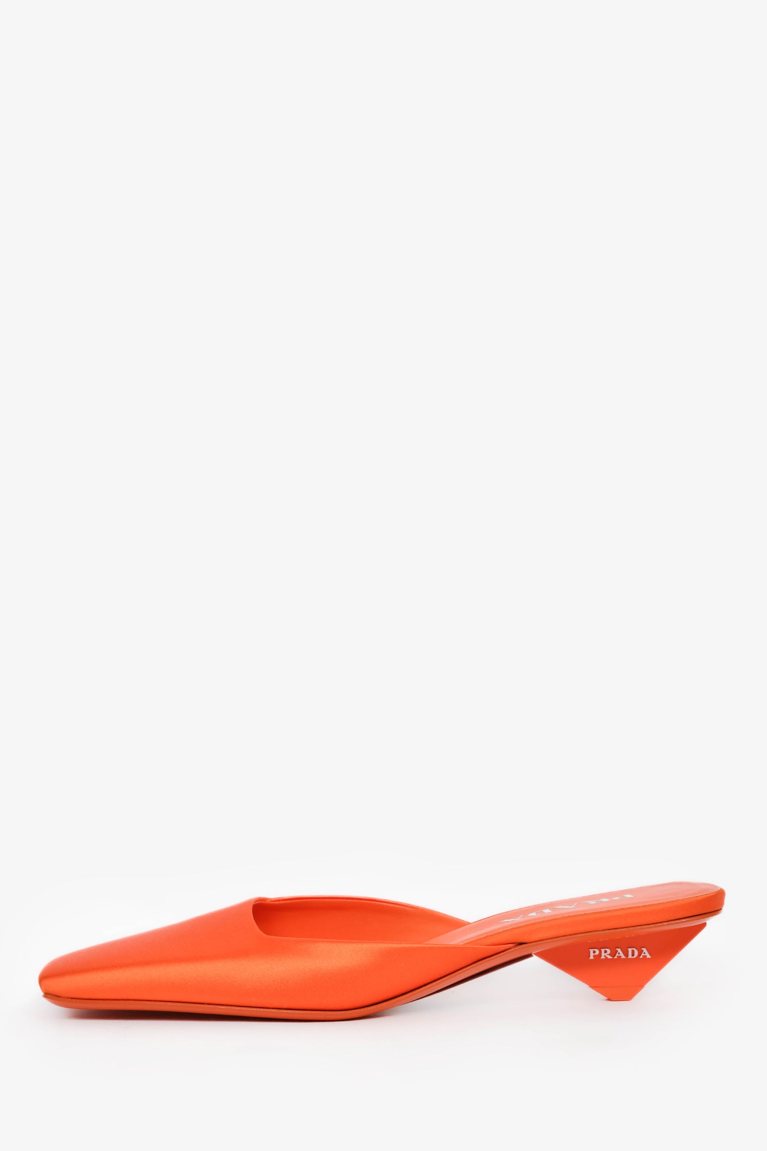 Refresh availabilityPrada Orange Satin Square Toe Mules. Tapered square toe. Tonal stitching.