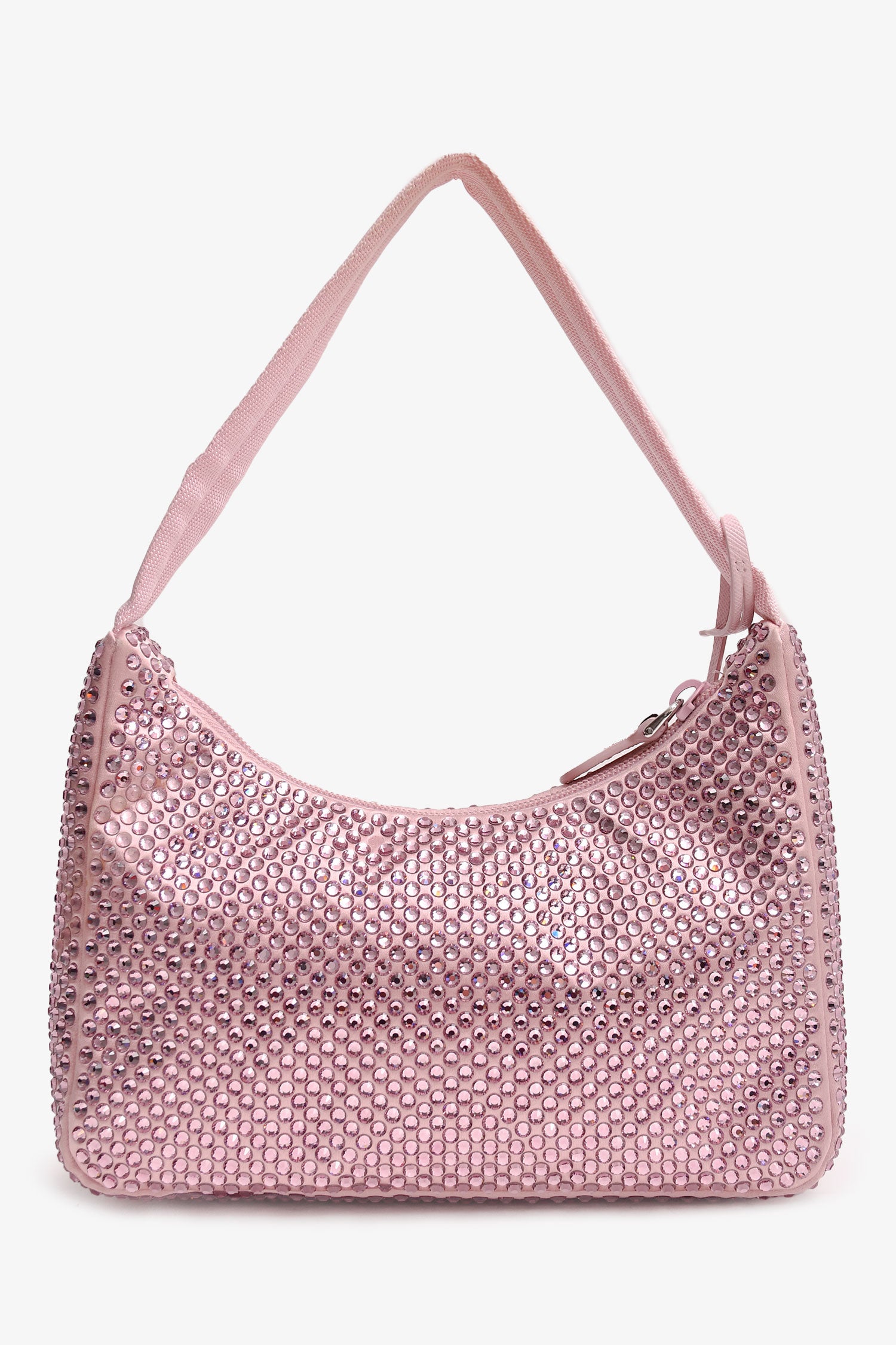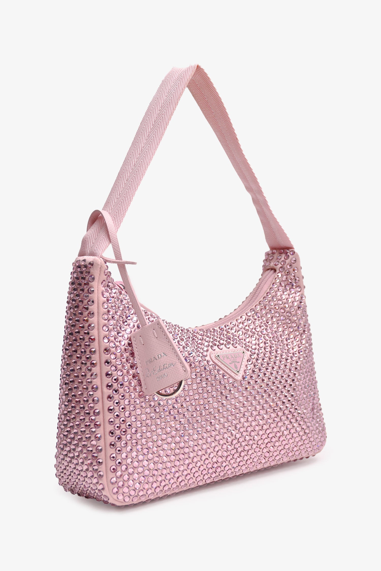 Refresh availabilityPrada Pink Satin Crystal Embellish Re-Edition 2000 Shoulder Bag. Top zip closure. Tonal textile interior lining. Open interior. Detachable clochette. Silver-tone hardware.