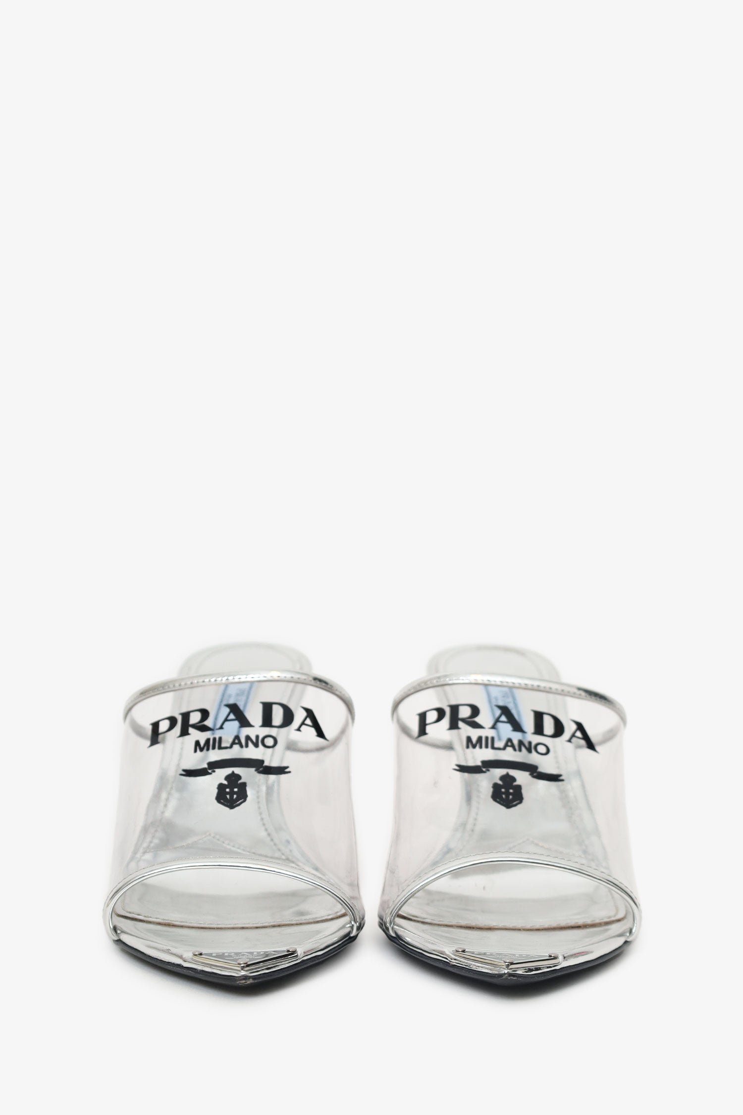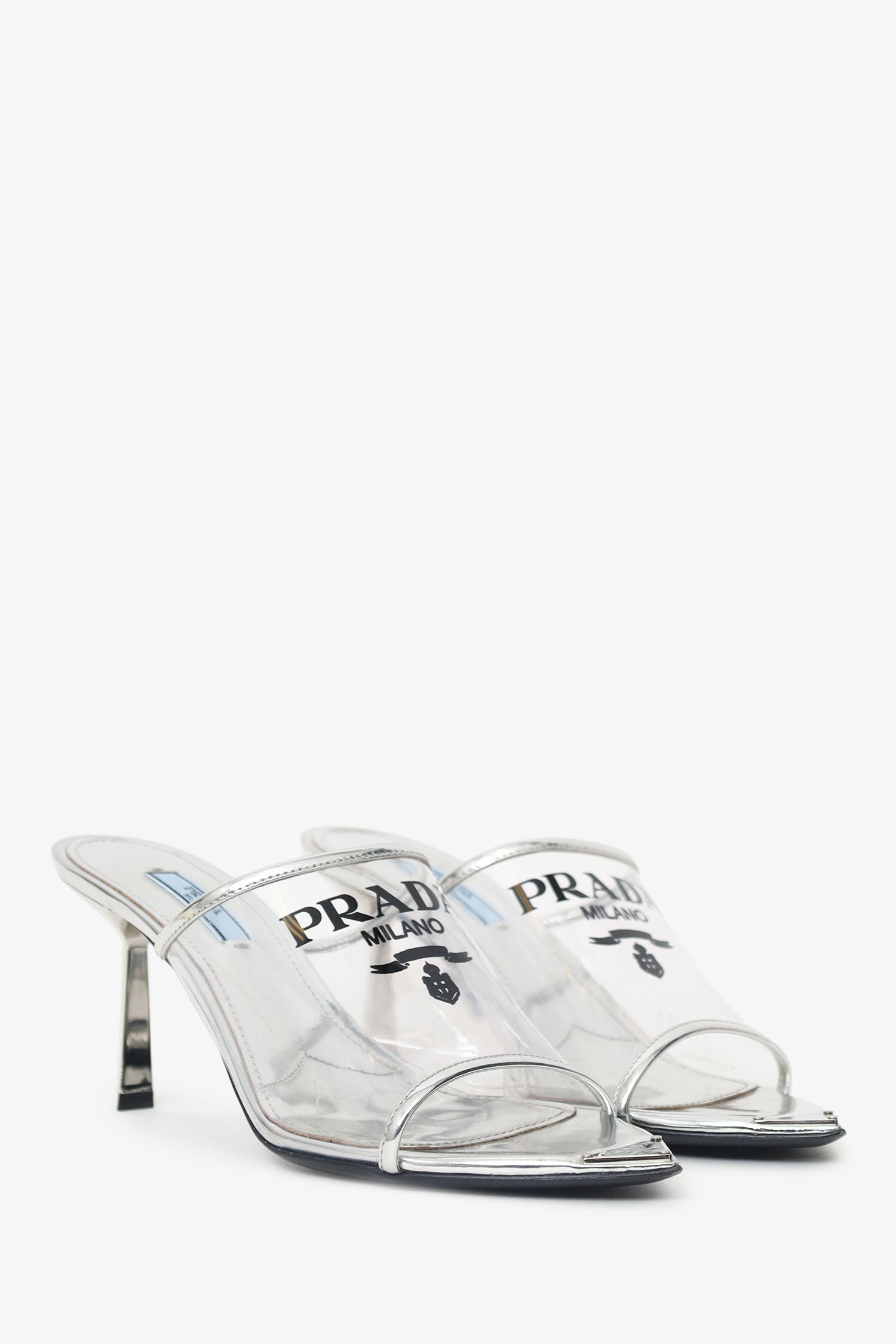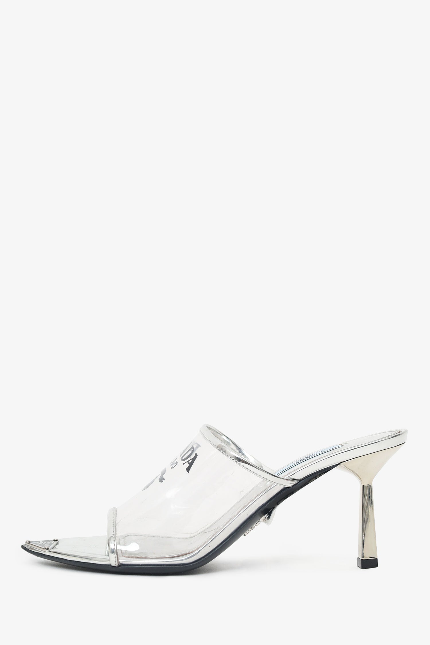 Refresh availabilityPrada Silver Vinyl Logo Mules. Slip-on. Open and pointed toe. Logo detail to toe box and vamp. Lined interior. Silver-tone hardware. Tonal stitching.