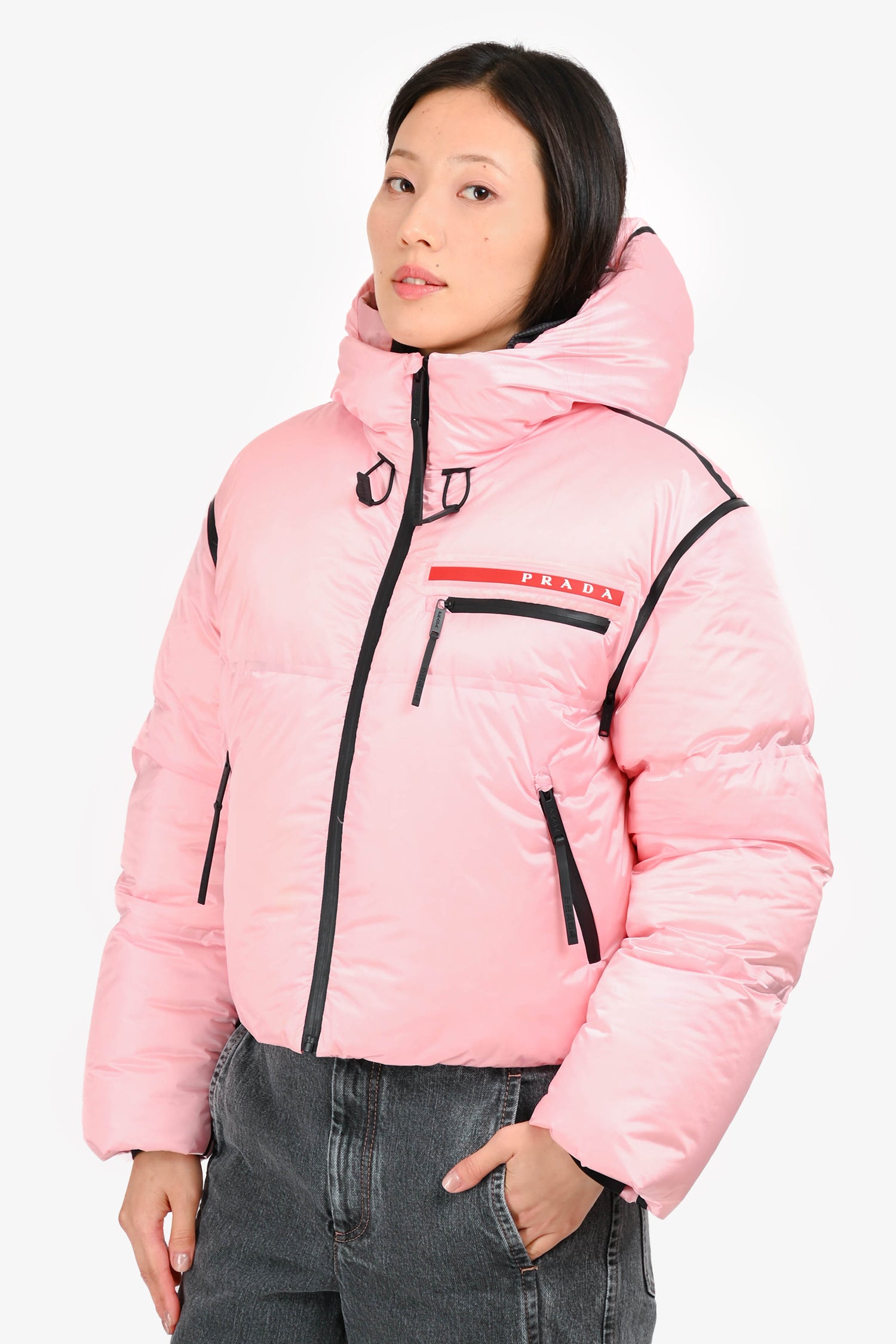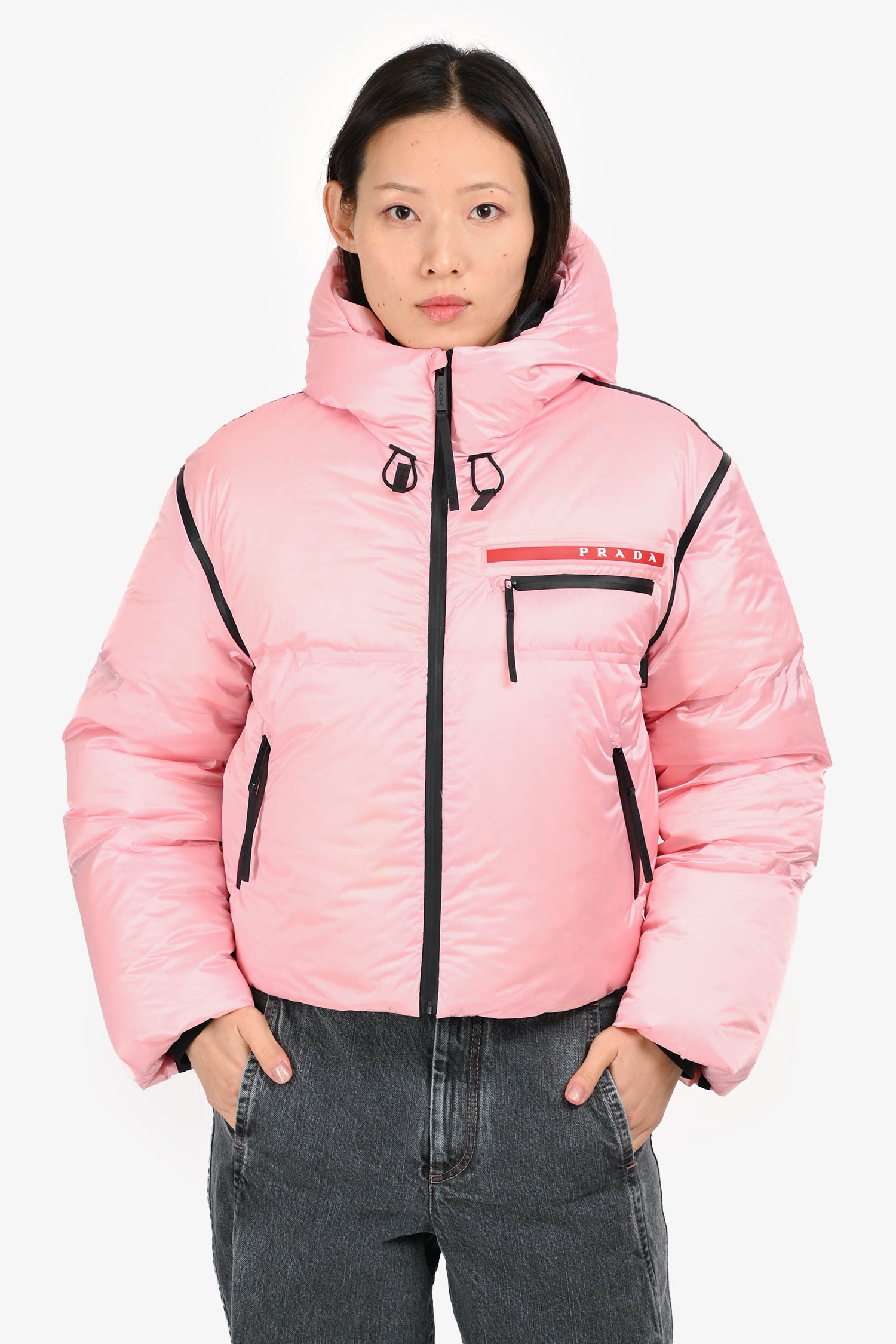 Refresh availabilityPrada Sport 2021 Pink Re-Nylon Cropped Puffer Jacket. Front zipper closure. Adjustable drawstring hood. 3 front pockets with zipper closures. Detachable sleeves. 2 interior pockets with zipper closures. Adjustable drawstring hem. Tonal stitching.