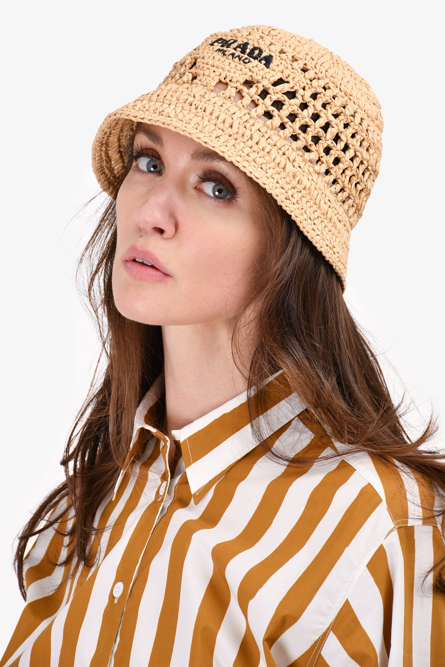 Refresh availabilityPrada Tan Crochet Logo Bucket Hat. Unlined.