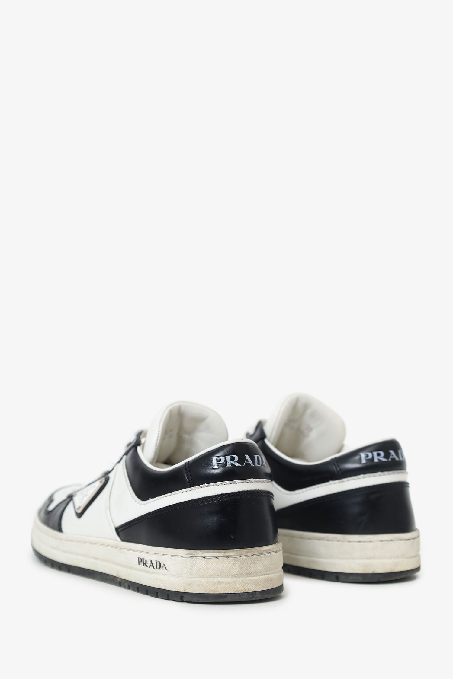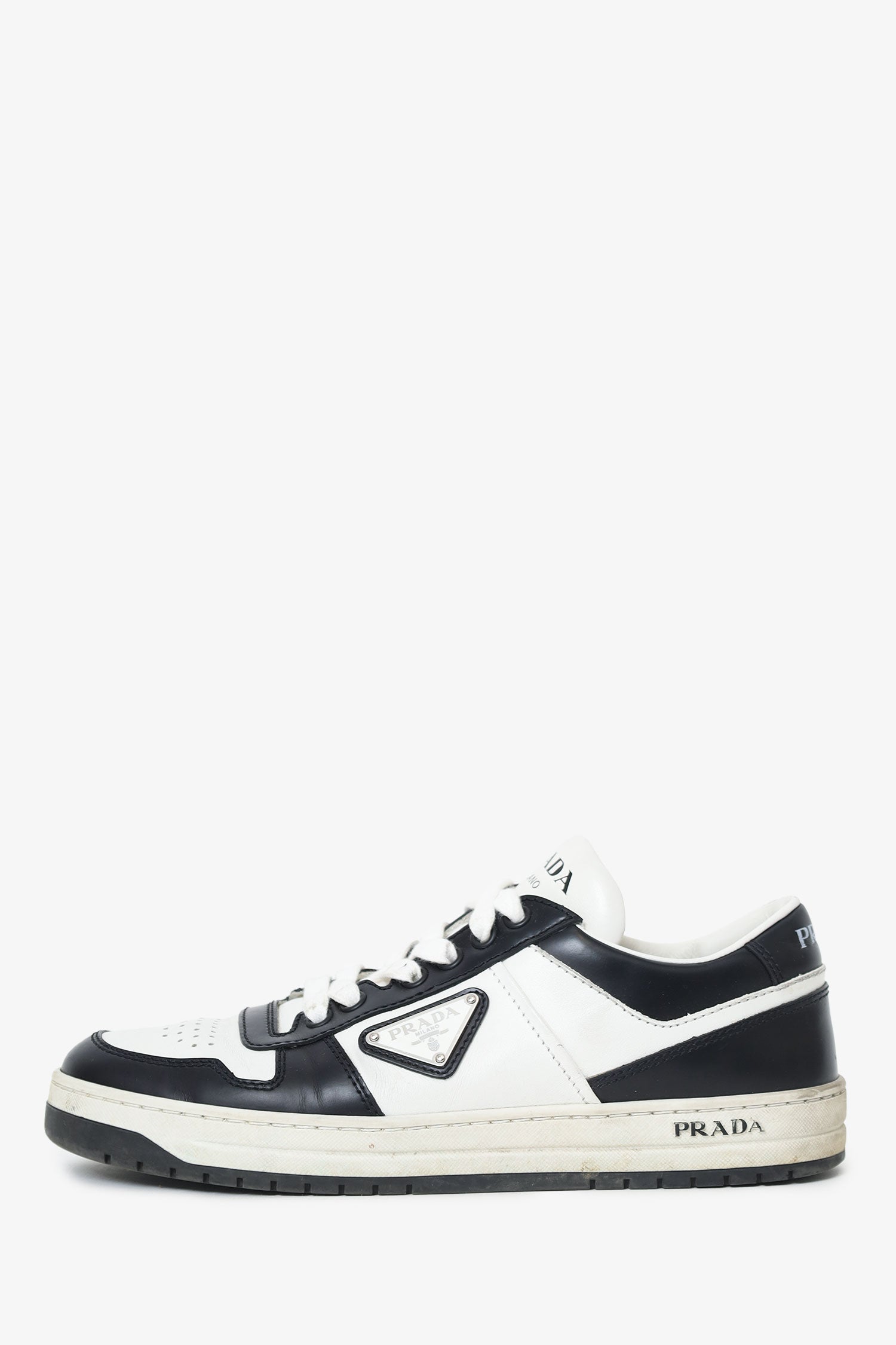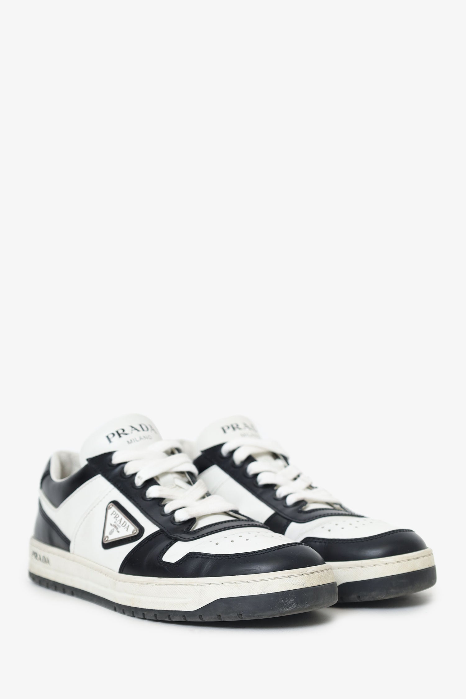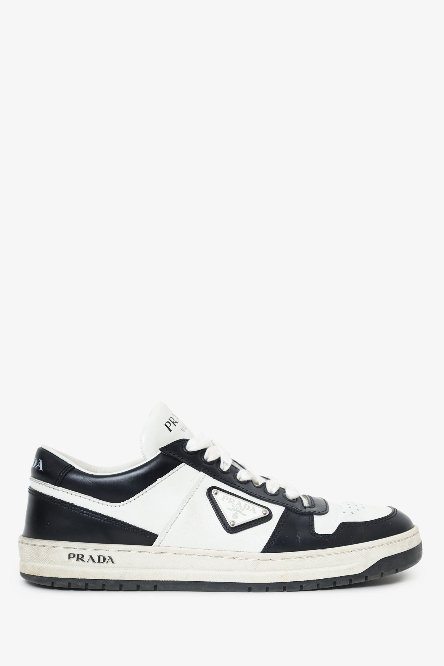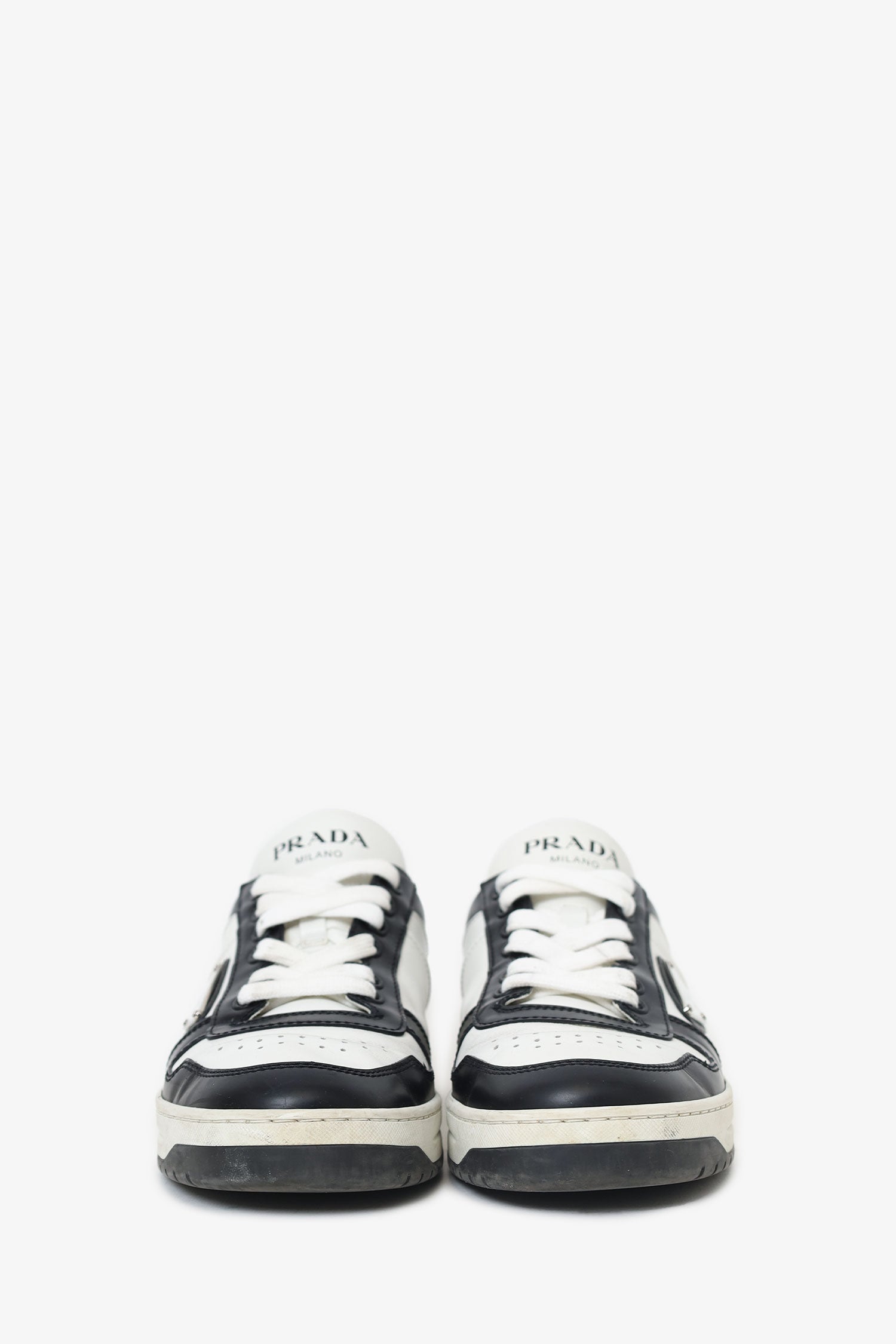 Refresh availabilityPrada White/Black Leather Low Top Sneakers. Slip-on. Round toe. Front lace-up closure. Padded tongue. Silver-tone hardware. Tonal stitching.