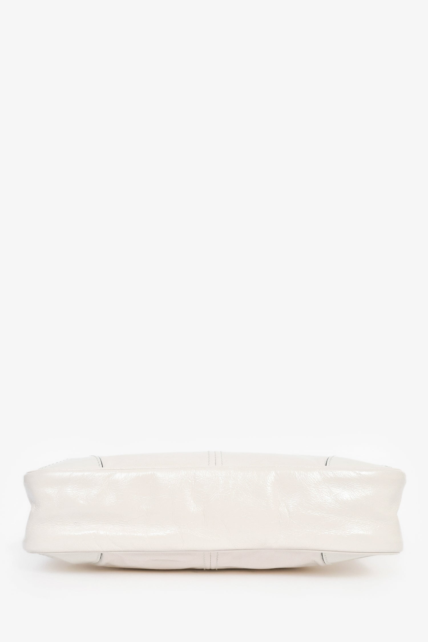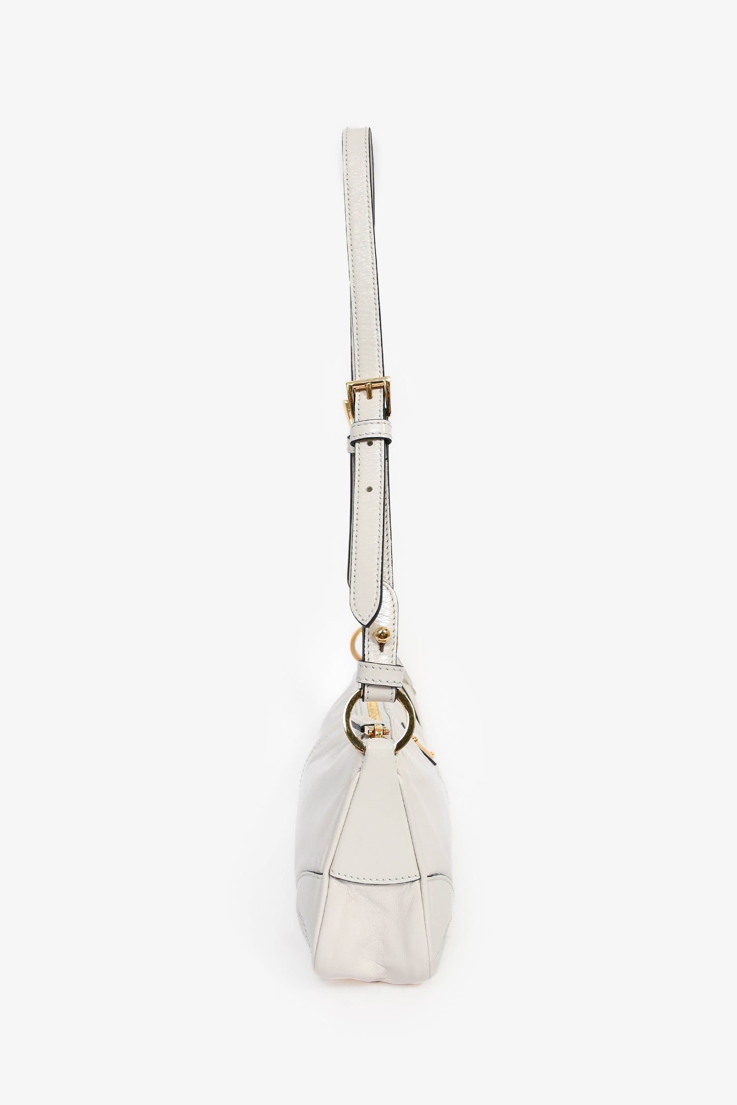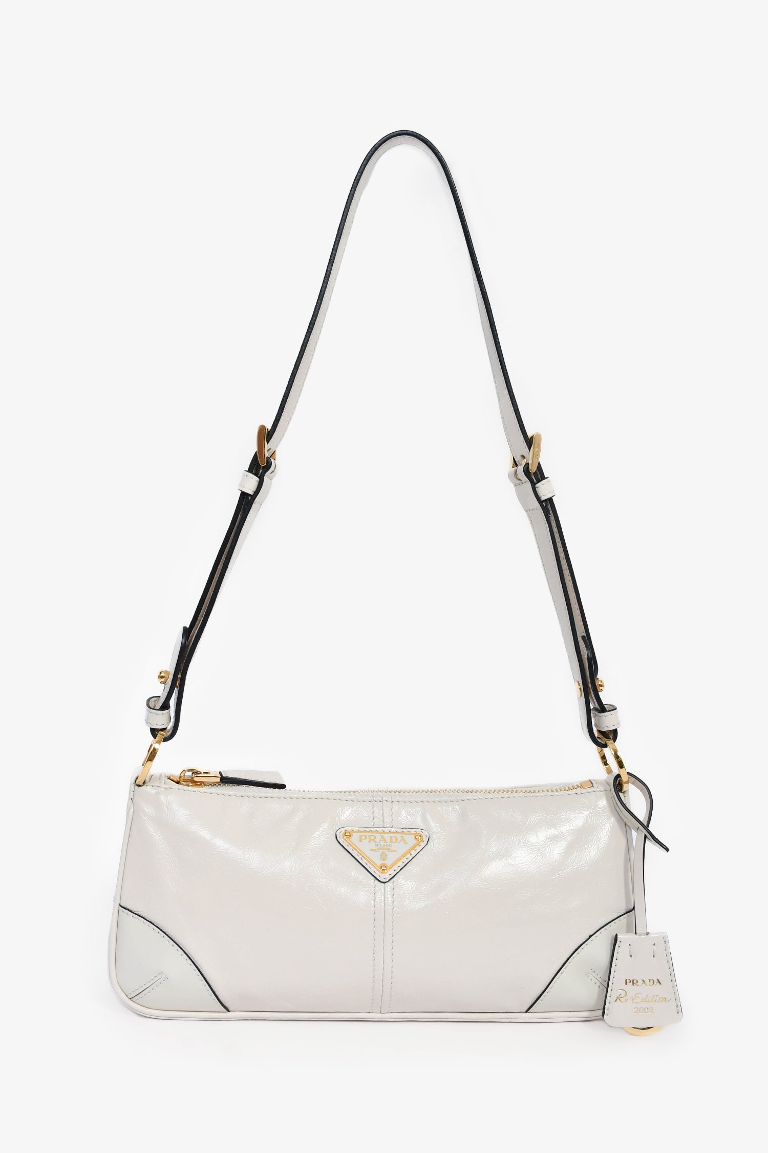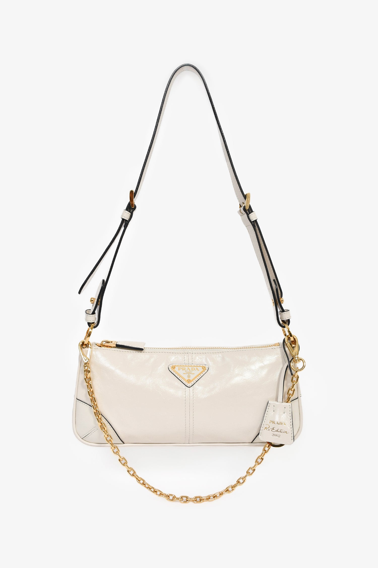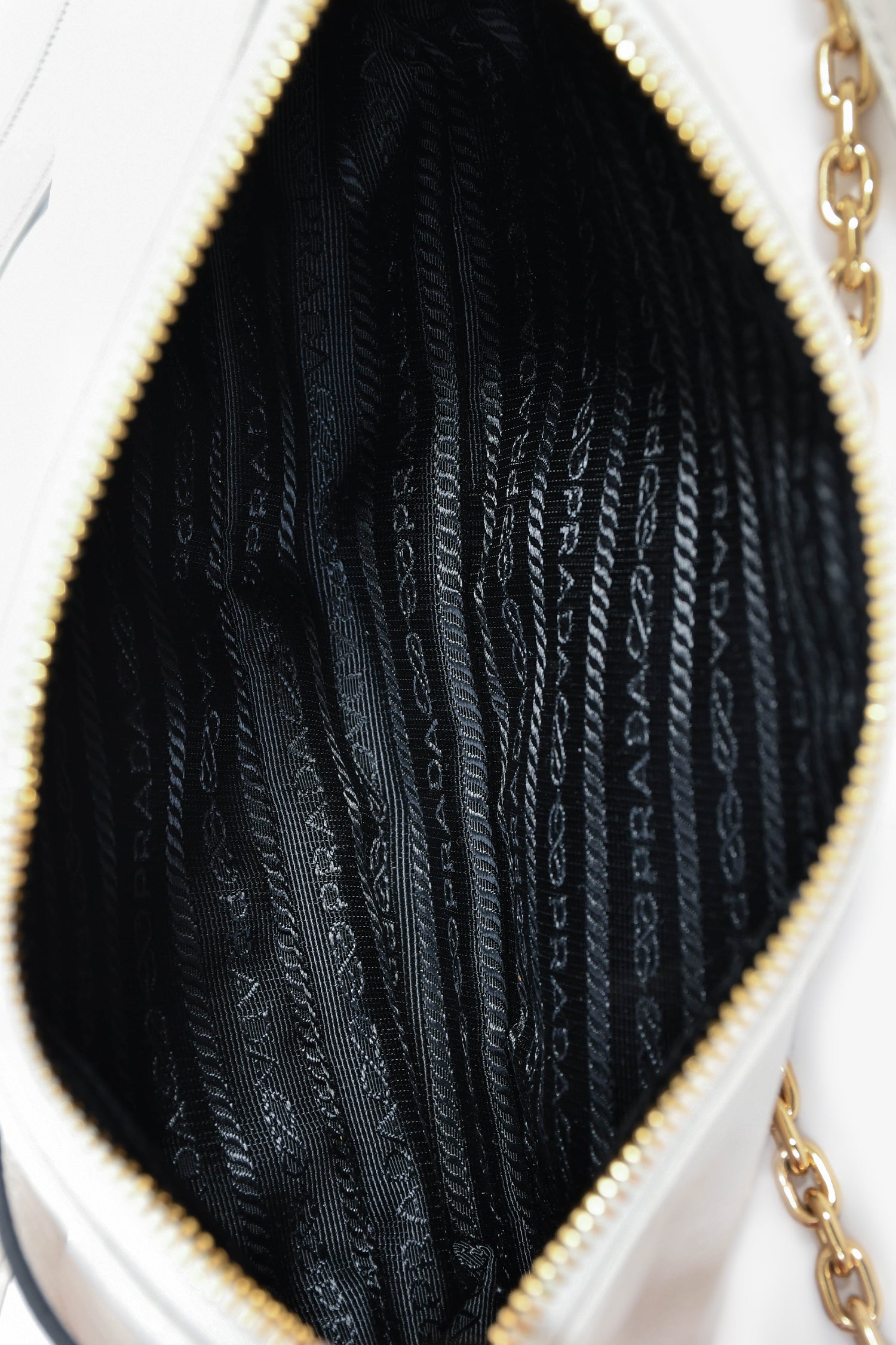Refresh availabilityPrada White Leather 'Re-Edition 2002' Medium Shoulder Bag With Chain. Top zip closure. Interchangeable straps; 1 chain-link (non-adjustable), 1 leather (adjustable). Textile-lined interior. Detachable clochette. Gold-tone hardware. Tonal stitching.