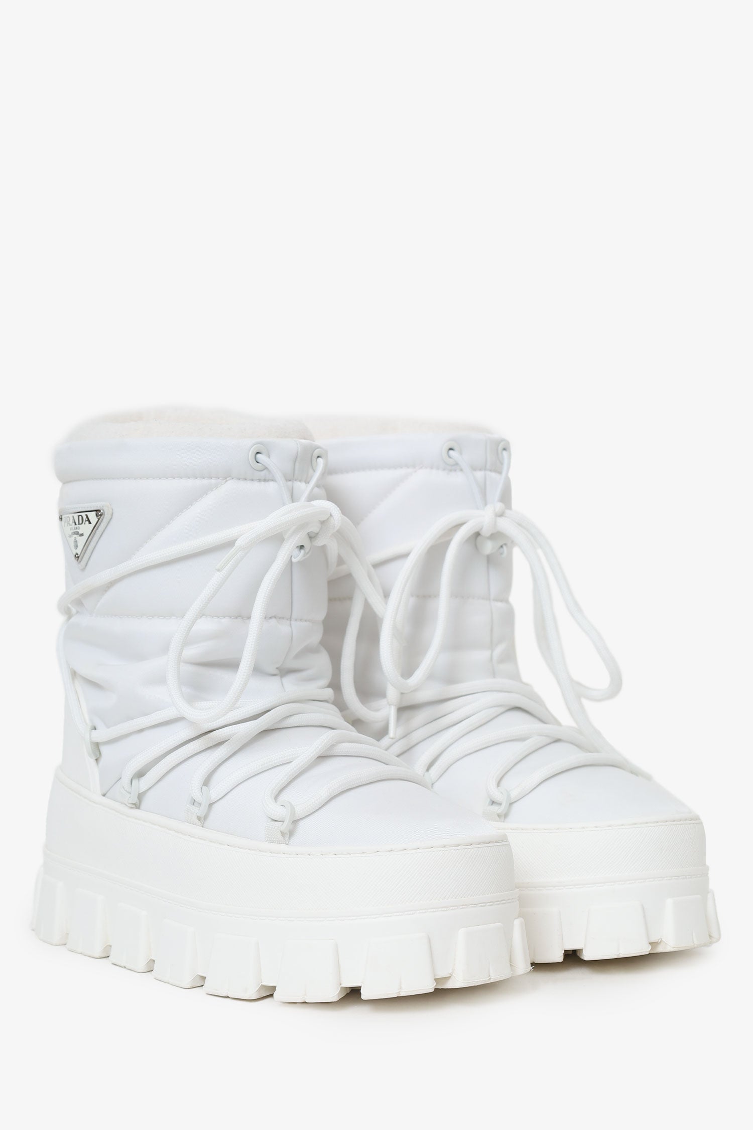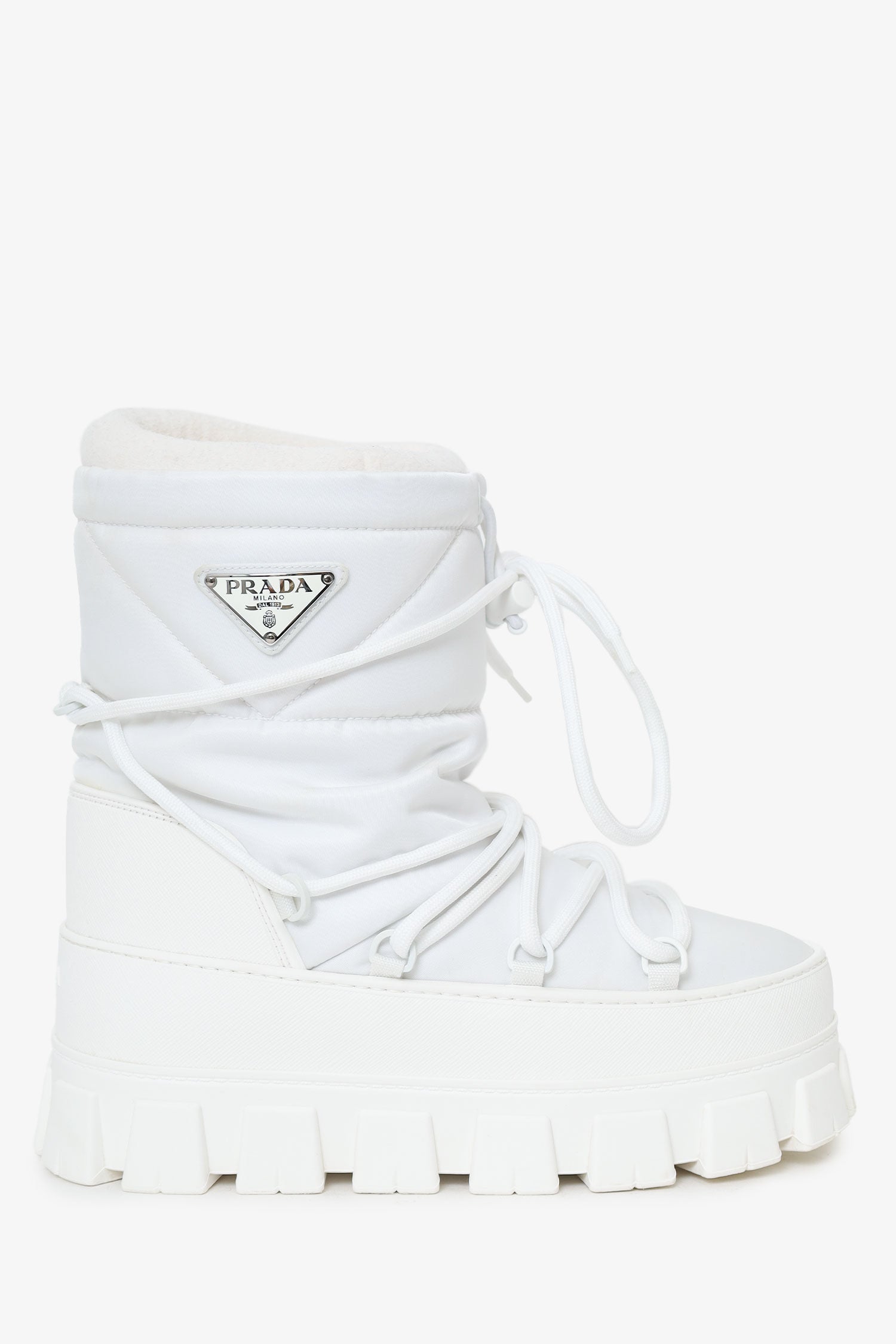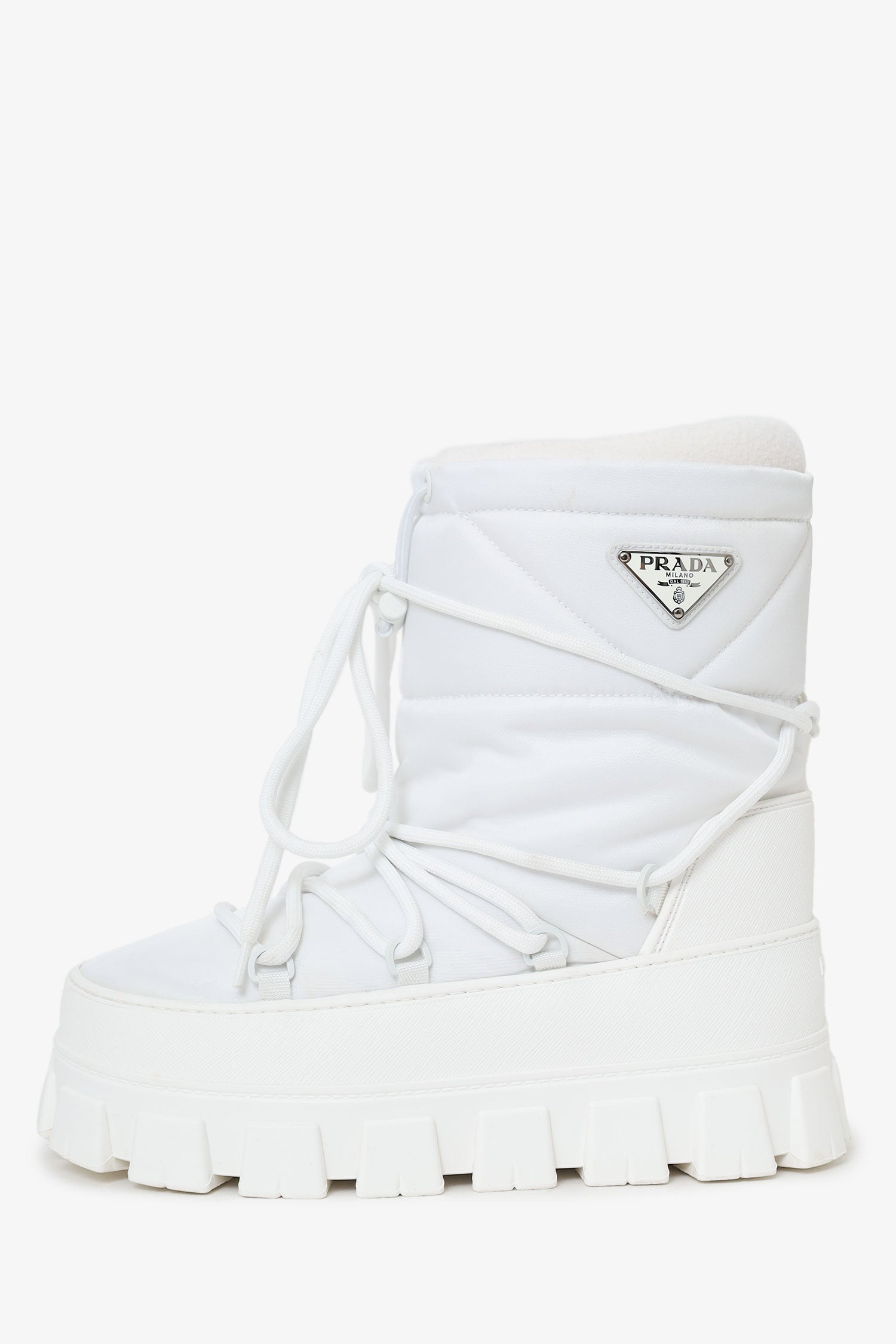 Refresh availabilityPrada White Nylon Moon Boots. Pull-on. Round toe. Front lace-up closure. Silver-tone hardware. Tonal stitching.