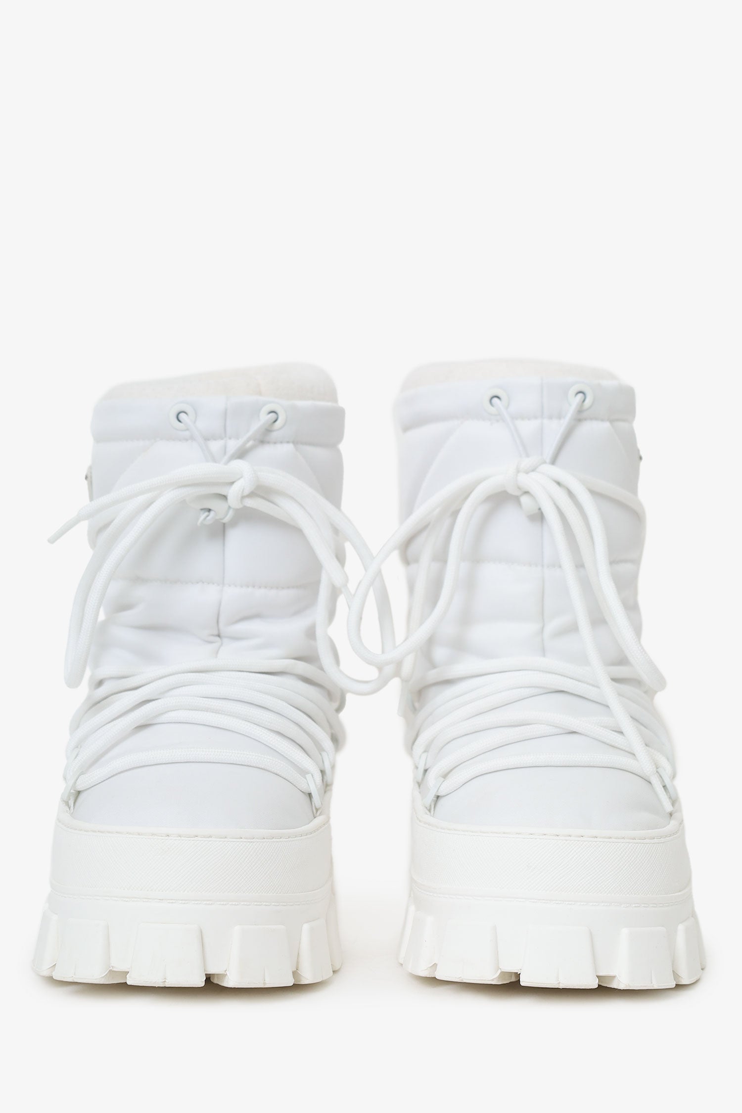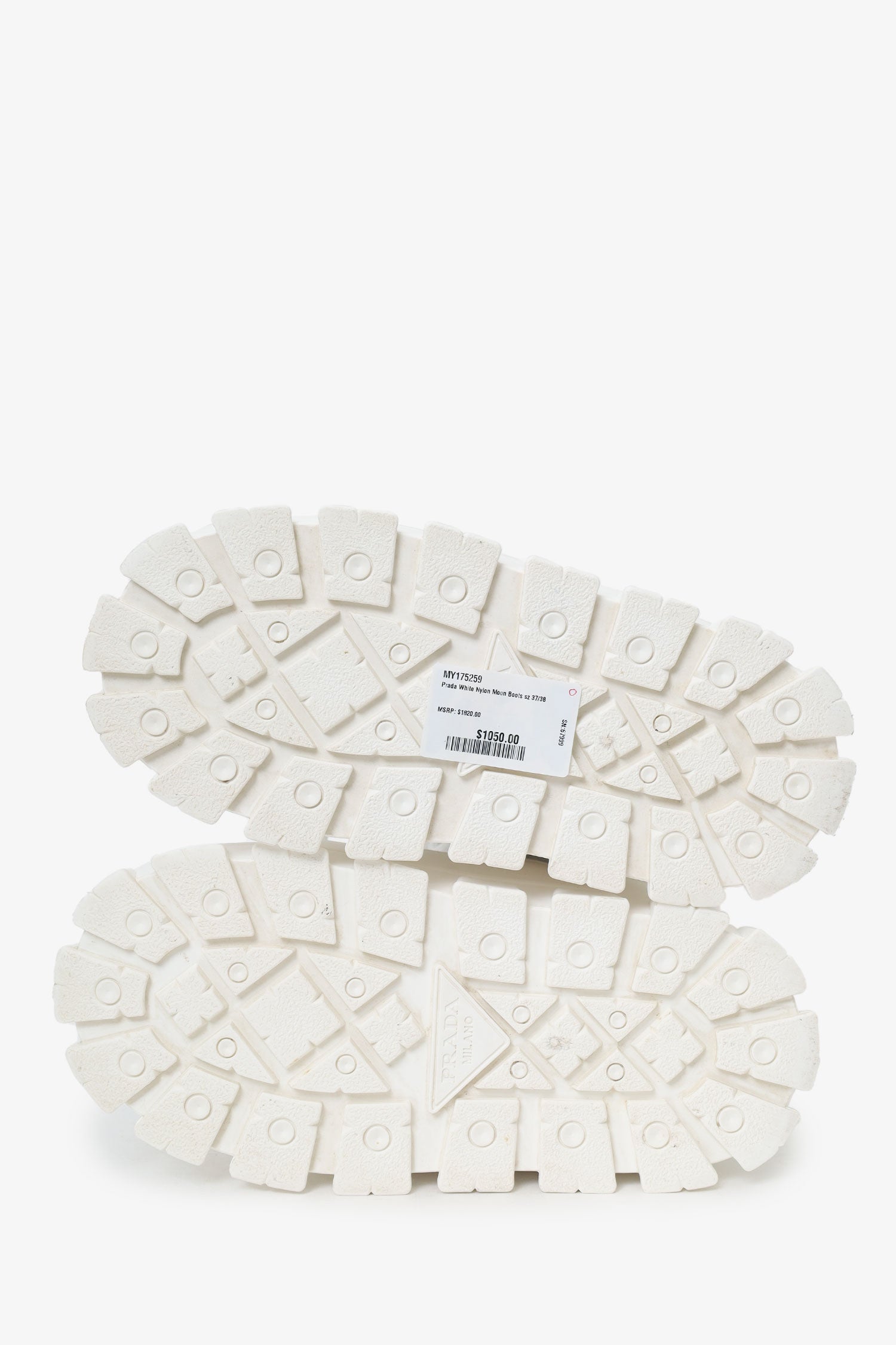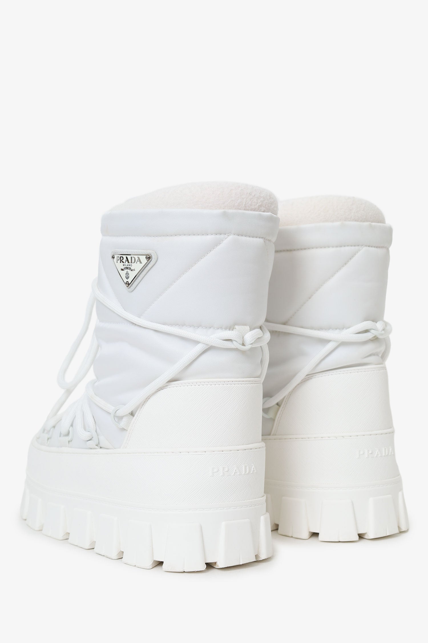 Refresh availabilityPrada White Nylon Moon Boots. Pull-on. Round toe. Front lace-up closure. Silver-tone hardware. Tonal stitching.