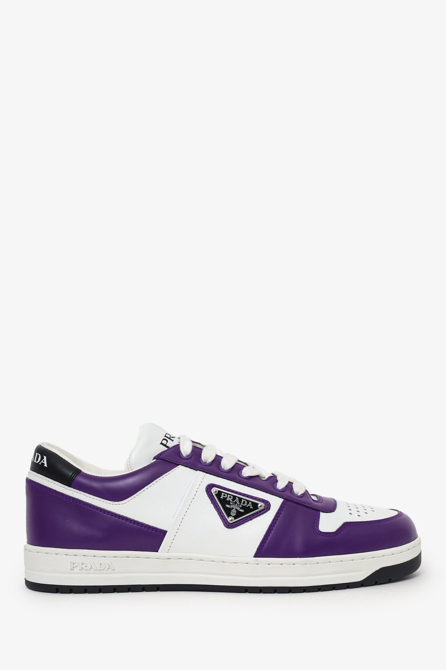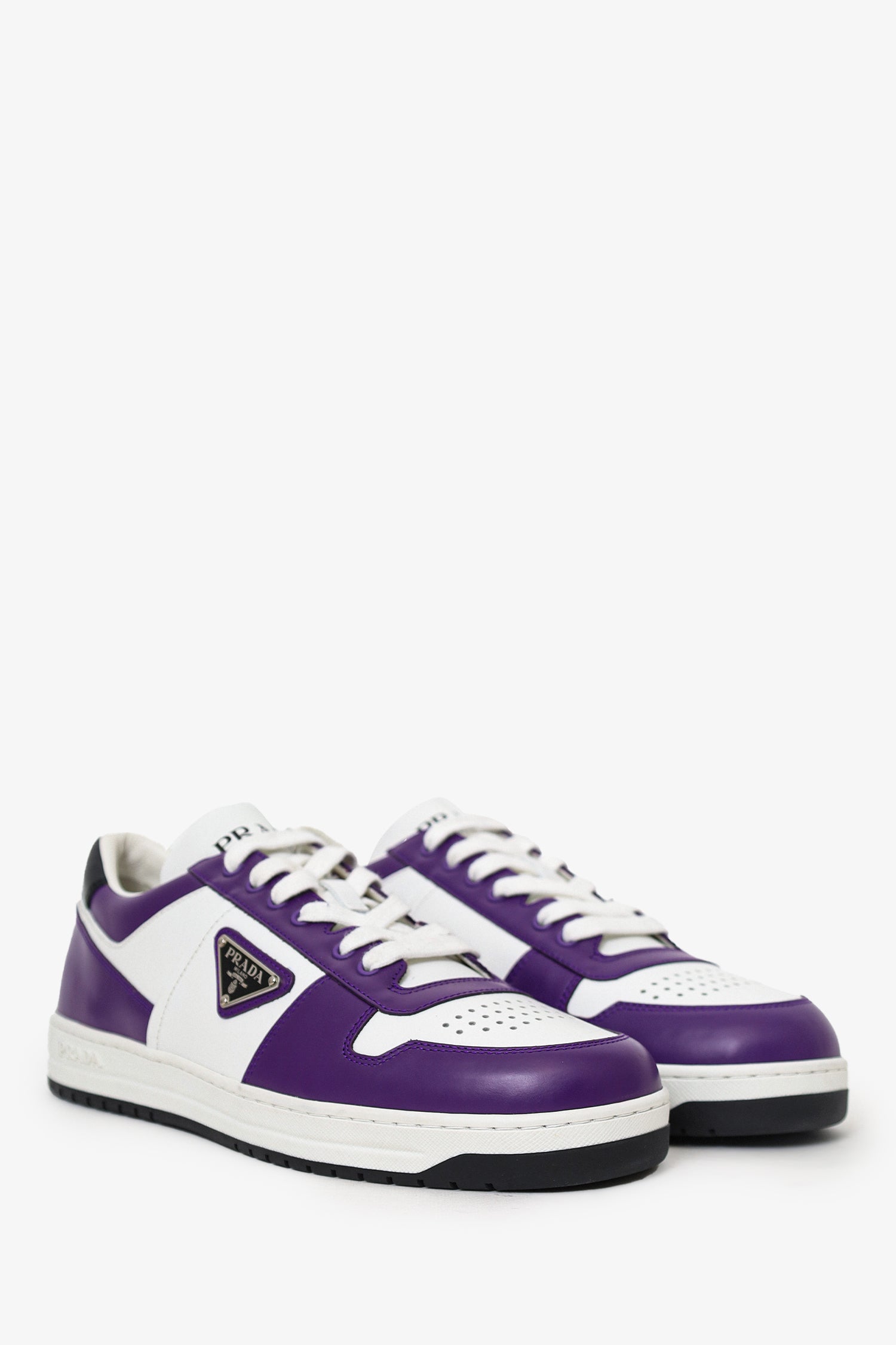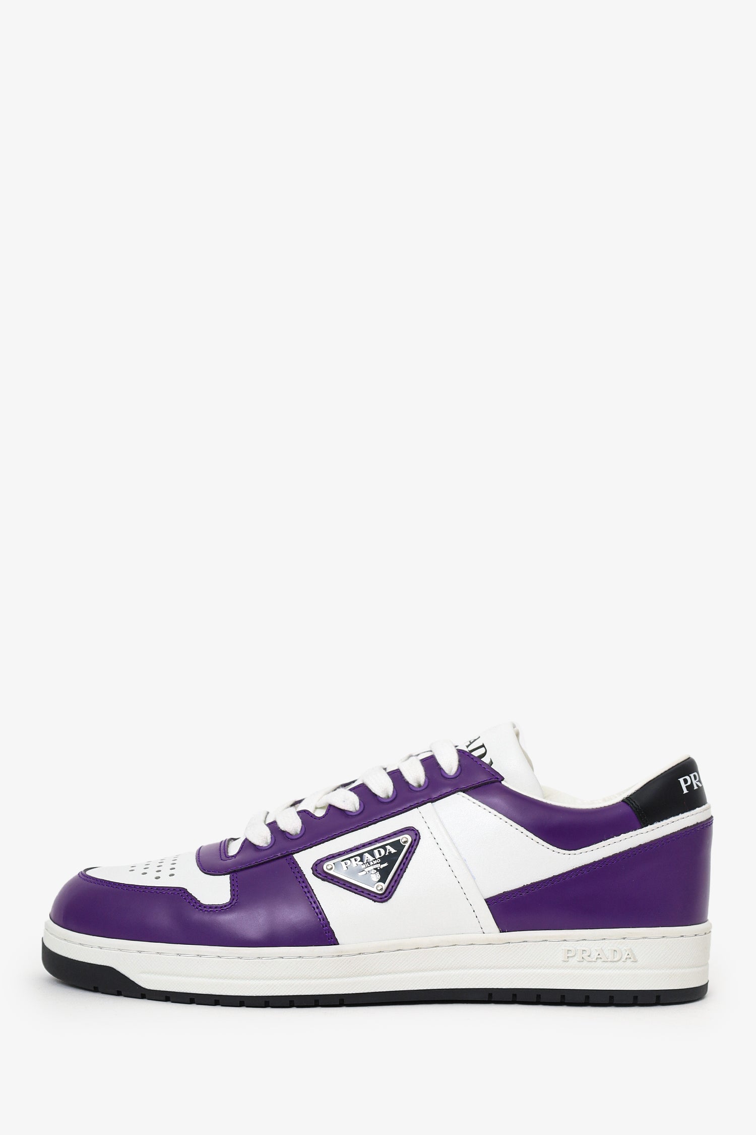 Refresh availabilityPrada White/Purple Leather Downtown Sneaker. Pull-on. Round toe. Top lace-up closure. Silver-tone hardware. Tonal stitching.