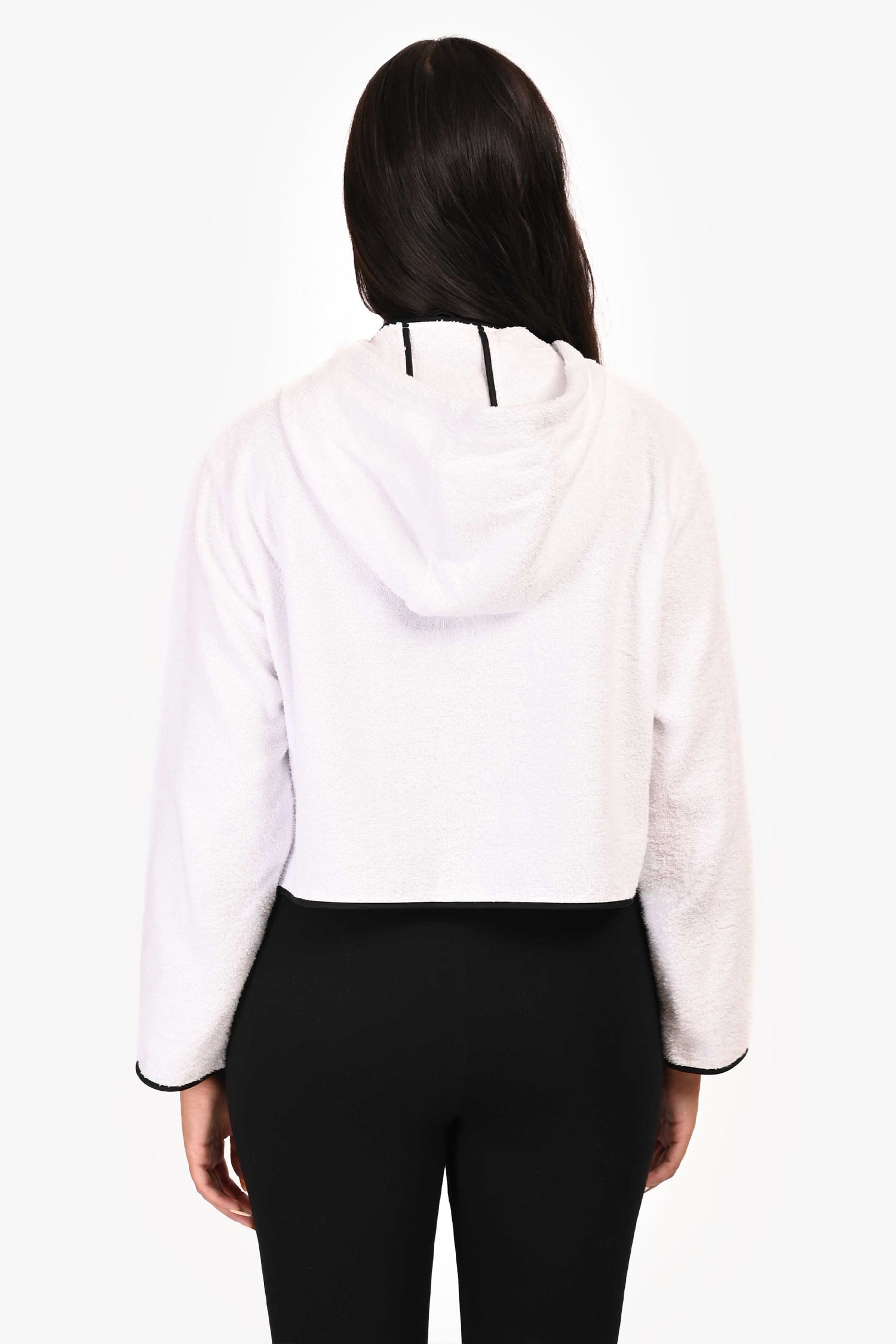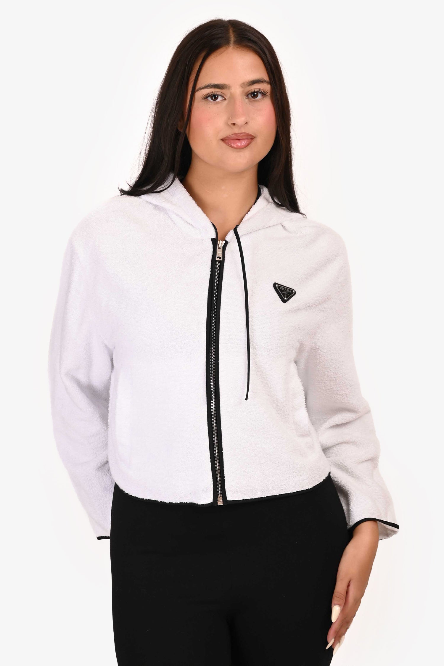 Refresh availabilityPrada White Terry Cloth Triangle Logo Zip-Up Sweater. Front zip closure. Front pockets.