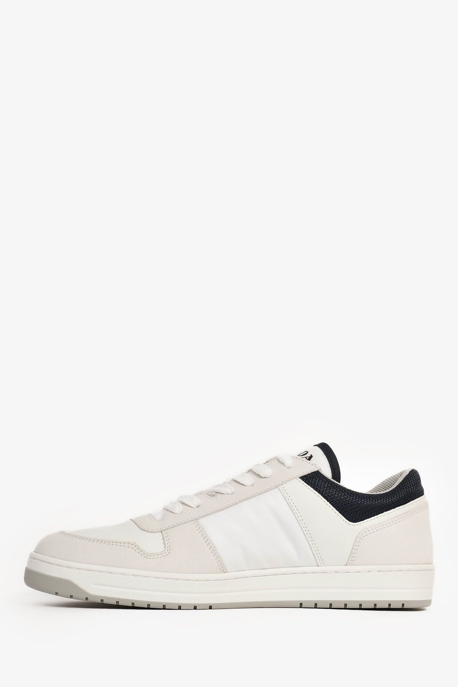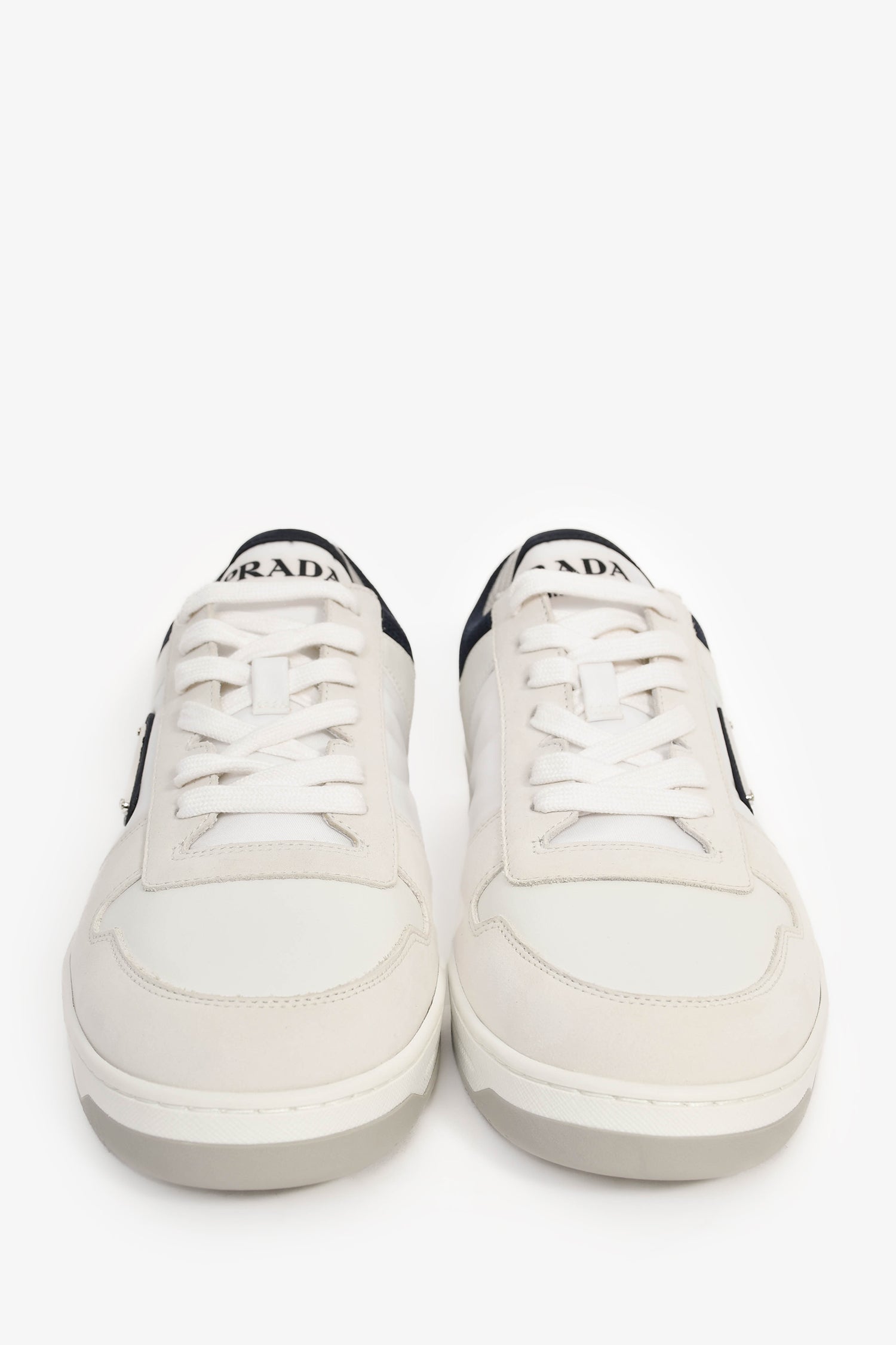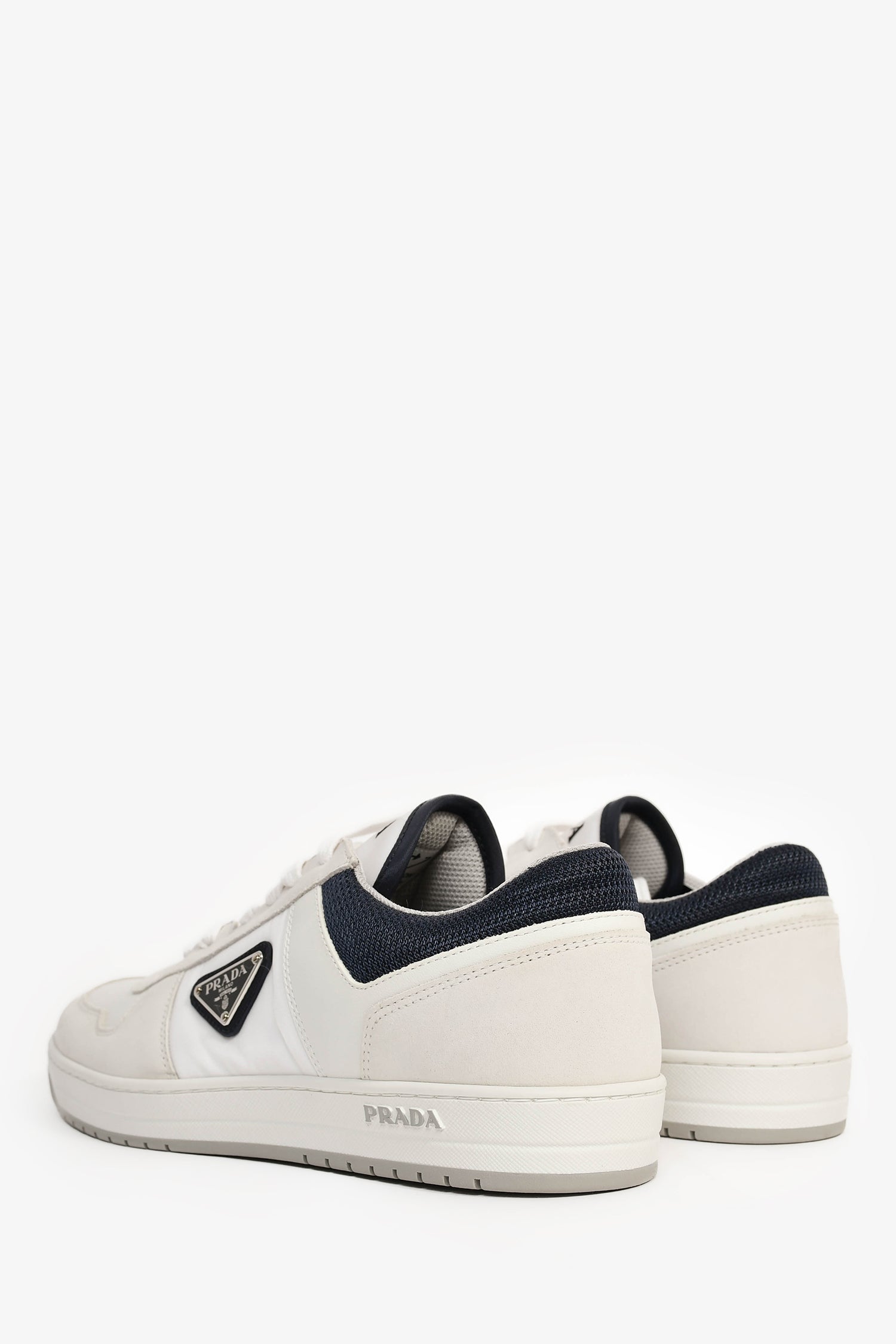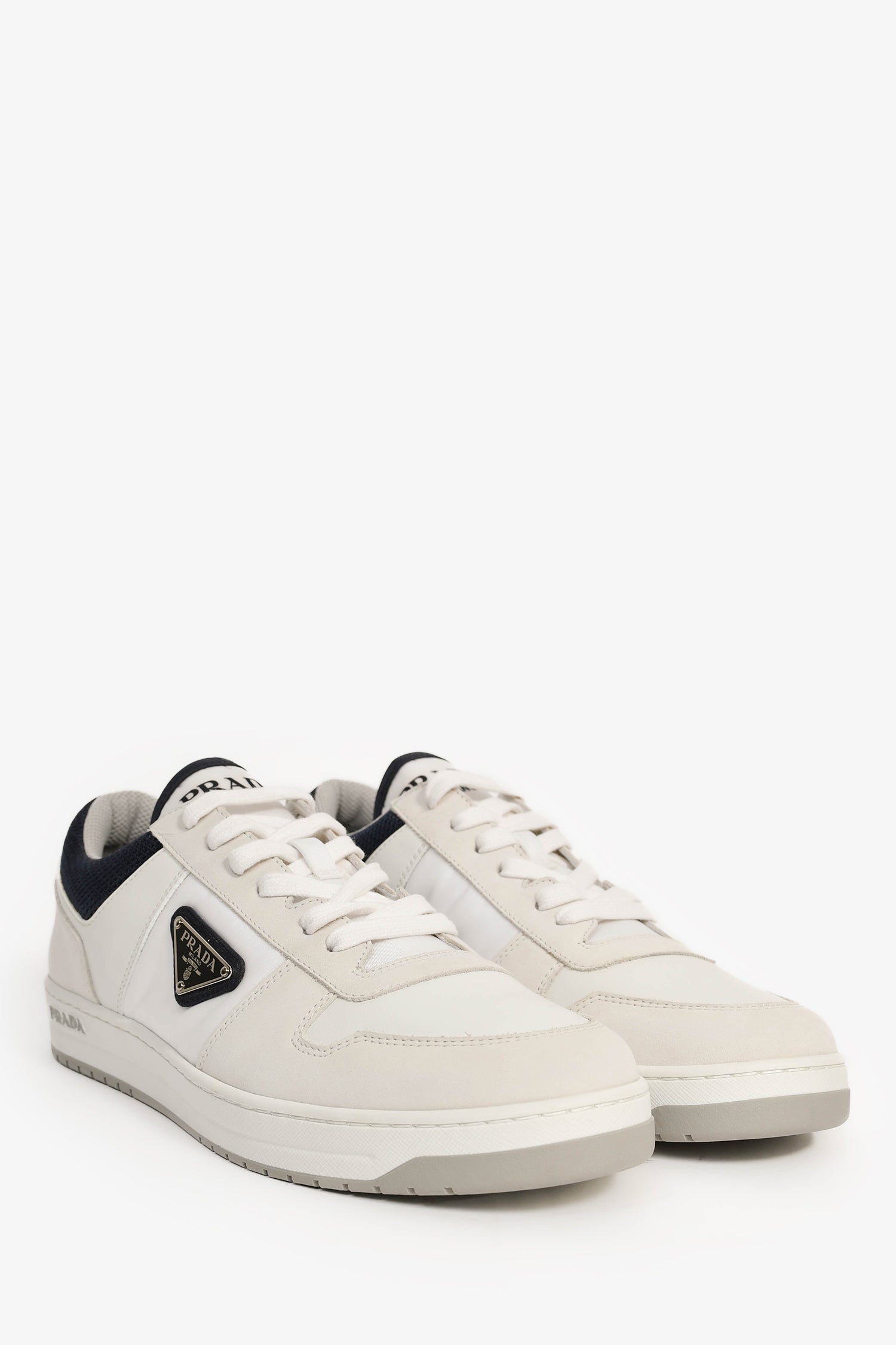 Refresh availabilityPrada White/Navy Re-Nylon/Suede Sneakers. Round toe. Lace-up closure.