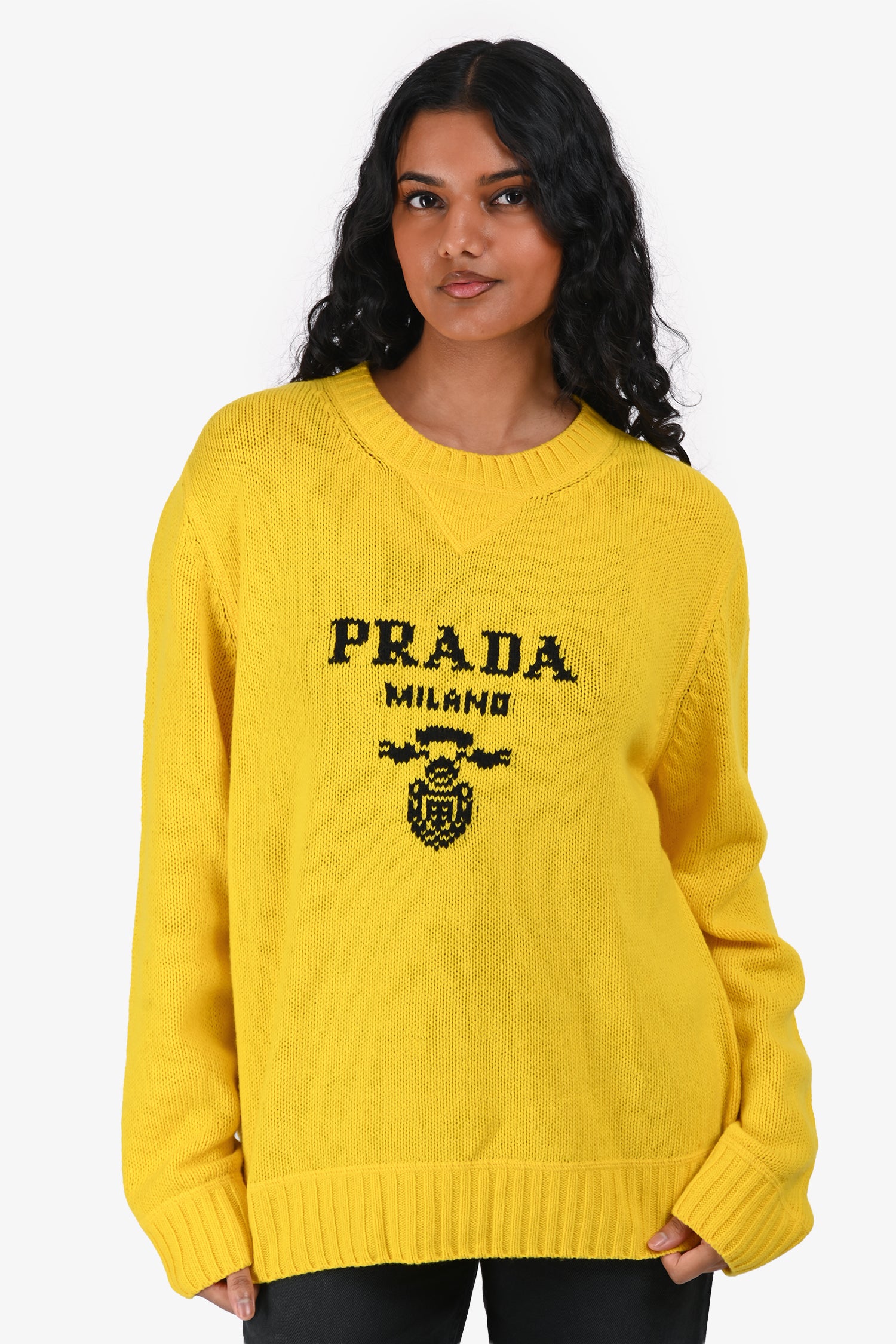 Refresh availabilityPrada Yellow Wool/Cashmere Logo Sweater. Slip-on. Crew neckline. Ribbed neckline, cuffs, and hem. Tonal stitching.