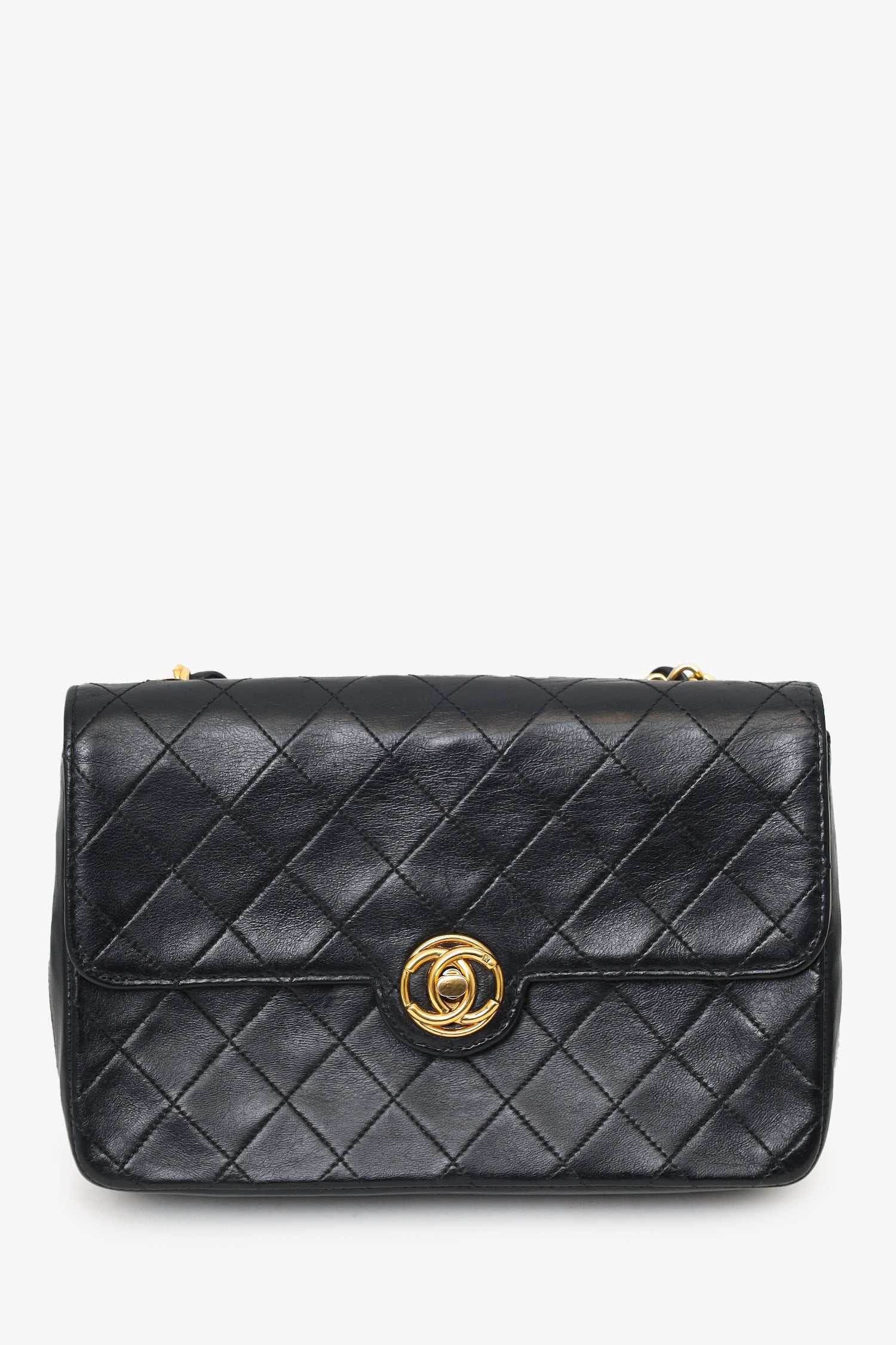 Refresh availabilityPre-Loved Chanel™ 1986-88 Black Quilted Lambskin Circle CC Mini Flap Bag. Front foldover flap with twist-lock closure. Open interior with 3 rear wall pockets; 2 small slip and 1 large zip pocket. Tonal stitching. Gold-tone hardware.