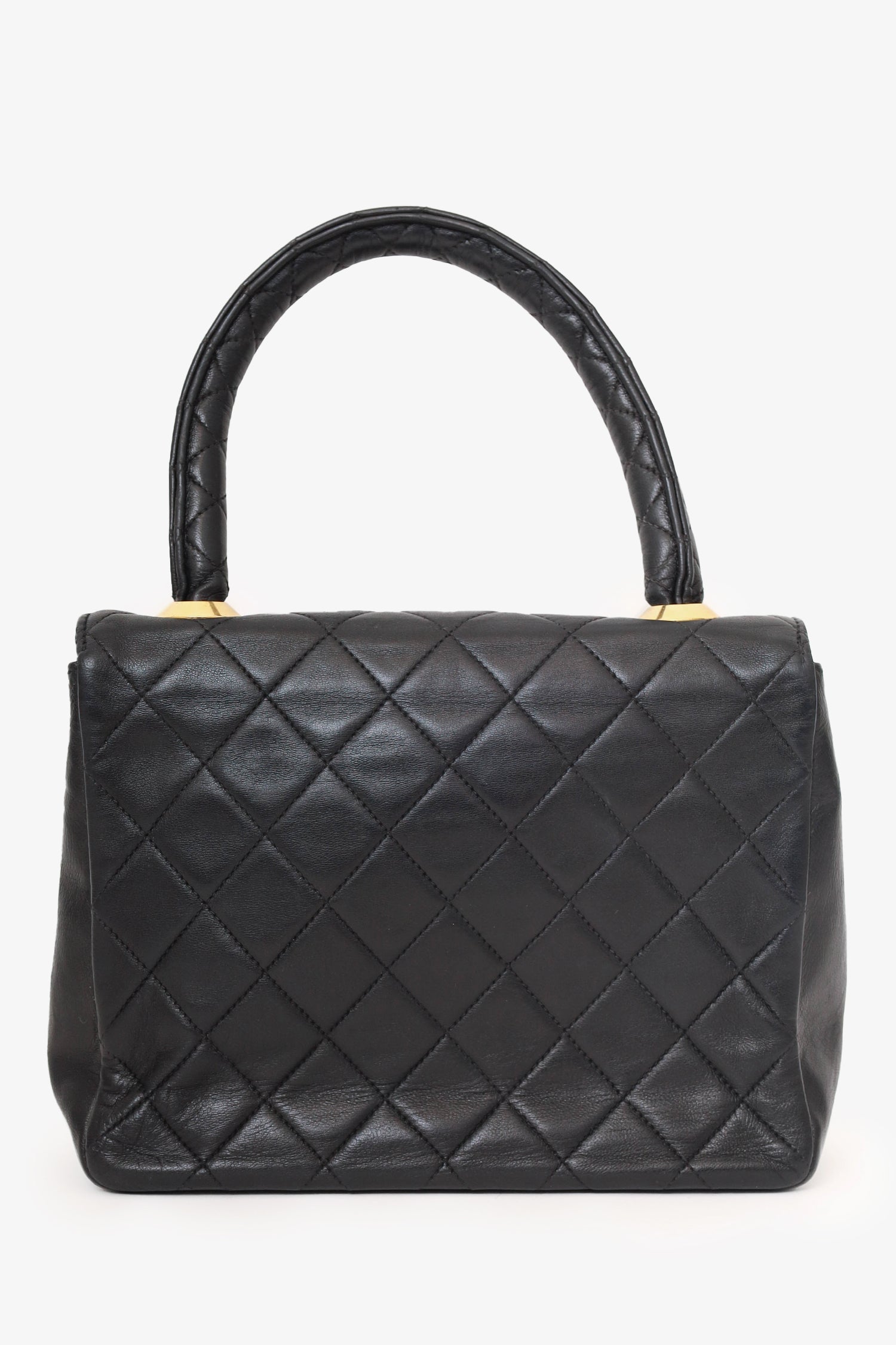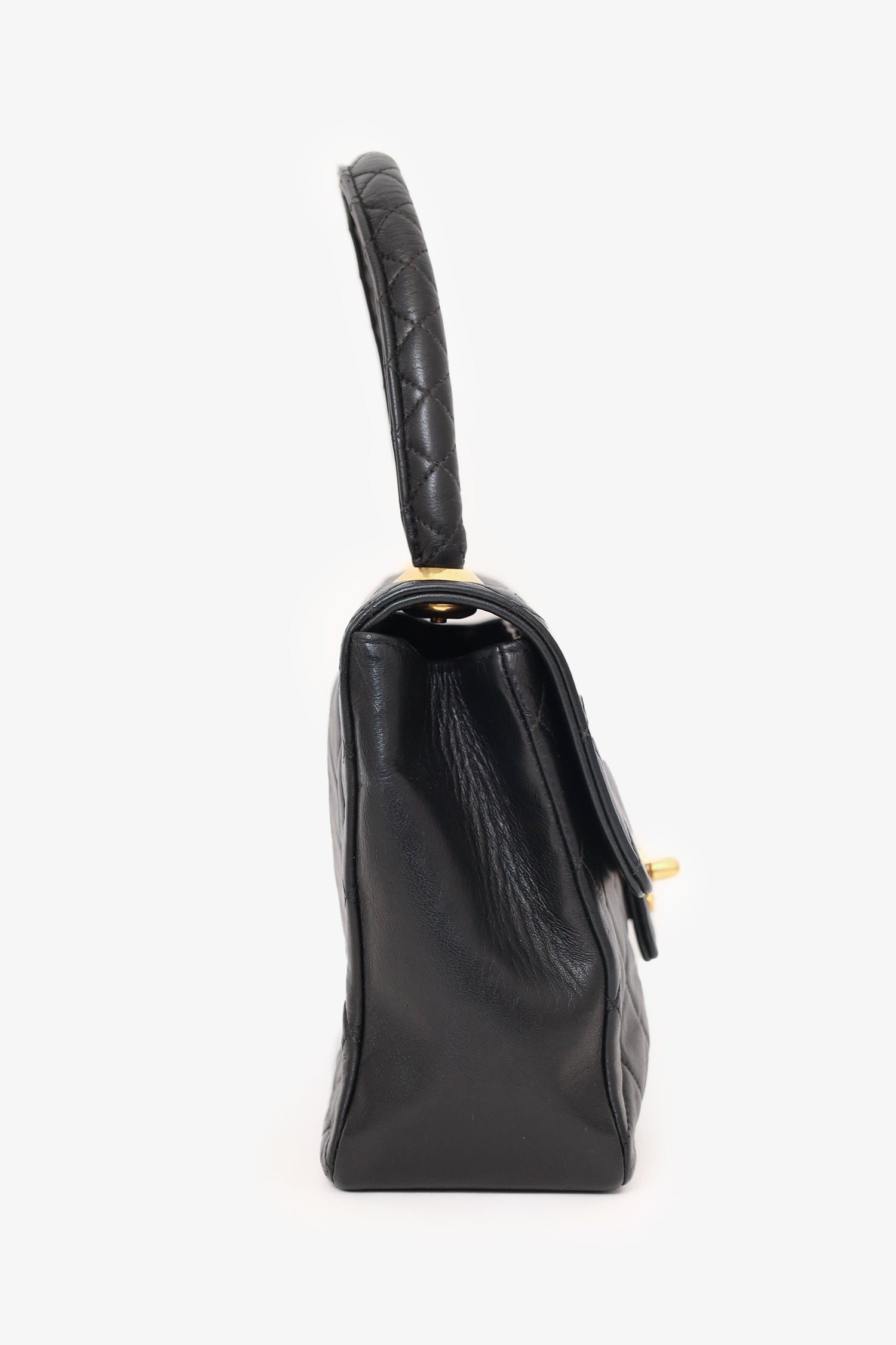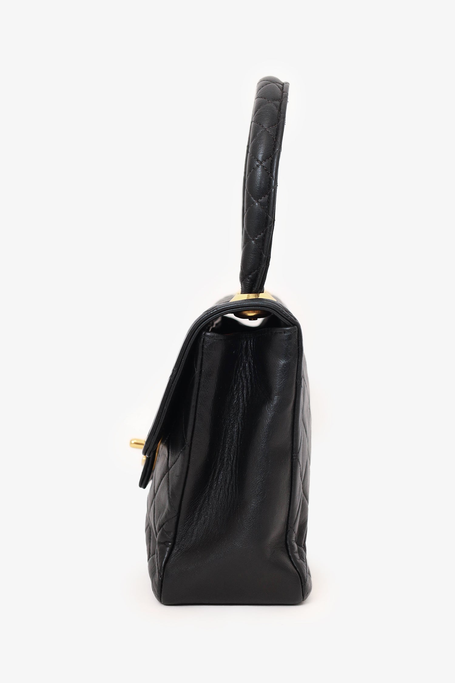 Refresh availabilityPre-Loved Chanel™ 1991-94 Black Quilted Lambskin Kelly Top Handle Bag. Front fold-over flap with turn-lock closure. Top handle. Open interior with single wall zip closure and single wall slip pocket. Gold-tone hardware. Tonal stitching,
