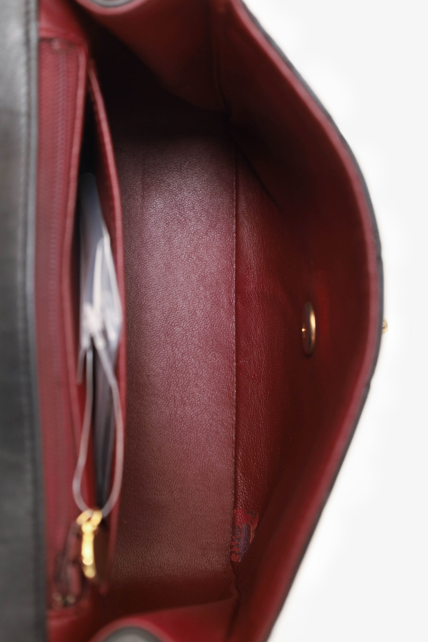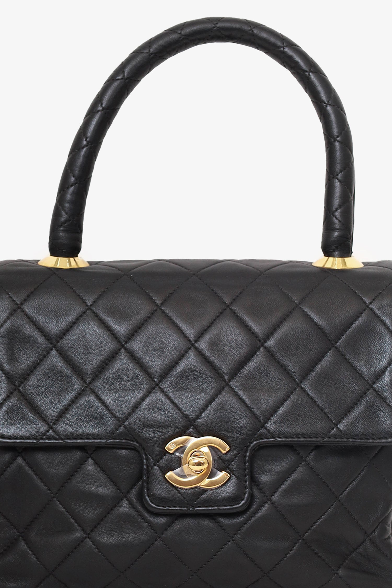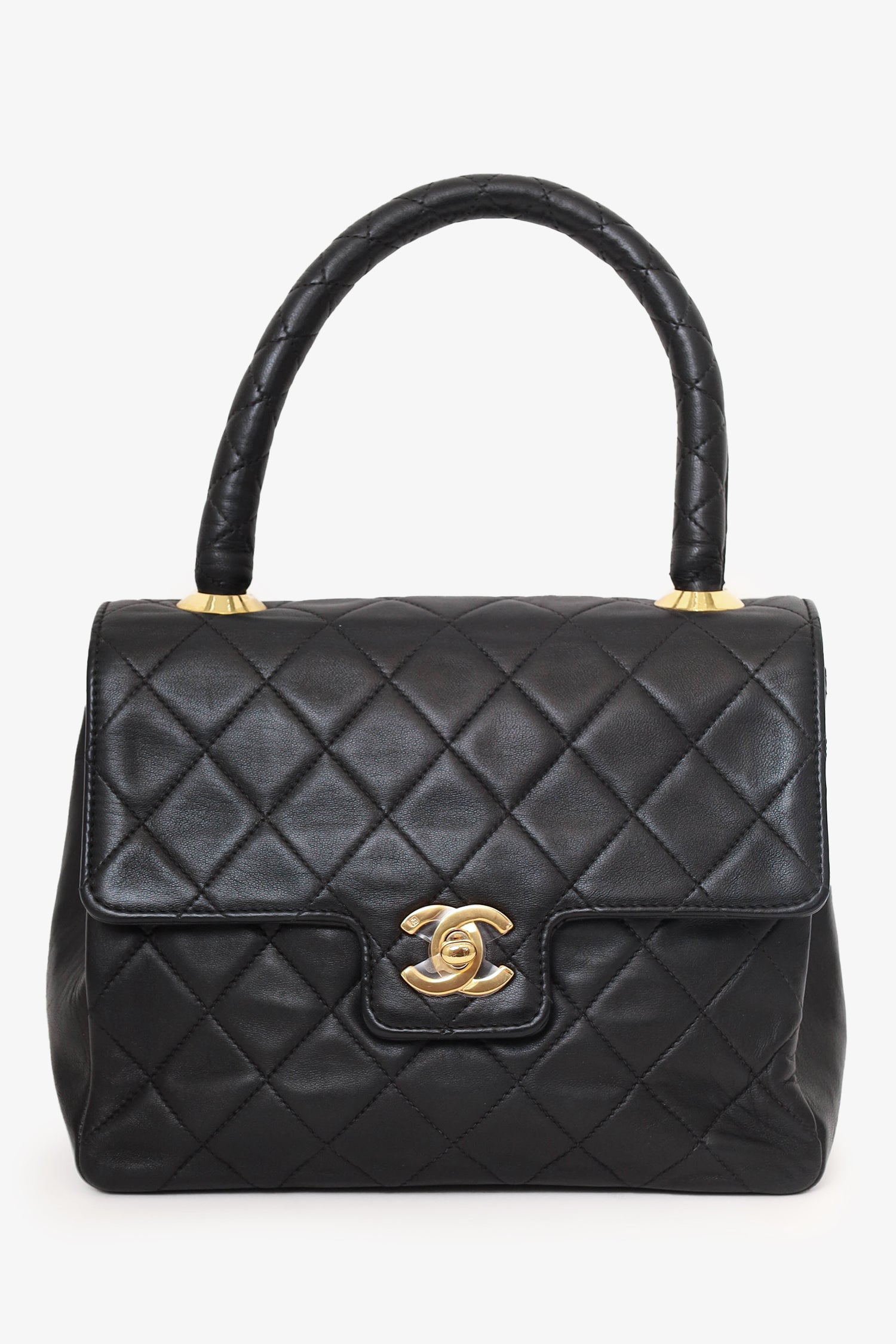 Refresh availabilityPre-Loved Chanel™ 1991-94 Black Quilted Lambskin Kelly Top Handle Bag. Front fold-over flap with turn-lock closure. Top handle. Open interior with single wall zip closure and single wall slip pocket. Gold-tone hardware. Tonal stitching,