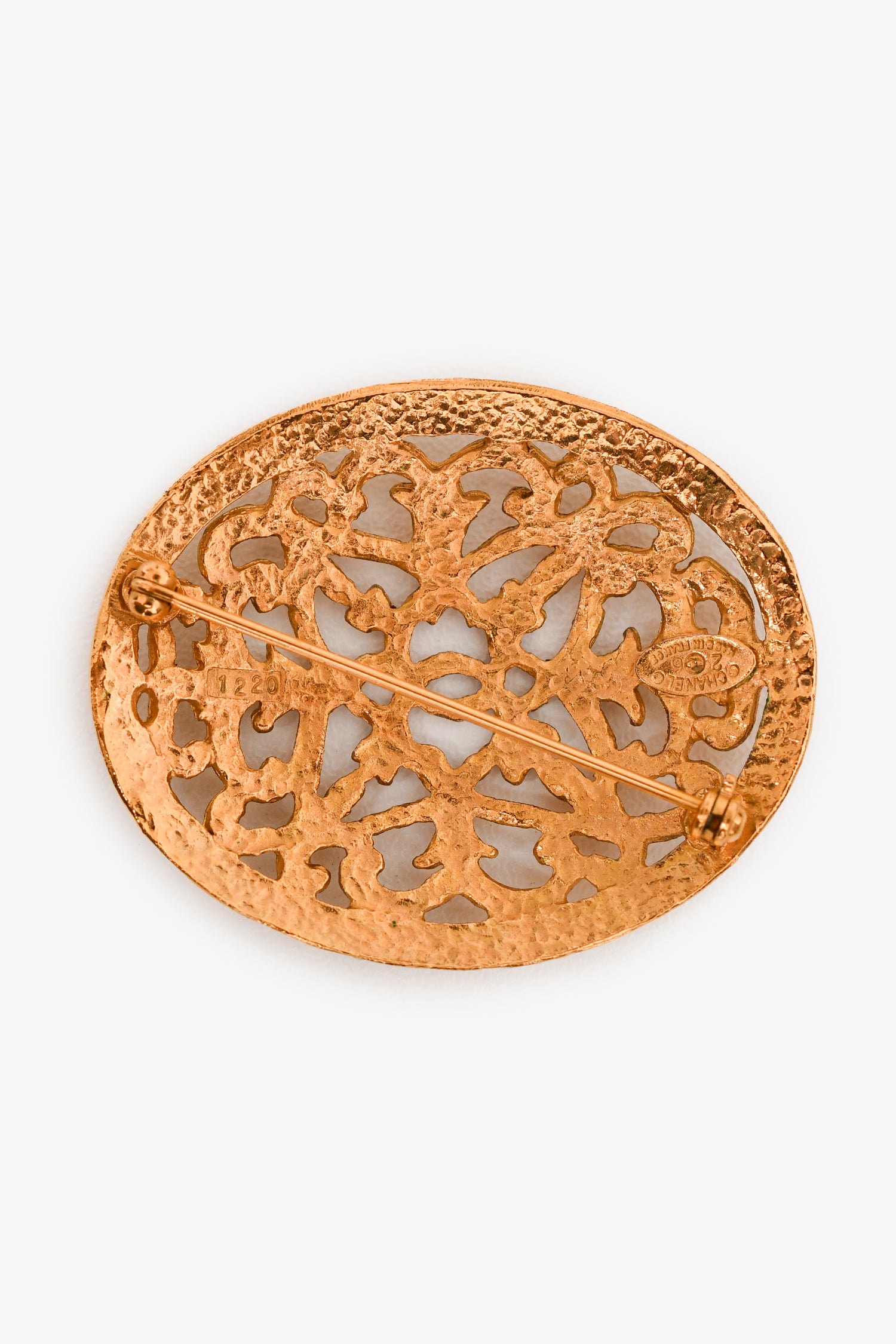 Refresh availabilityPre-Loved Chanel™ 1991 Gold-Tone Oval Cutout CC Brooch. Vintage from 1991. CC logo in center. Pin closure.