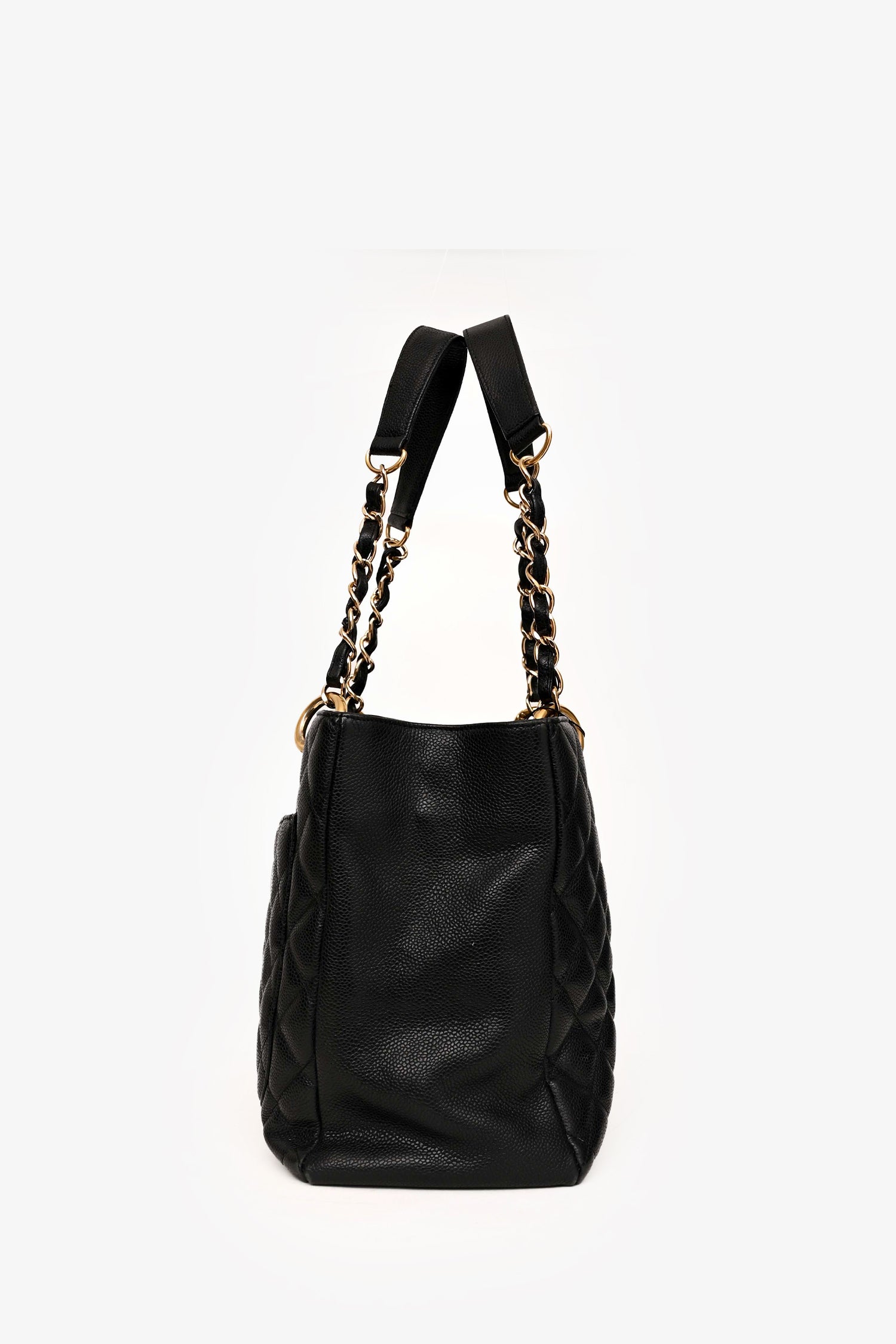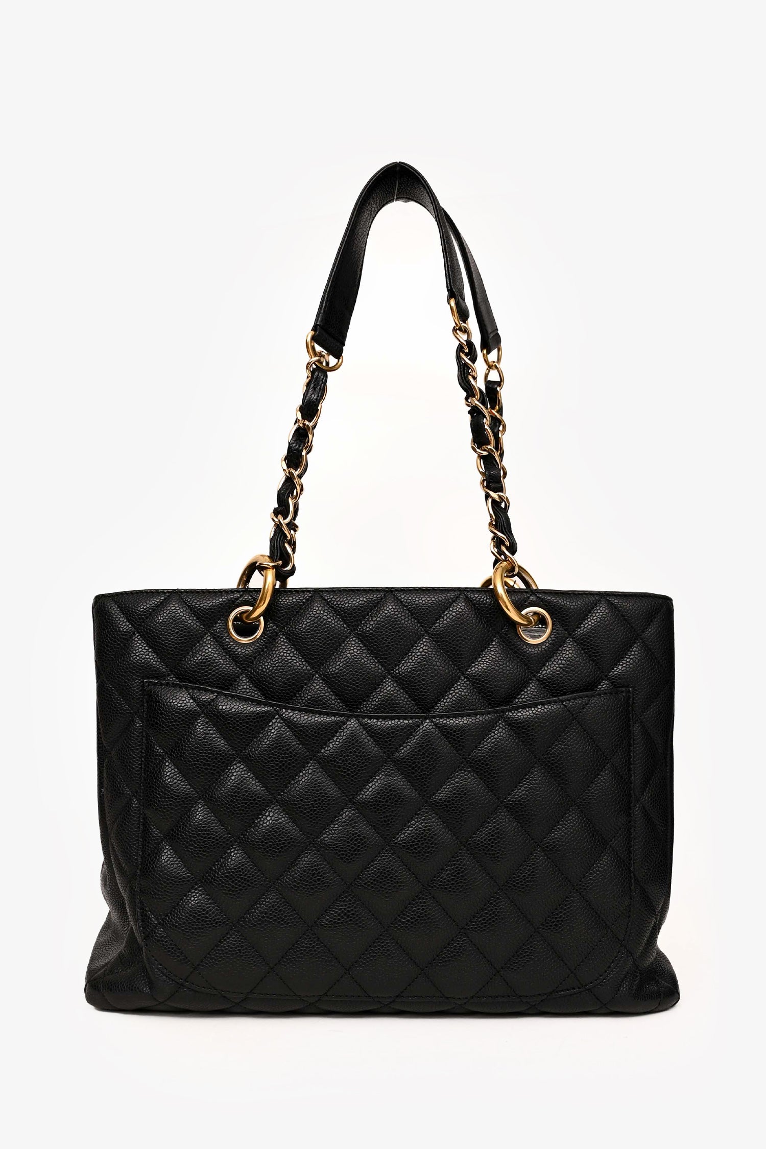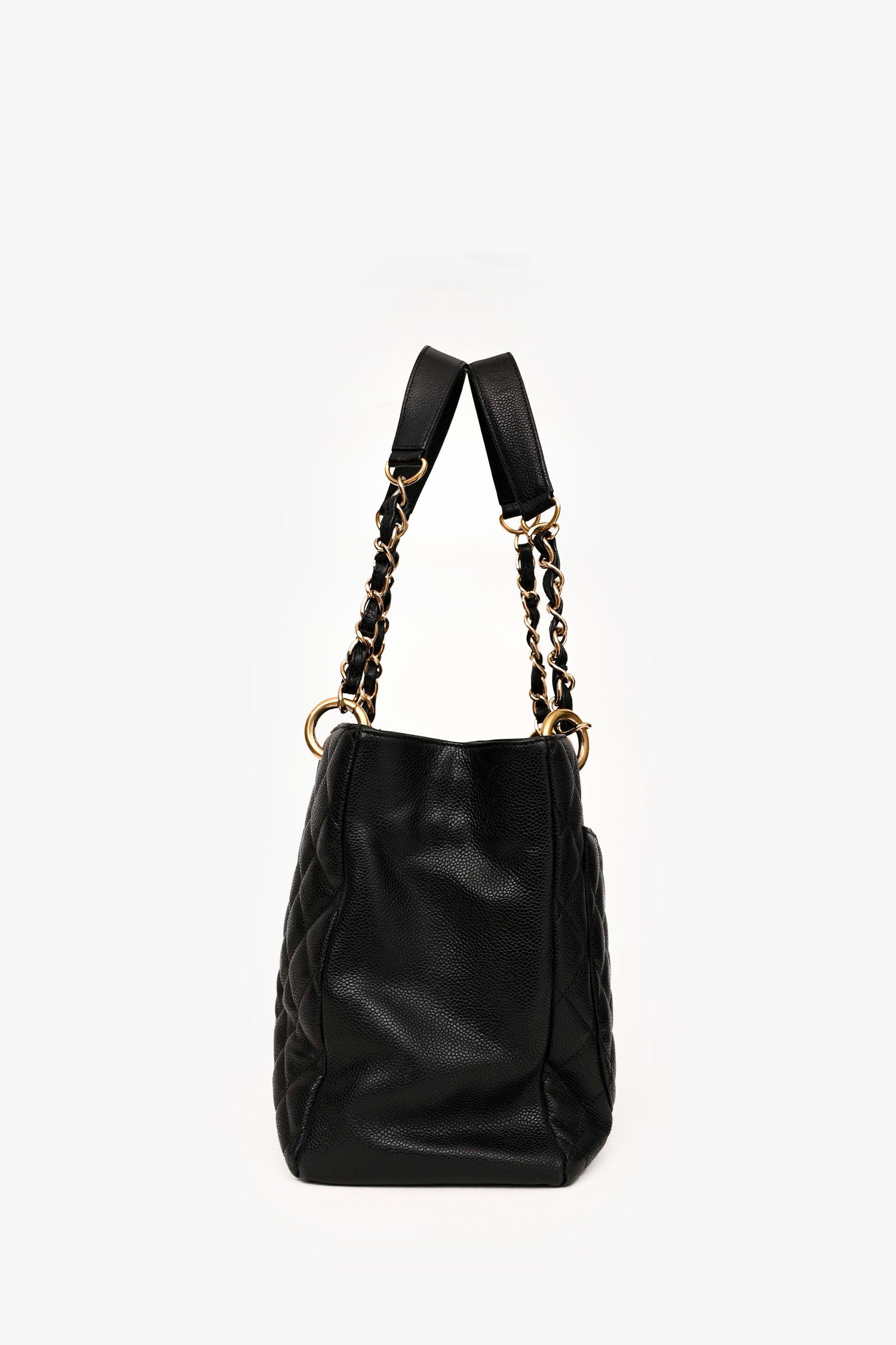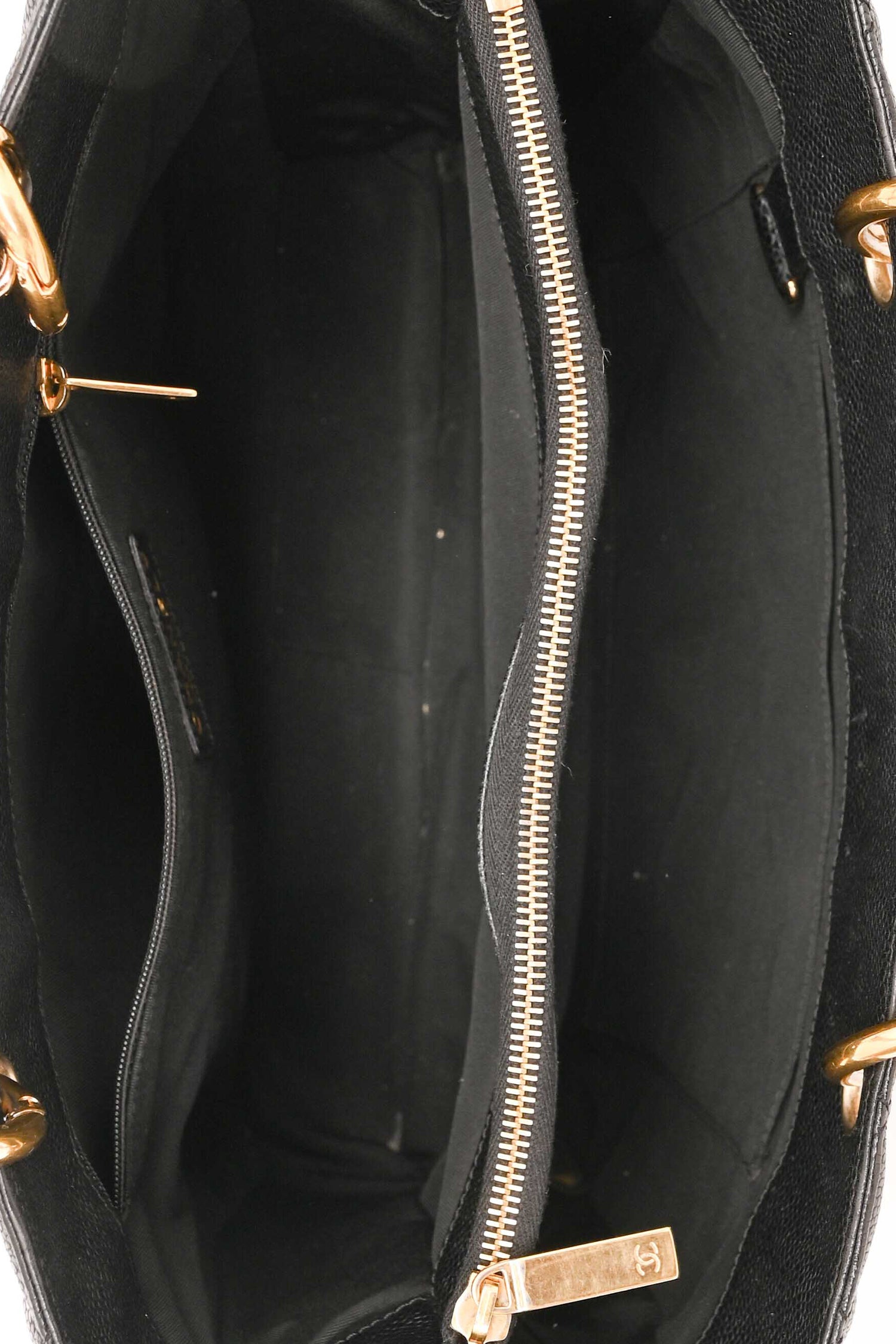 Refresh availabilityPre-Loved Chanel™ 2008-09 Black Caviar Leather Grand Shopping Tote. Gold-tone hardware. Dual handles. 3 compartments: 2 open compartments, one with a wall slip pocket, another with a wall zip pocket. Middle compartment with zipper closure. Exterior rear slip pocket. Black tonal textile lining. Tonal stitching.