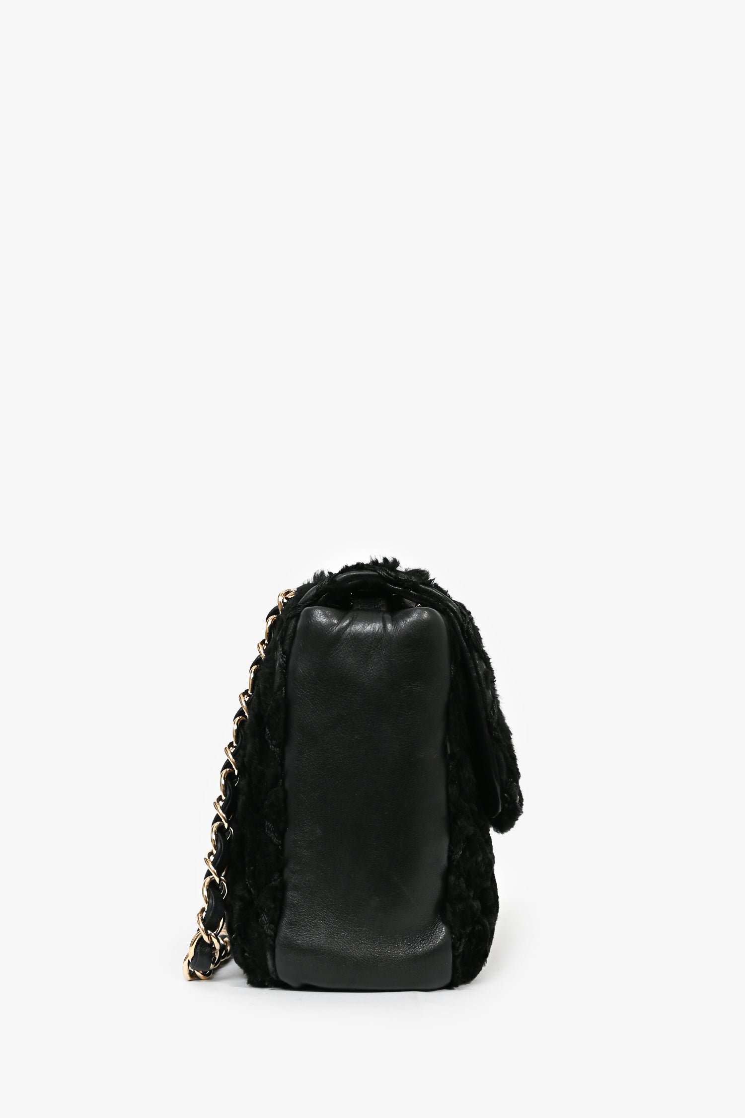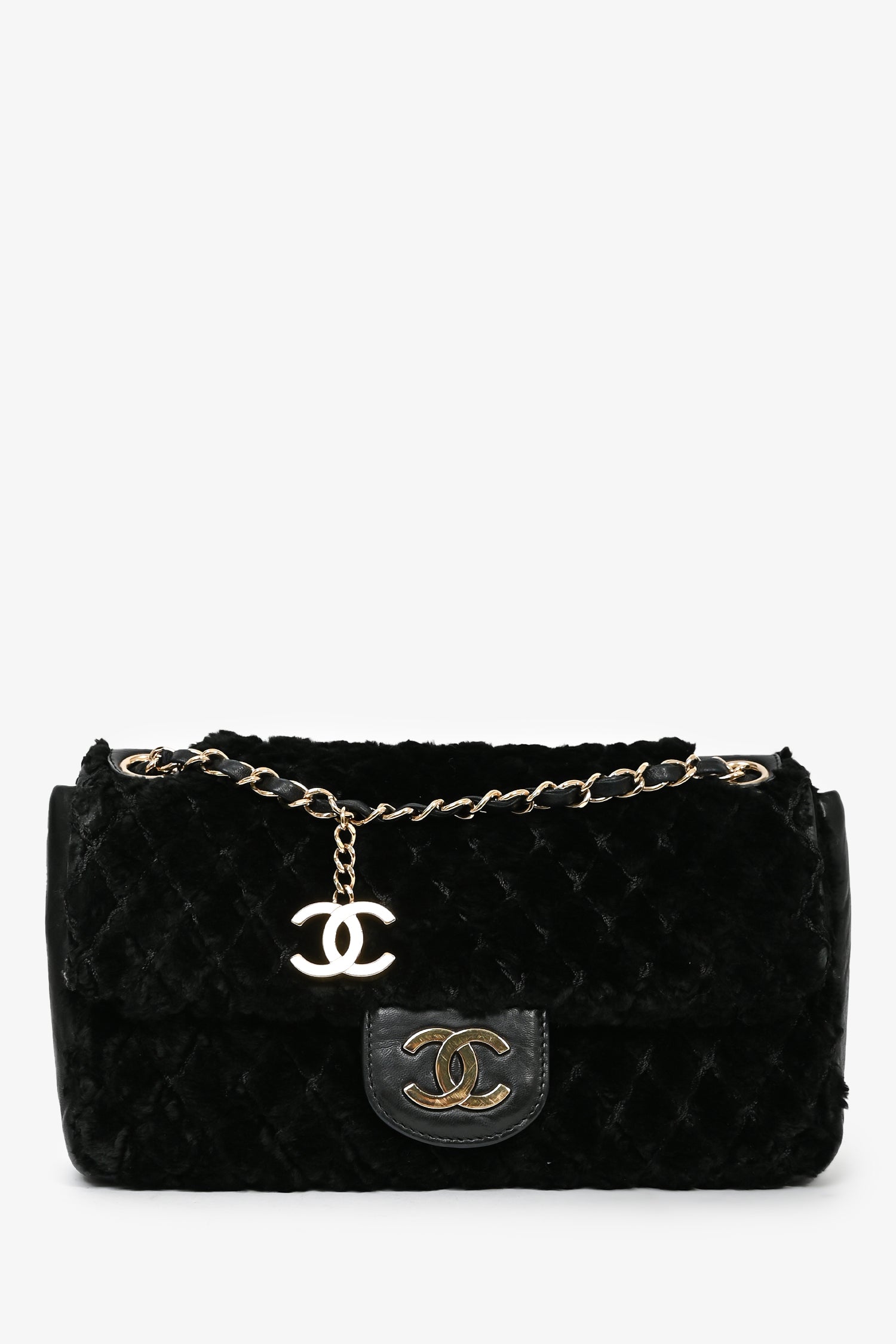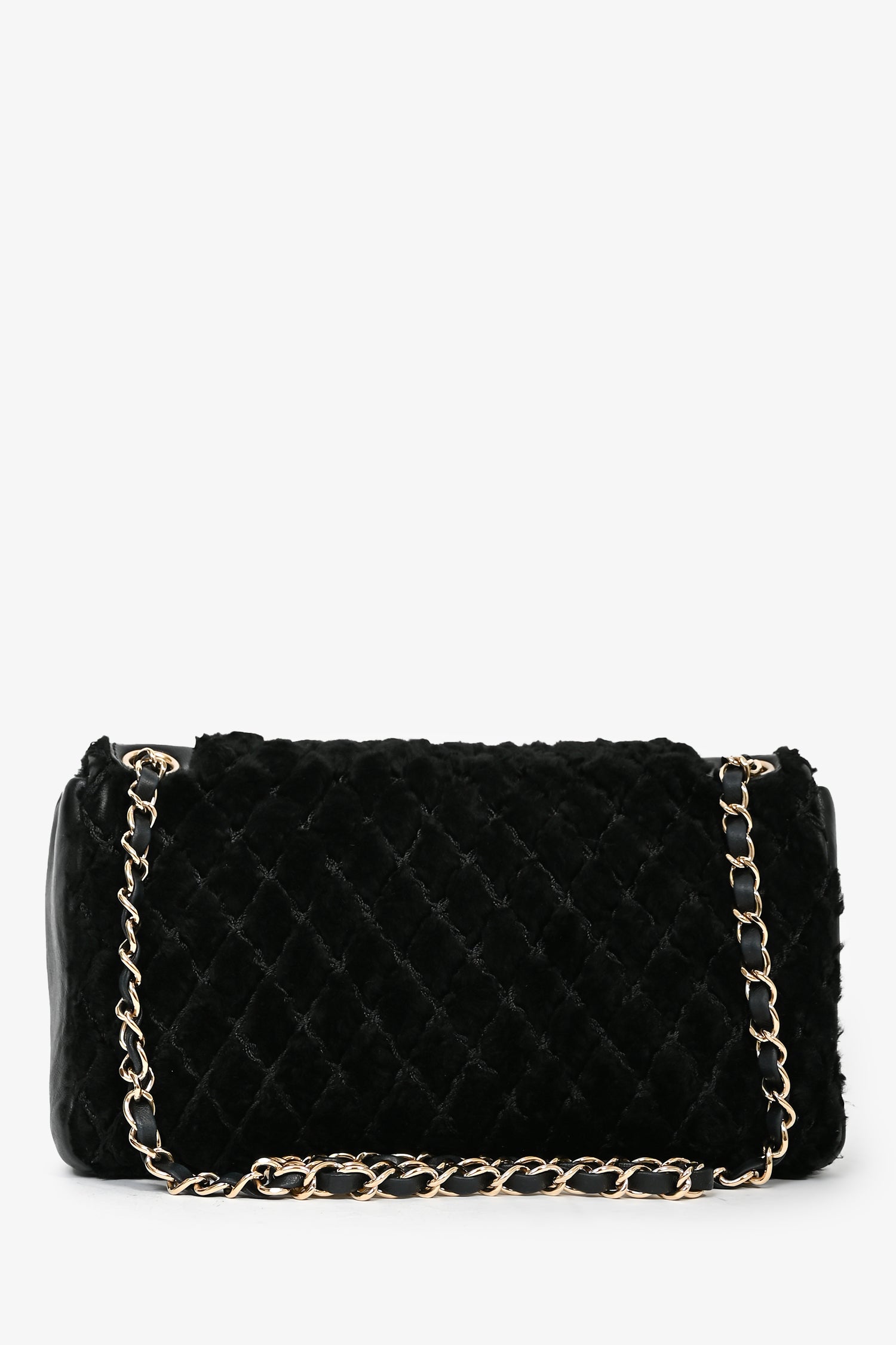 Refresh availabilityPre-loved Chanel™ 2008/09 Black Rabbit Fur/Calfskin Leather Flap Bag. Front flap with magnetic closure. A single open compartment includes a wall pocket with zipper closure. Double chain strap. Gold-tone hardware. Tonal stitching.