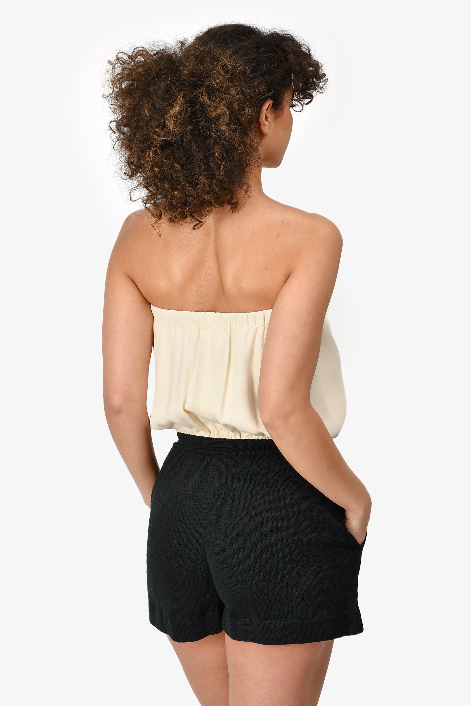 Pre-Loved Chanel™ 2011 Beige/Black Silk Romper. Strapless design. Strings on the top and waist for adjusting and detail. Lined shorts. Elasticized on the top. Tonal stitching.
