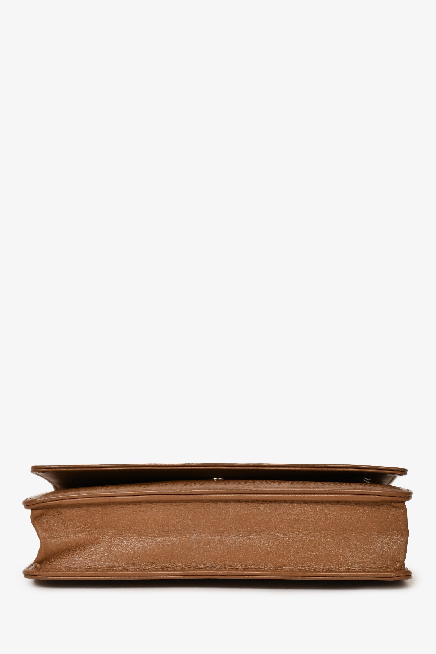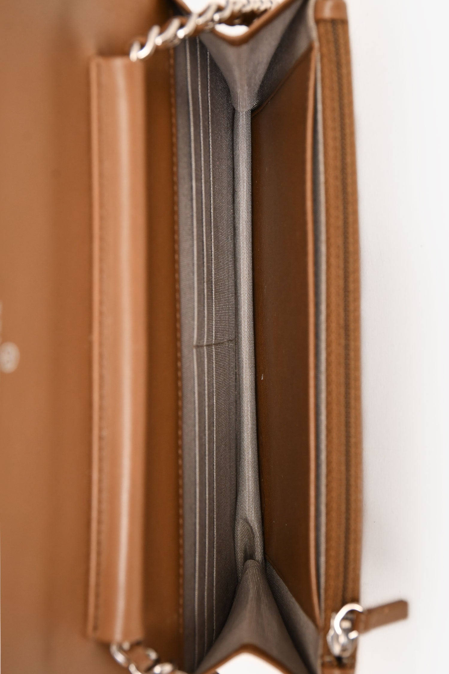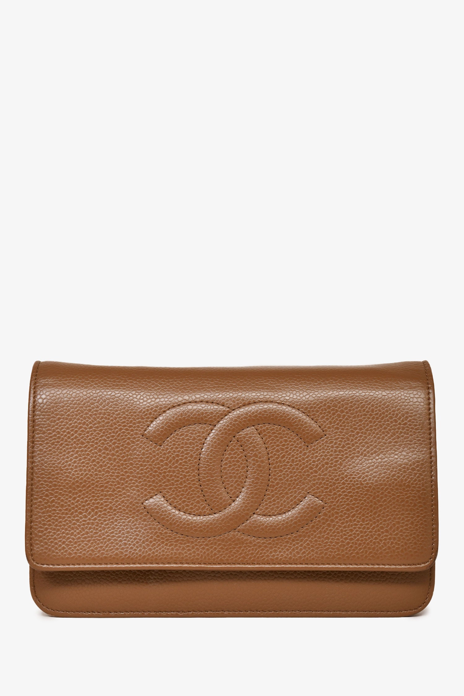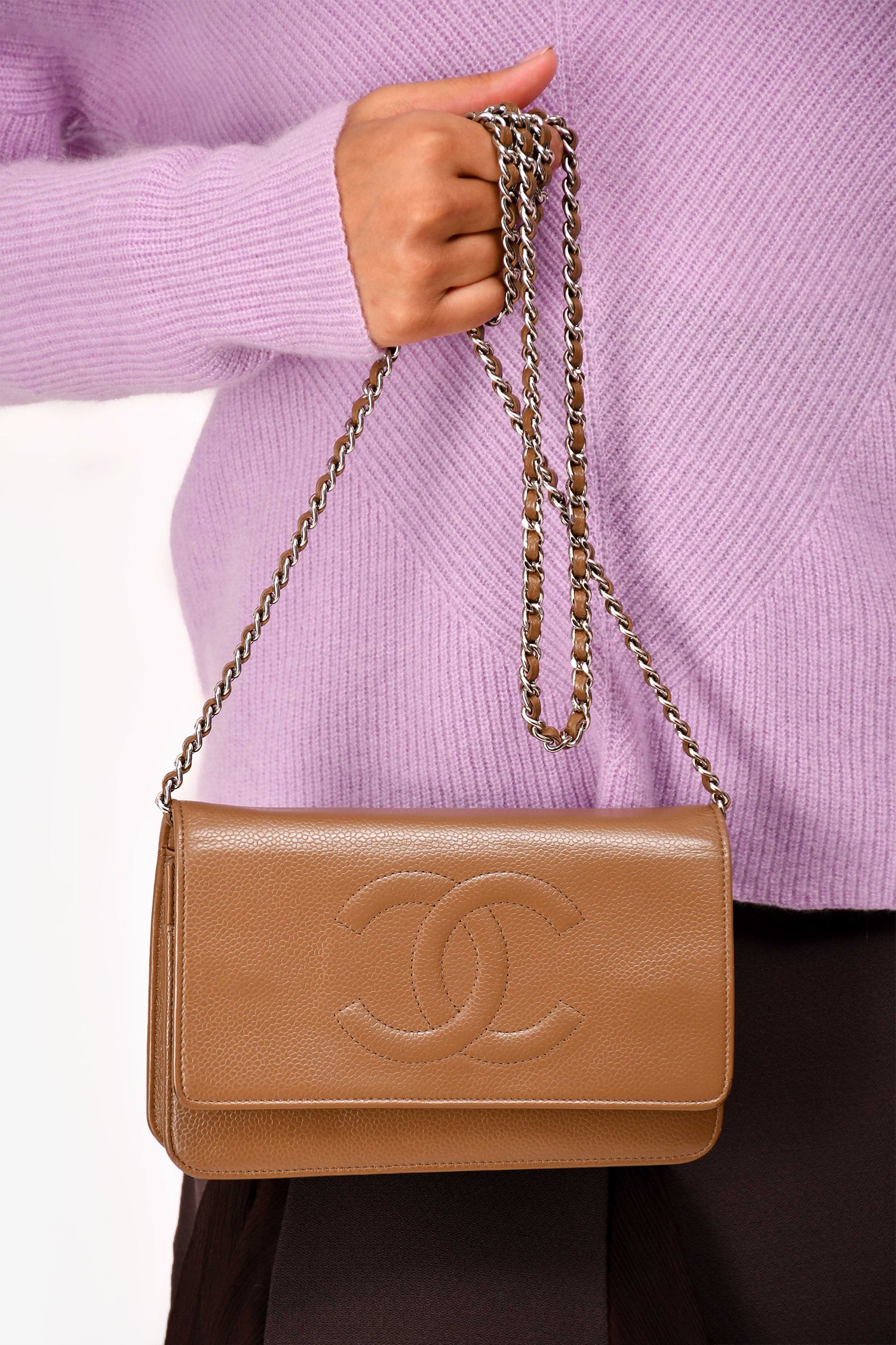 Refresh availabilityPre-Loved Chanel™ 2012-13 Brown Caviar Leather CC Logo Wallet On Chain. Single chain linked strap. Fold over flap with snap button closure. Lampo zipper pocket on the interior of the flap. One exterior slip pocket under flap. One zip closure pocket. Main compartment with one wall slip pocket and six card slots. Tonal stitching.