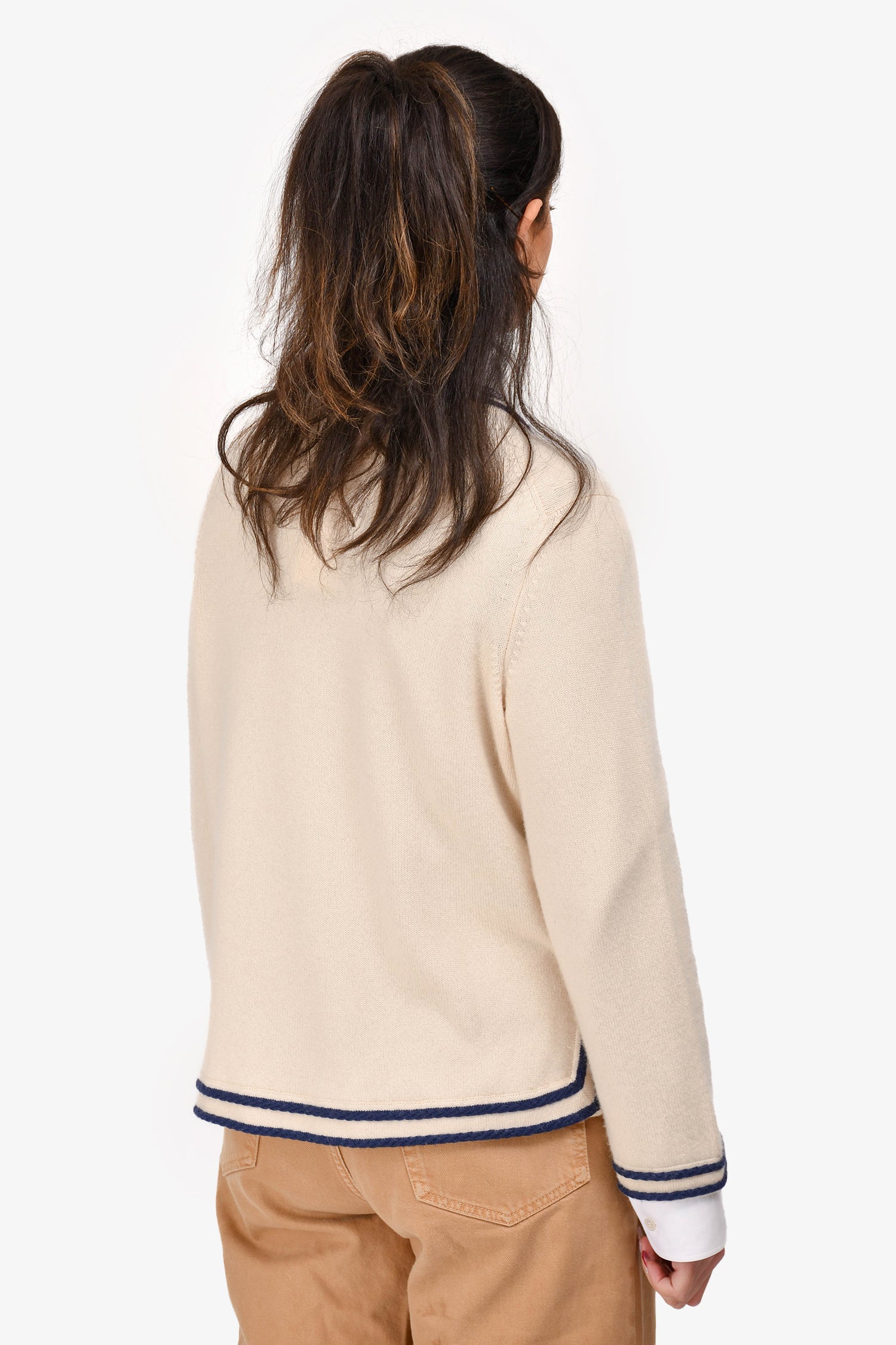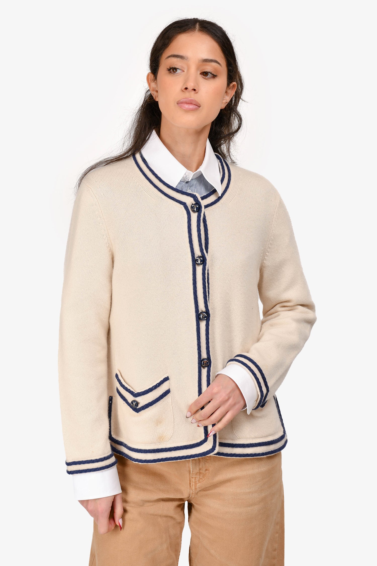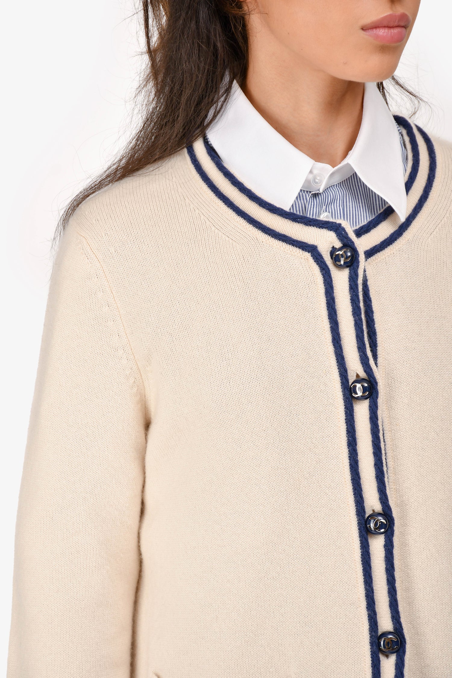 Pre-Loved Chanel™ 2015 Cream/Navy Trim Detailed Pocket Cardigan. Blue/Silver acrylic buttons. Front button closures. 2 buttoned hand pockets.