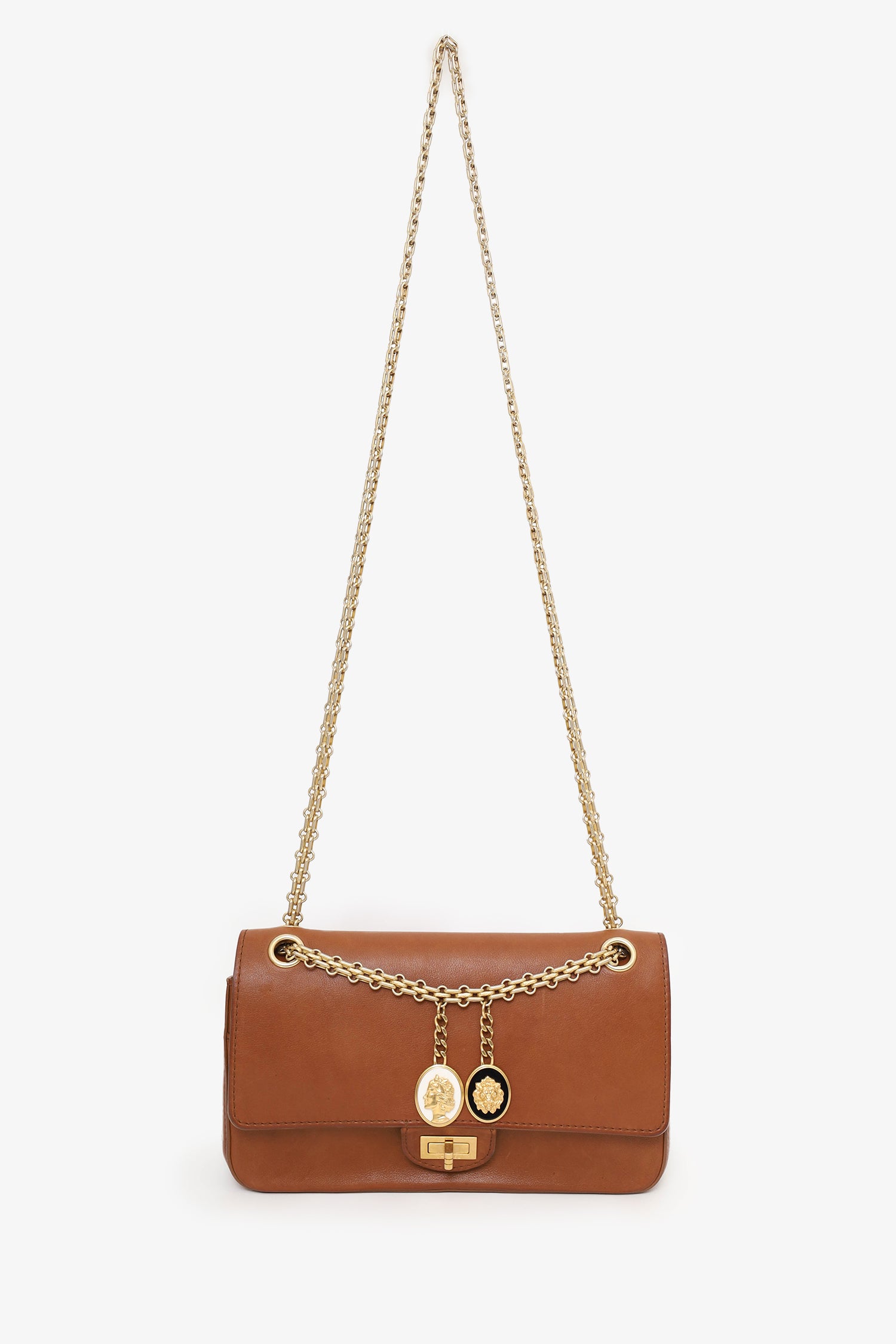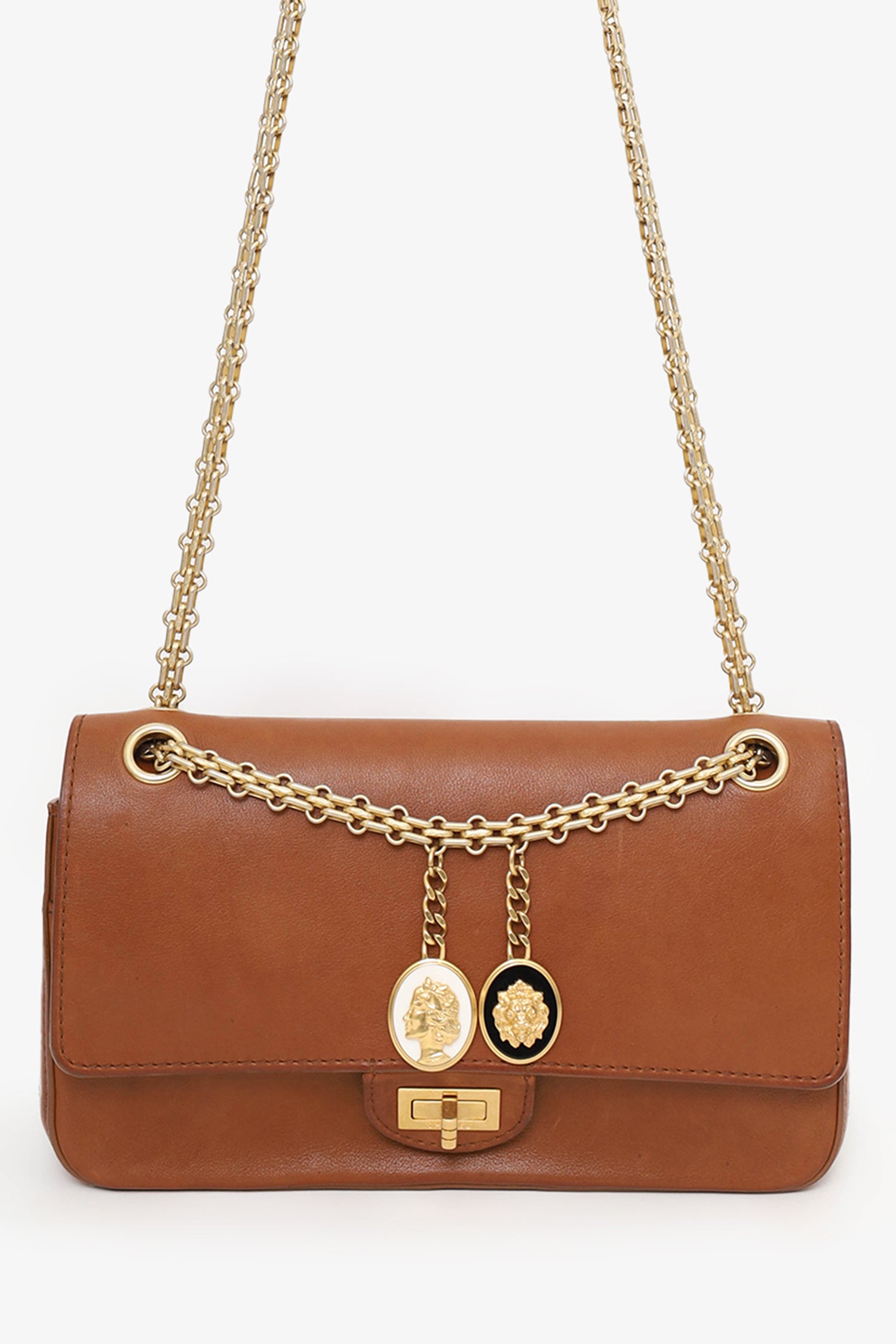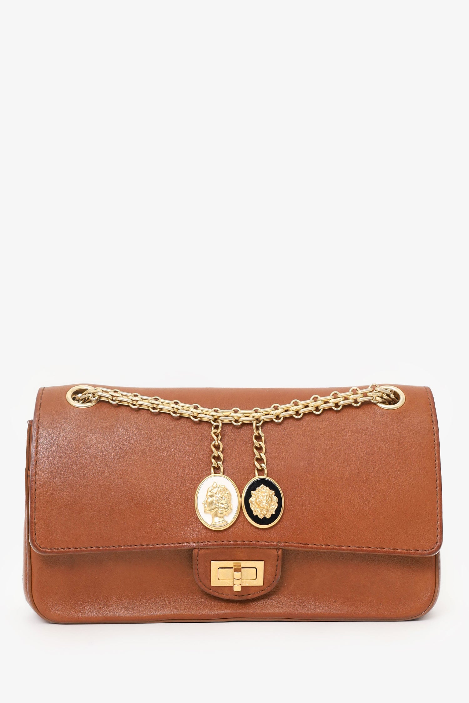 Refresh availabilityPre-Loved Chanel™ 2017 Brown Leather Medallion Charm Reissue 2.55 Shoulder Bag. Top double fold-over flap with turn-lock and snap button closure. Double chain shoulder strap. Single rear slip pocket. Single front interior slip pocket. Interior main compartment with 2 slip pockets and 1 pen compartment. Gold-tone hardware. Tonal stitching.