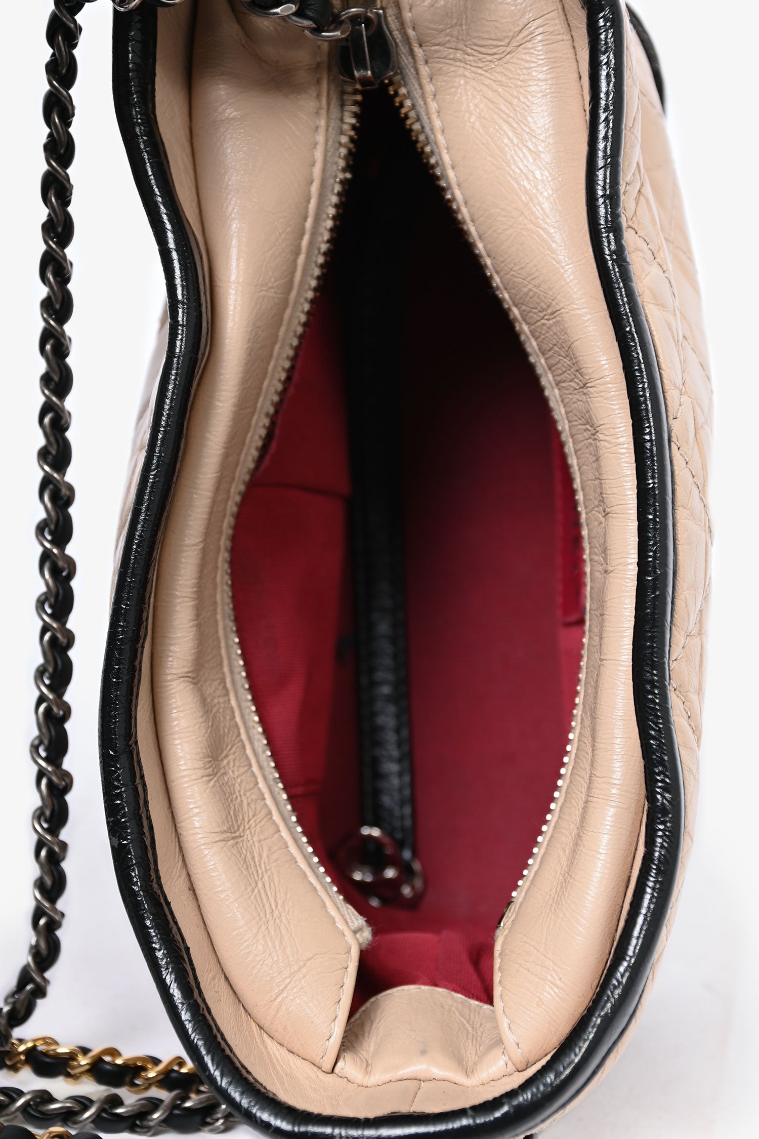 Refresh availabilityPre-loved Chanel™ 2018 Beige/Black Quilted Small Gabrielle Shoulder Bag. Top snap lock closure. Single open compartment with 2 slip pocket, and a wall pocket with zip up closure. Adjustable cross body strap. Gold and silver-tone hardware. Lined. Tonal stitching.