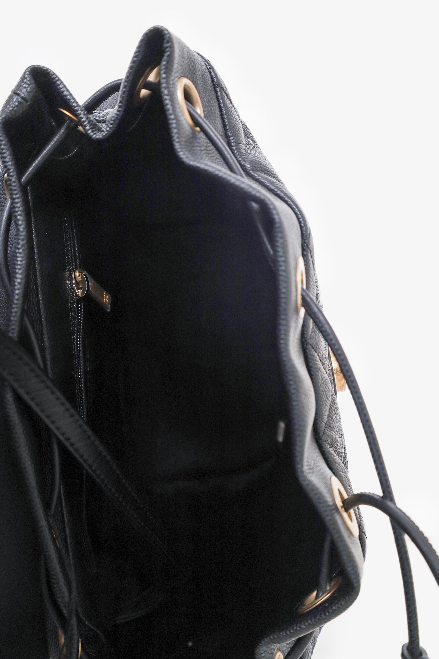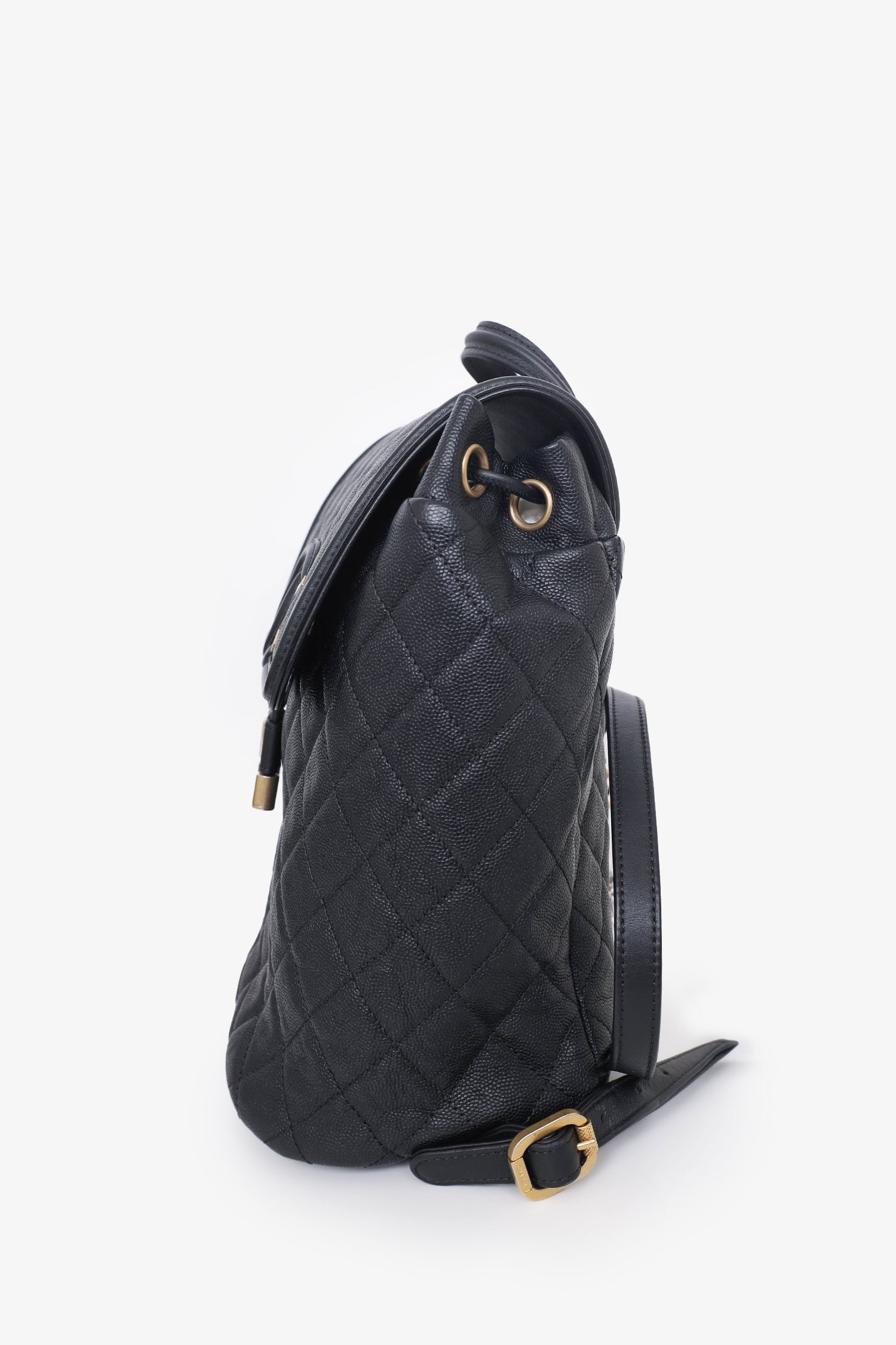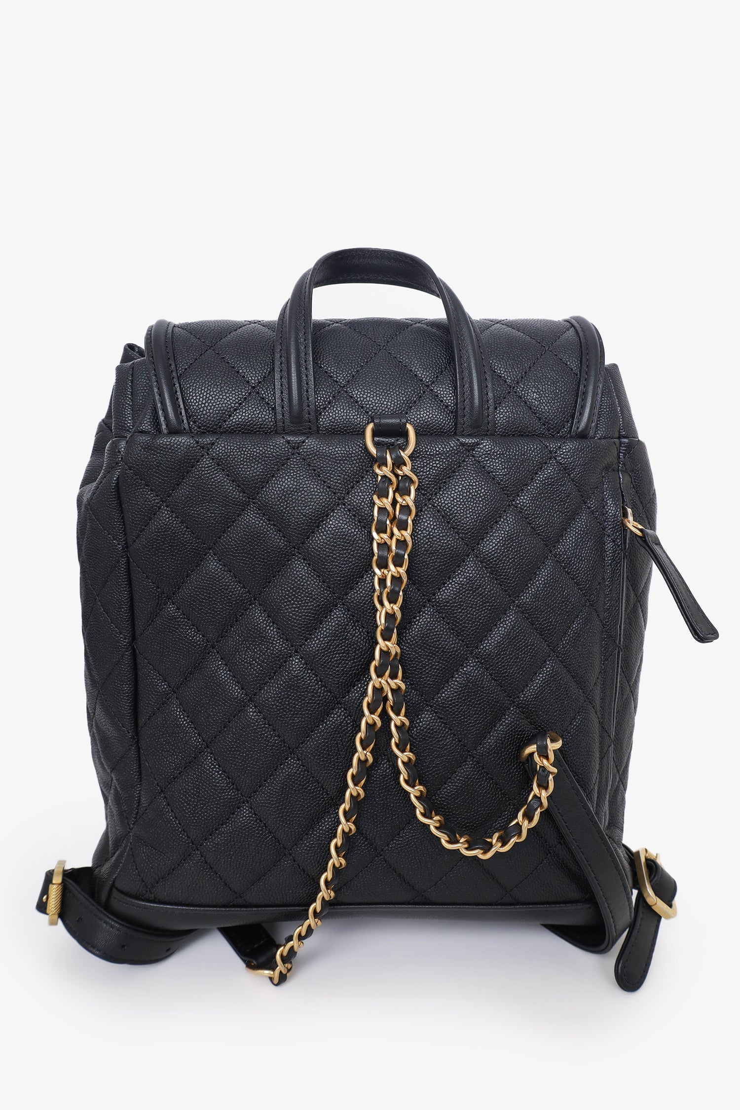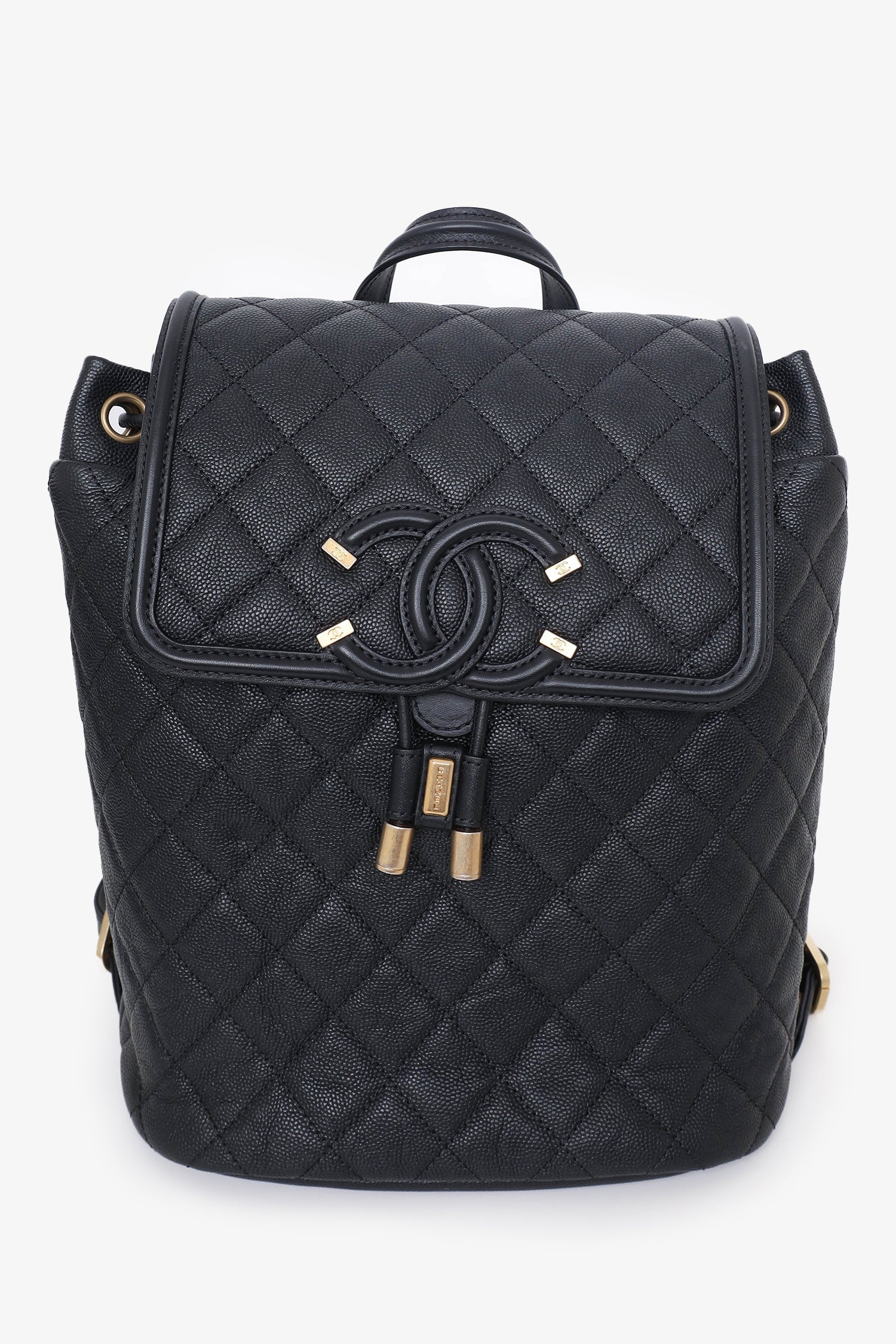Refresh availabilityPre-Loved Chanel™ 2018 Black Caviar Quilted CC Filigree Backpack. Magnetic button closure. Interior pocket with zip closure. Adjustable straps. Gold-tone hardware. Tonal stitching.