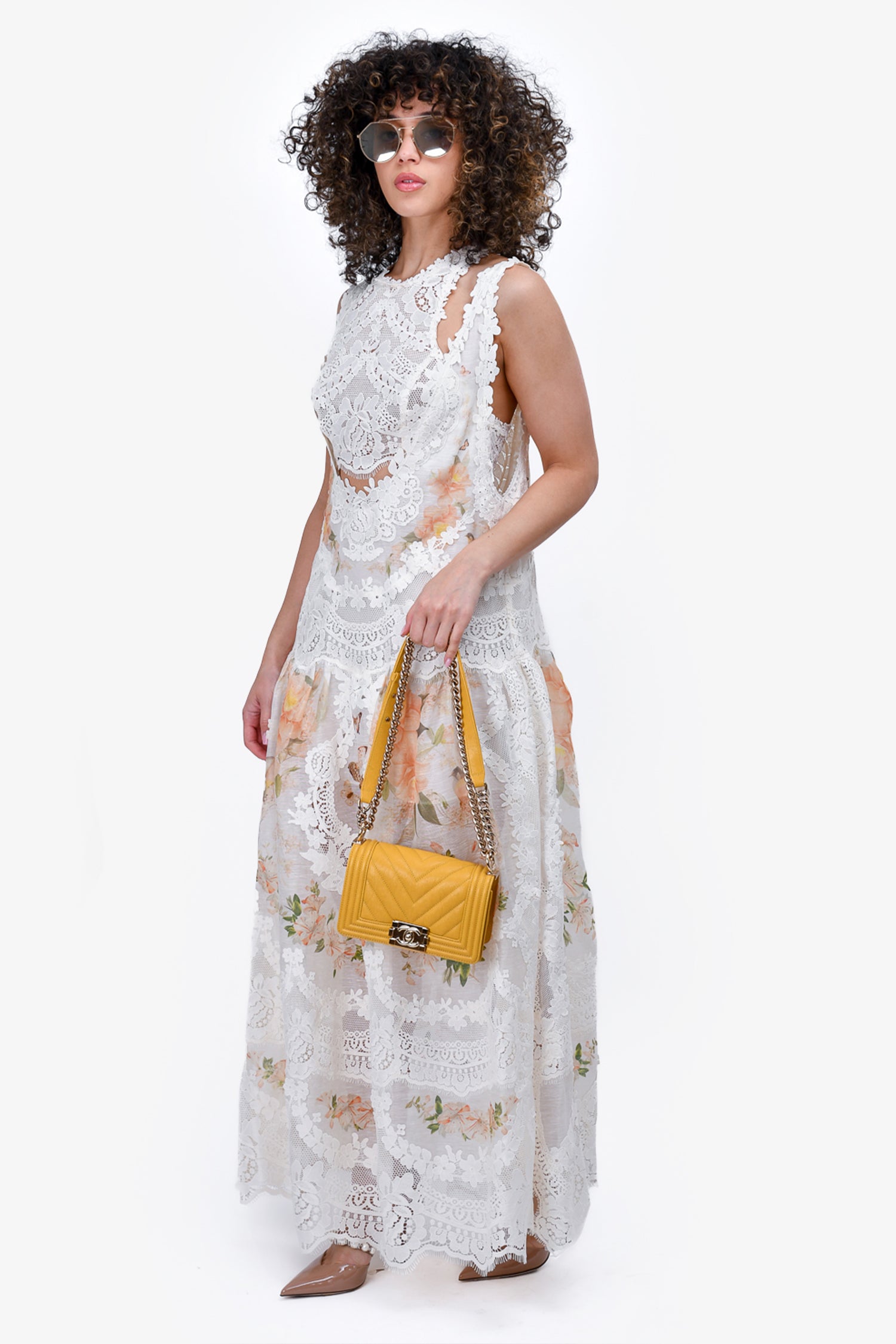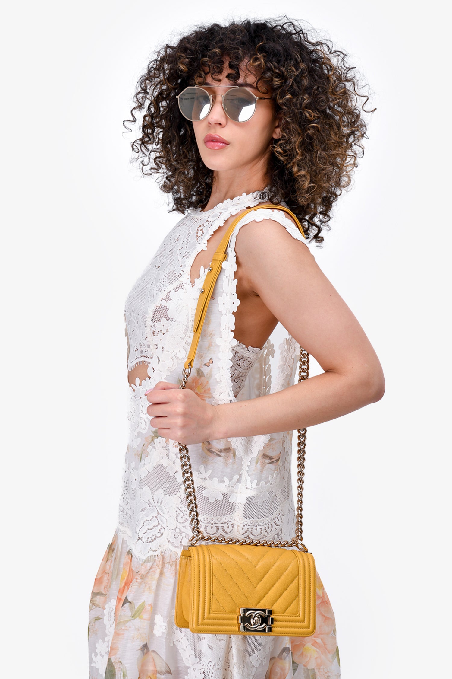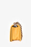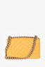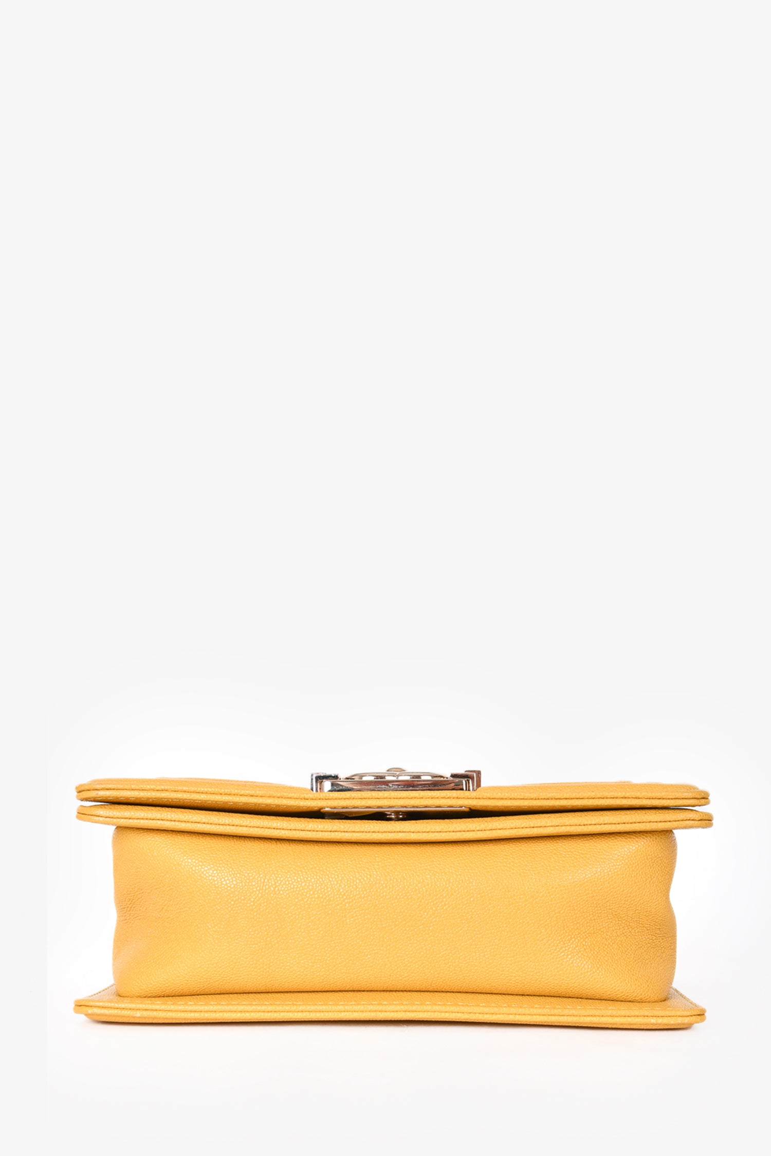 Pre-loved Chanel™ 2019/20 Yellow Caviar Leather Small Boy Bag. Front fold over flap with push tab closure. 1 interior slip pocket. Gold-toned hardware. Tonal stitching.