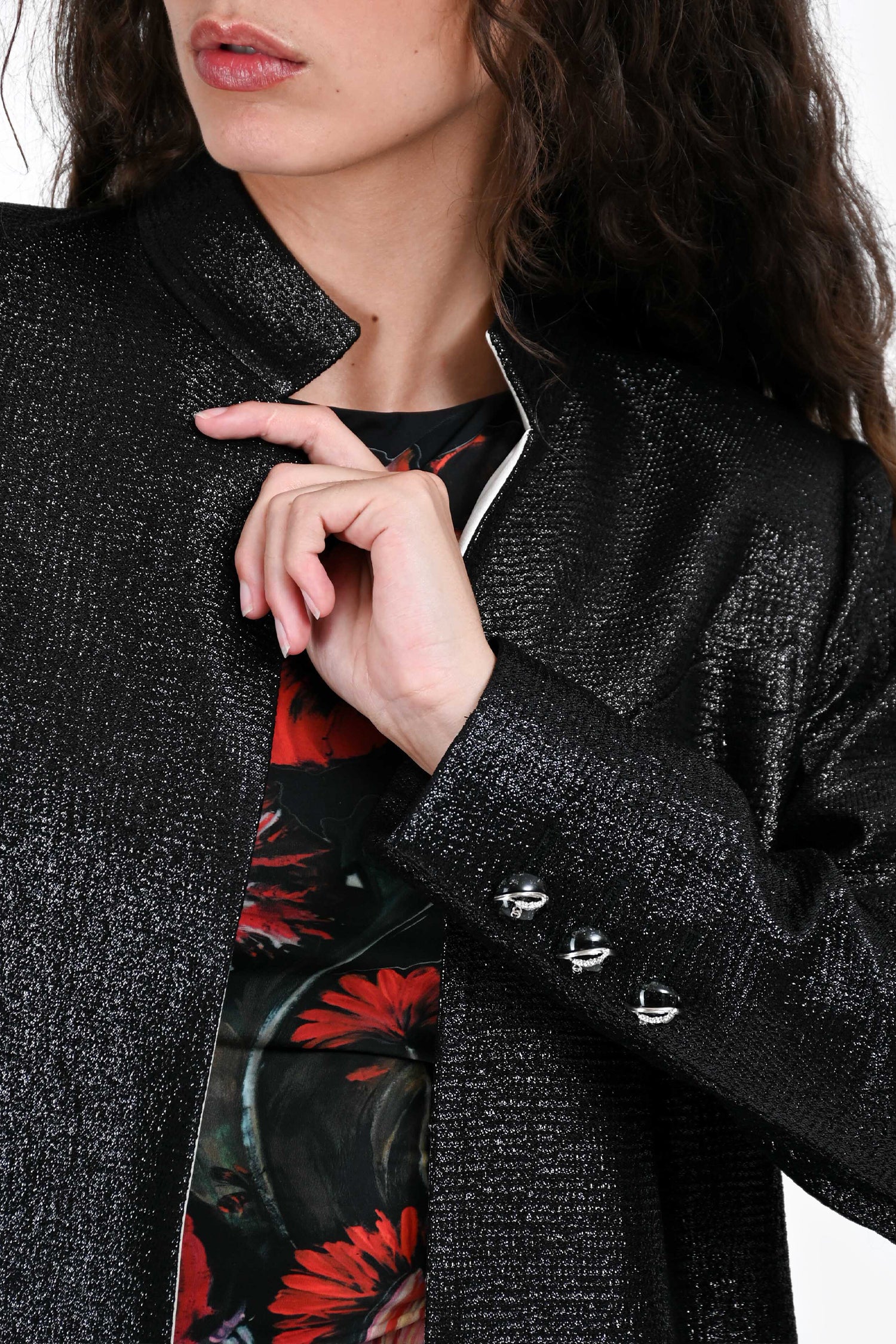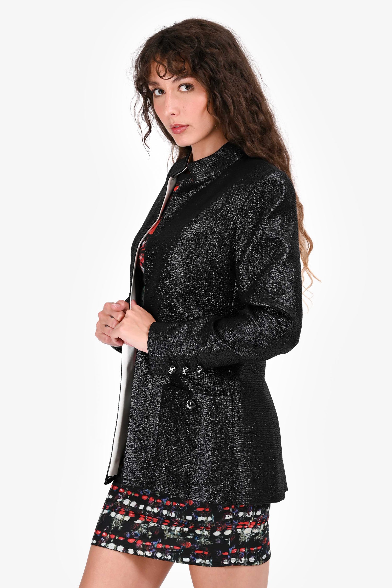 Pre-Loved Chanel™ 2020 Black Metallic Wool Mandarin Collar Blazer. Open front. Long sleeves with buttoned cuffs. Front patch pockets. Fully lined. Tonal stitching.