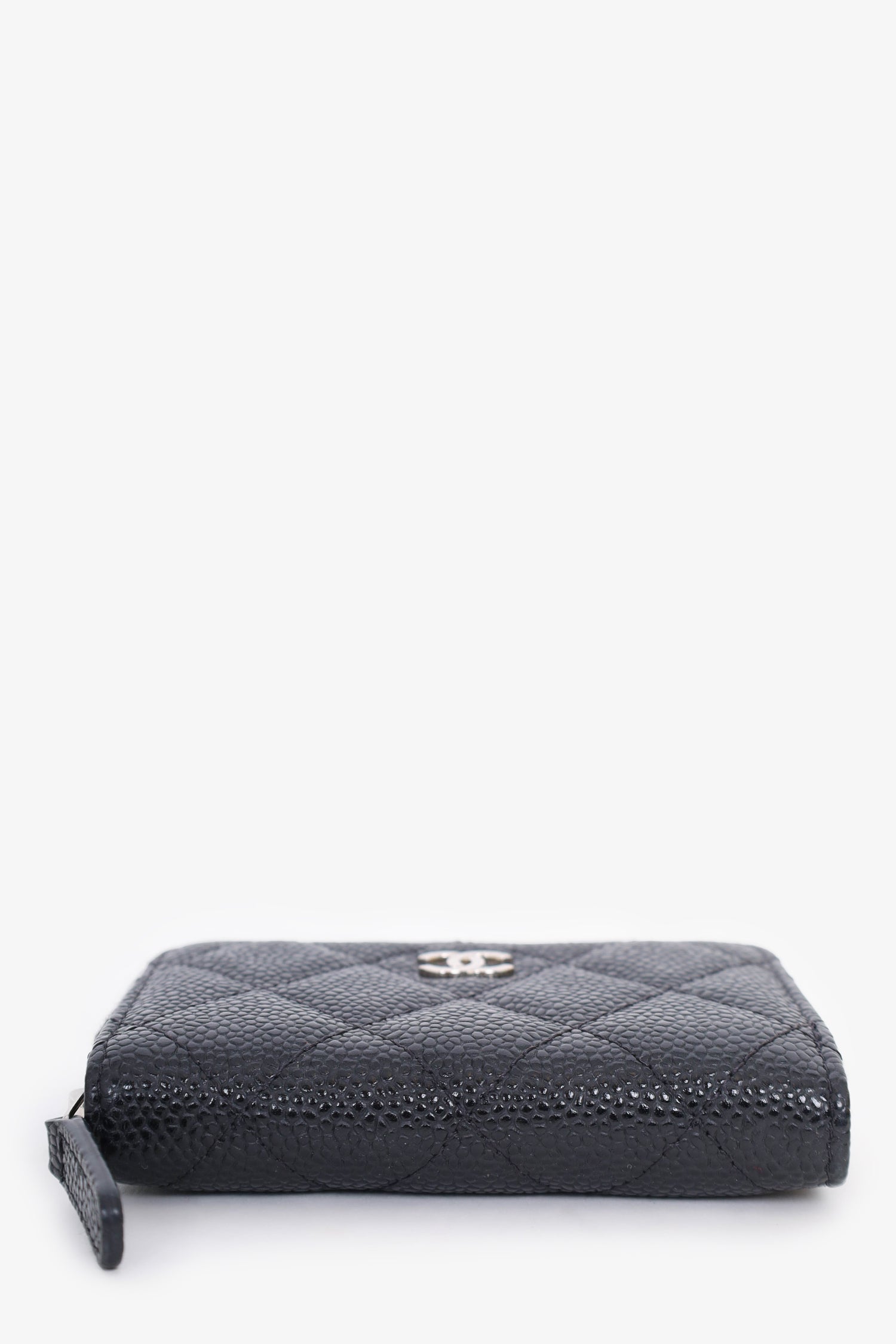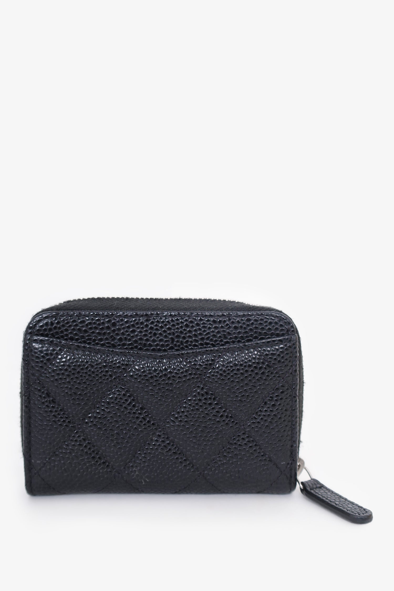 Pre-Loved Chanel™ 2021 Black Caviar ZIP Cardholder. Top zip closure. 3 interior card slip pockets. Silver-tone hardware. Rear exterior card slip pocket. Tonal stitching.