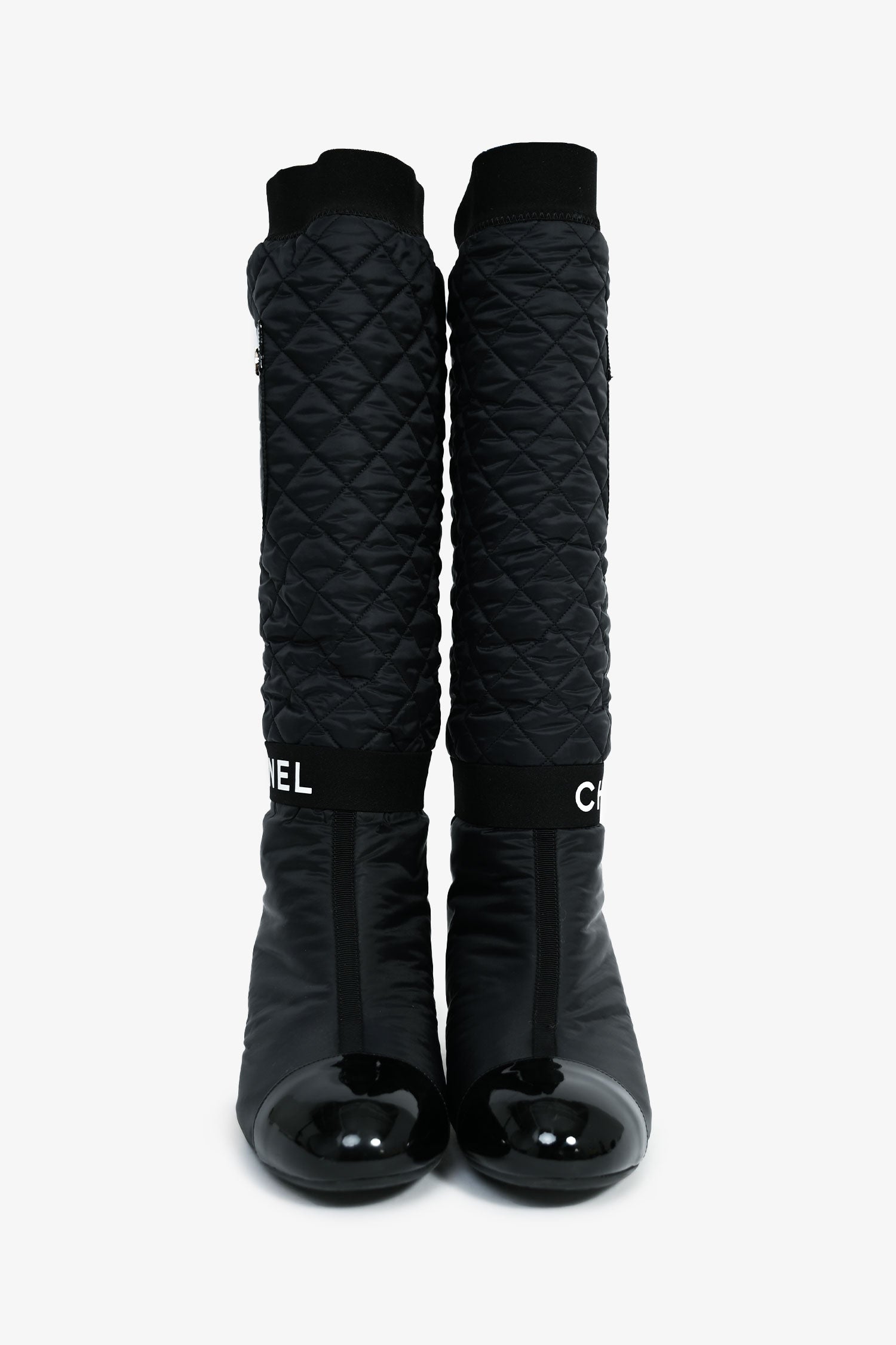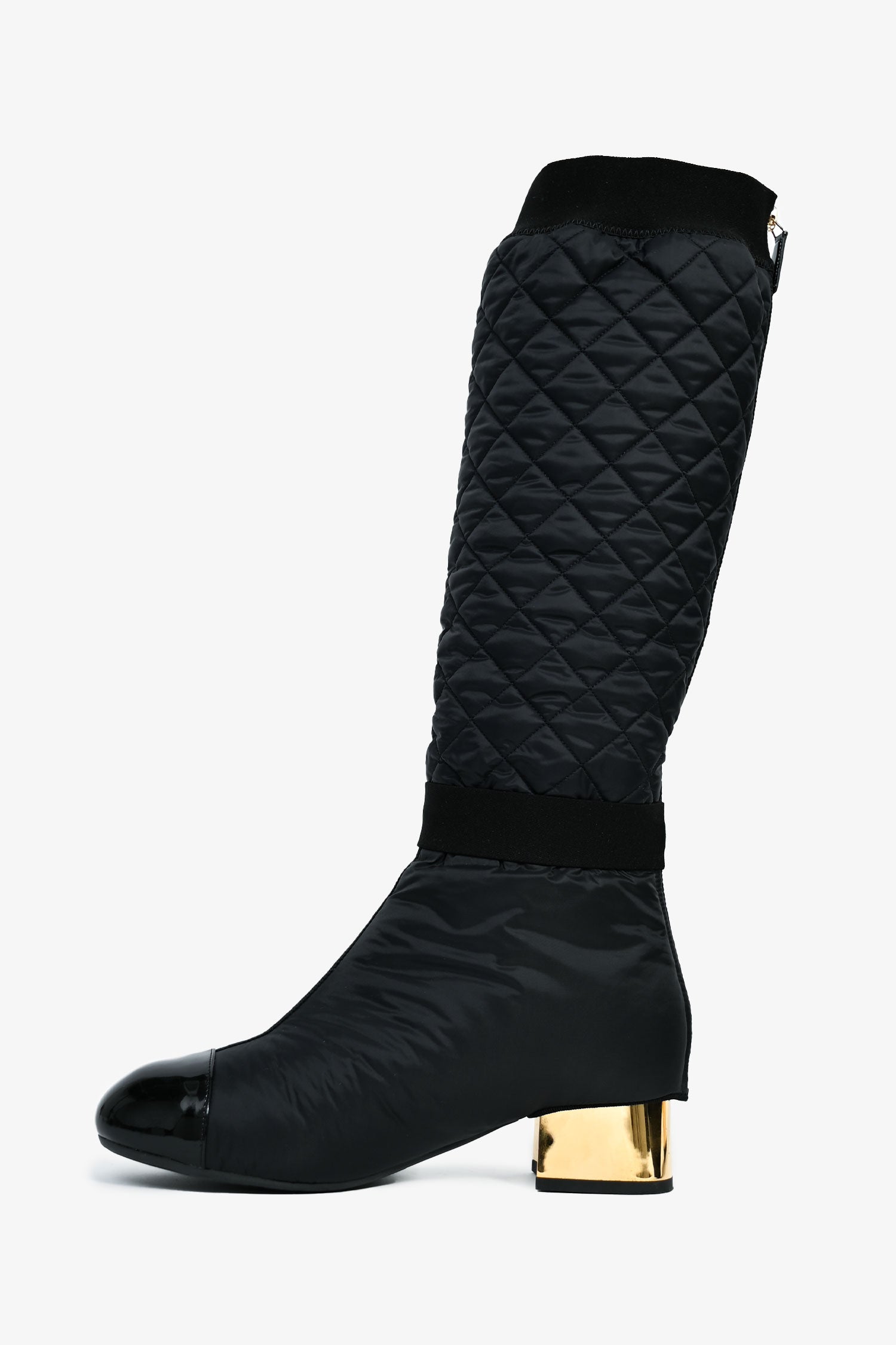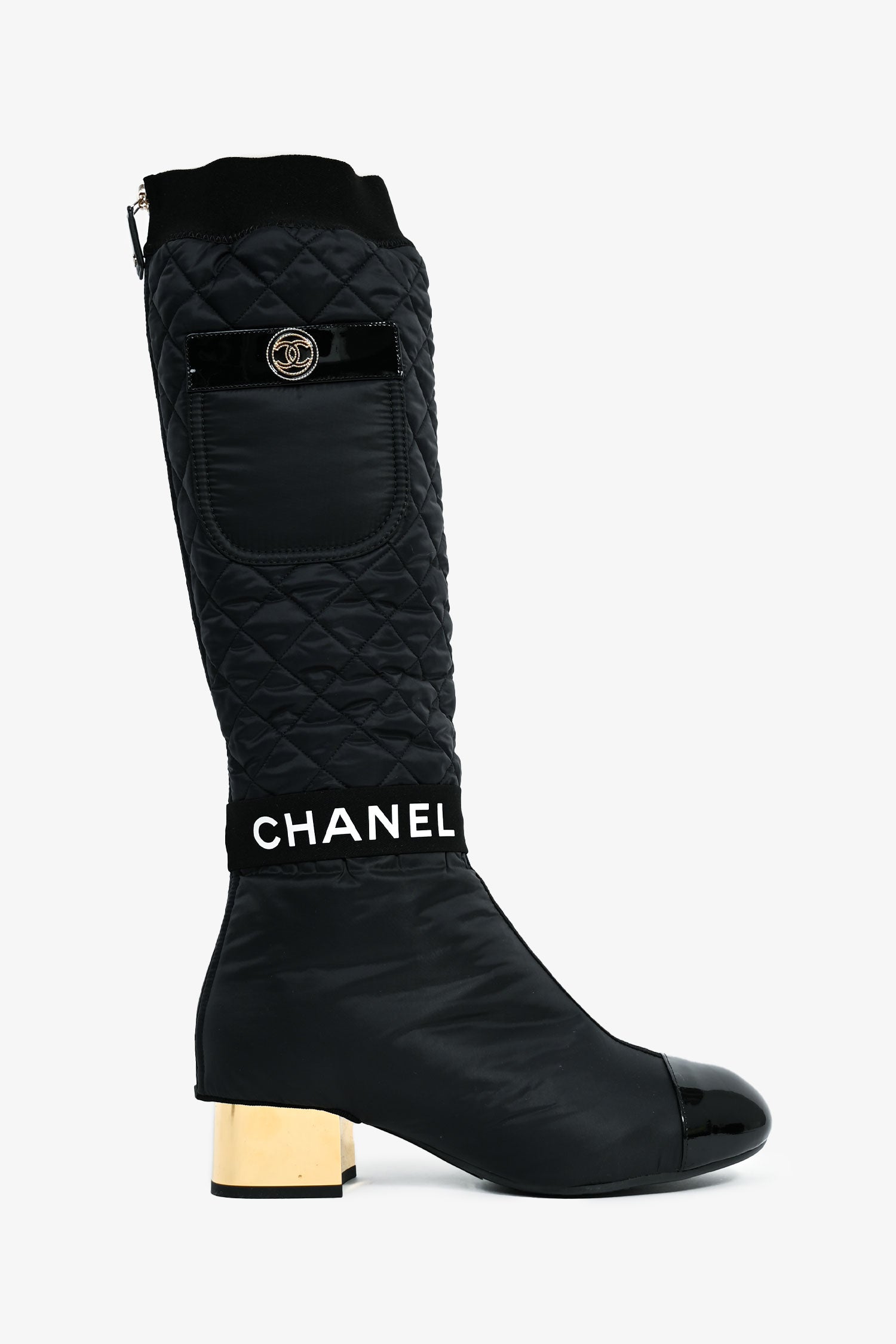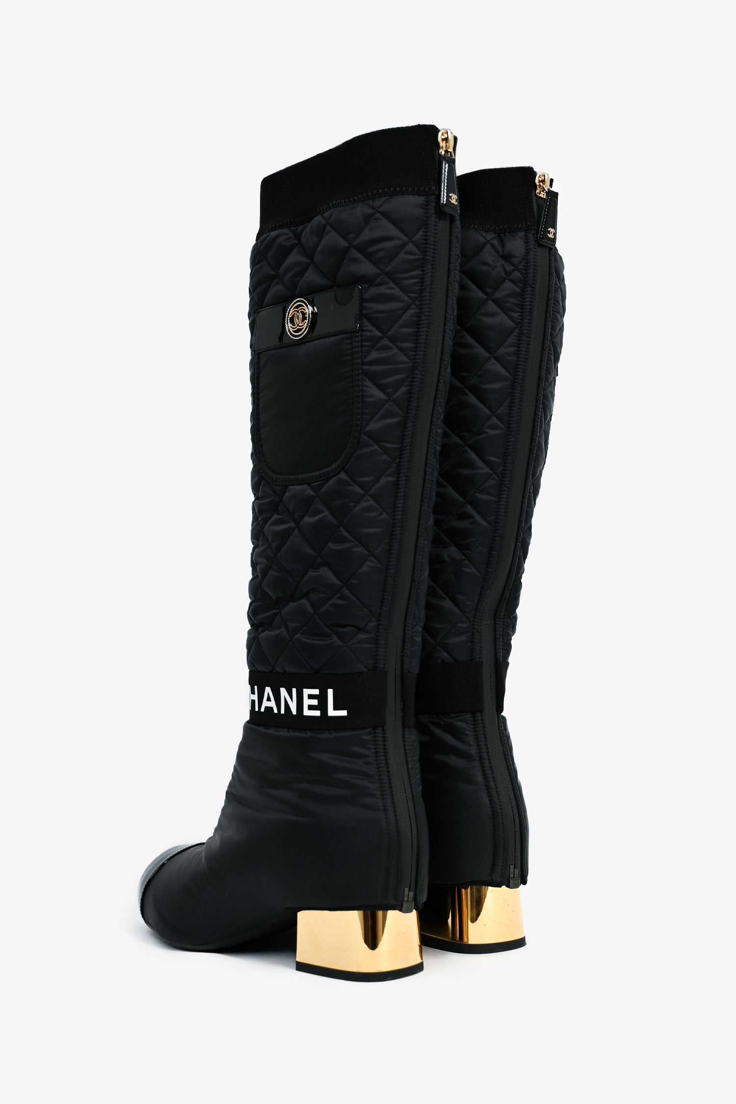 Refresh availabilityPre-Loved Chanel™ 2021 Black/ Gold Quilted Nylon Rain Boots. Almond toe. Rear zipper closure. Side slip pocket. Top elasticized band. Removable quilted layer. Gold-tone hardware. Tonal stitching.