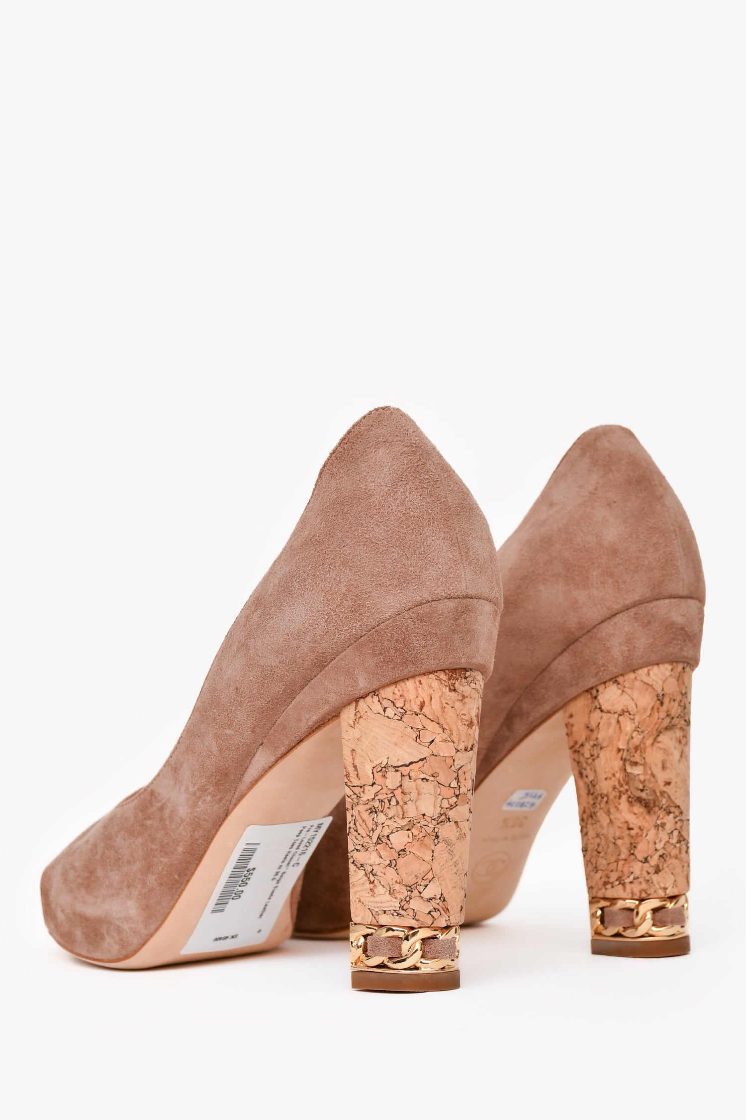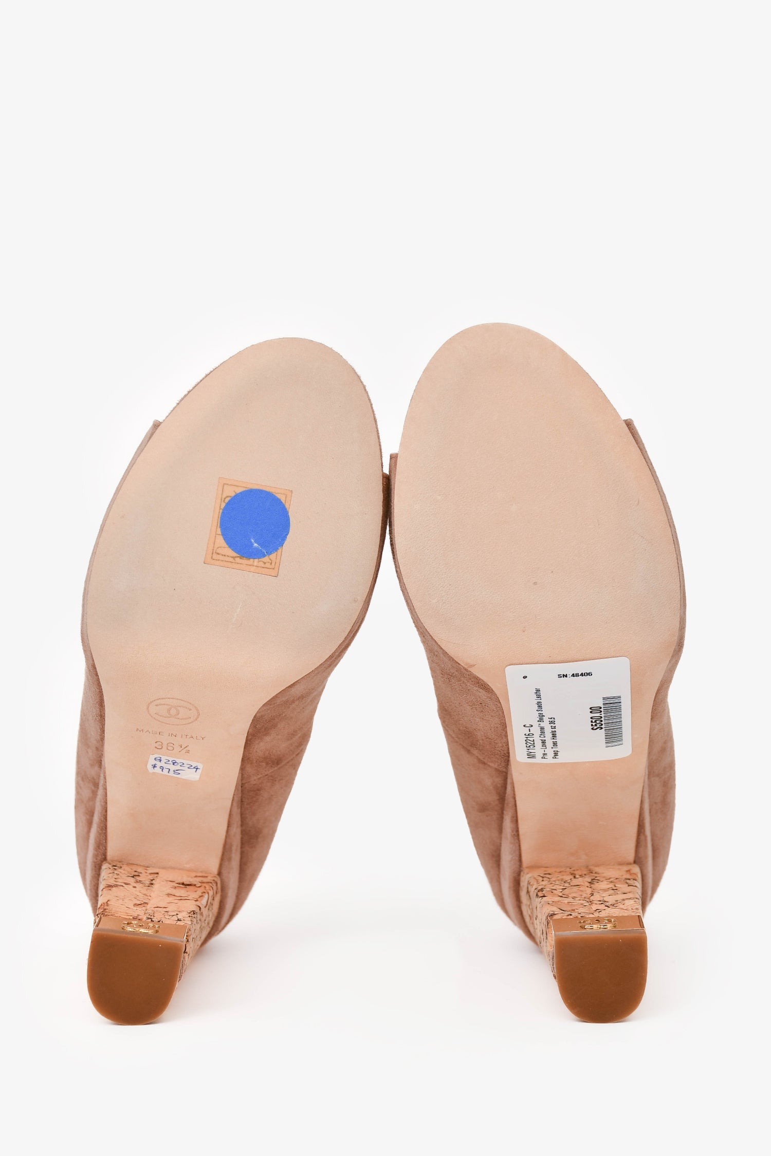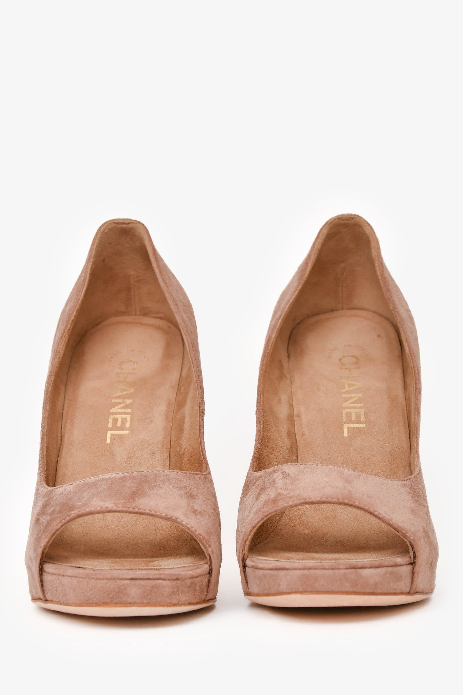 Refresh availabilityPre-Loved Chanel™ Beige Suede Leather Peep Toes Heels. Open toe. Slip-on design. Gold-tone detailing on the bottom heel. Tonal stitching.