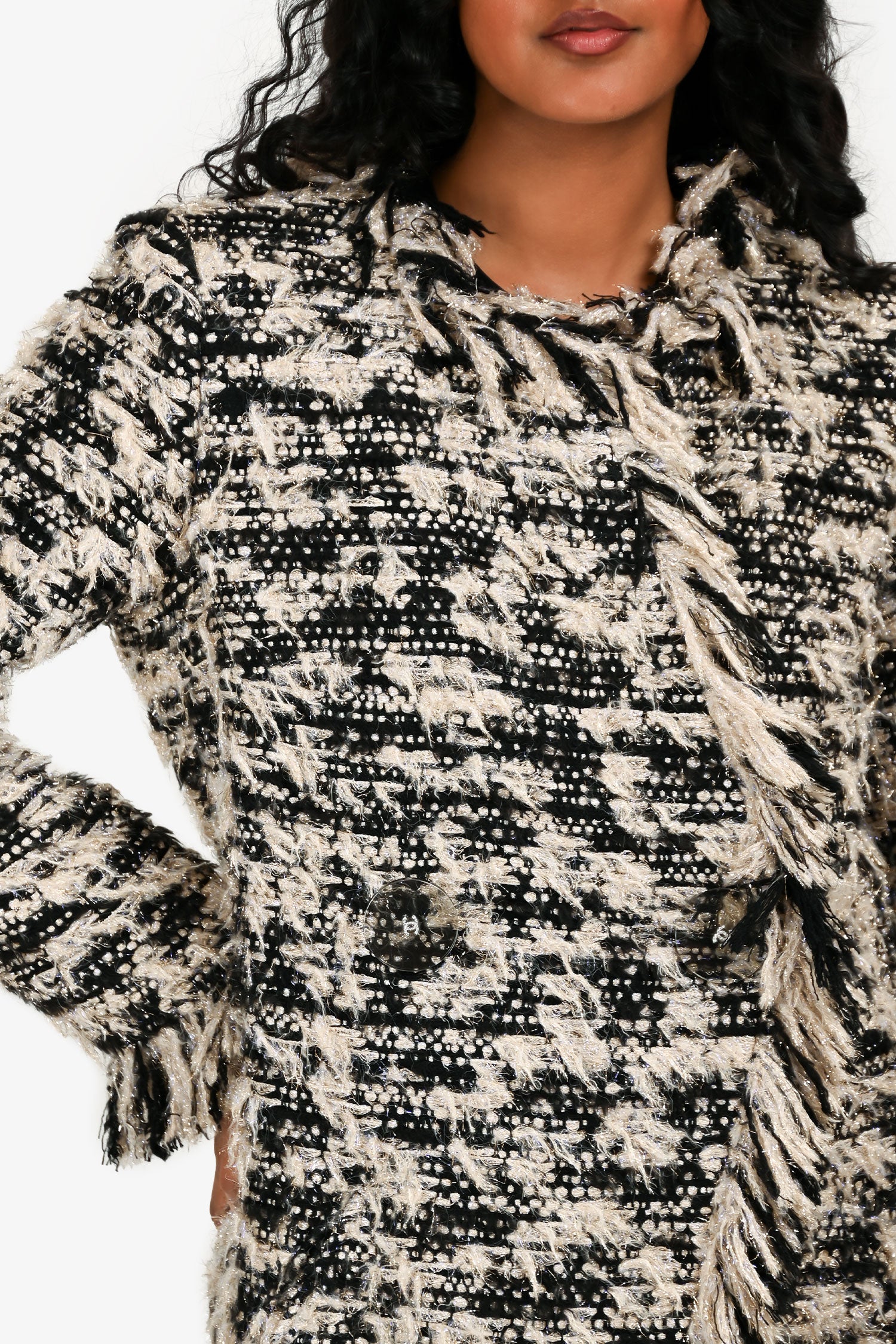 Refresh availabilityPre-Loved Chanel™ Black/Gold Metallic Tweed Fringed Midi Coat. Open front with single button closure. Long sleeves. Two side pockets. Fully lined. Tonal stitching.