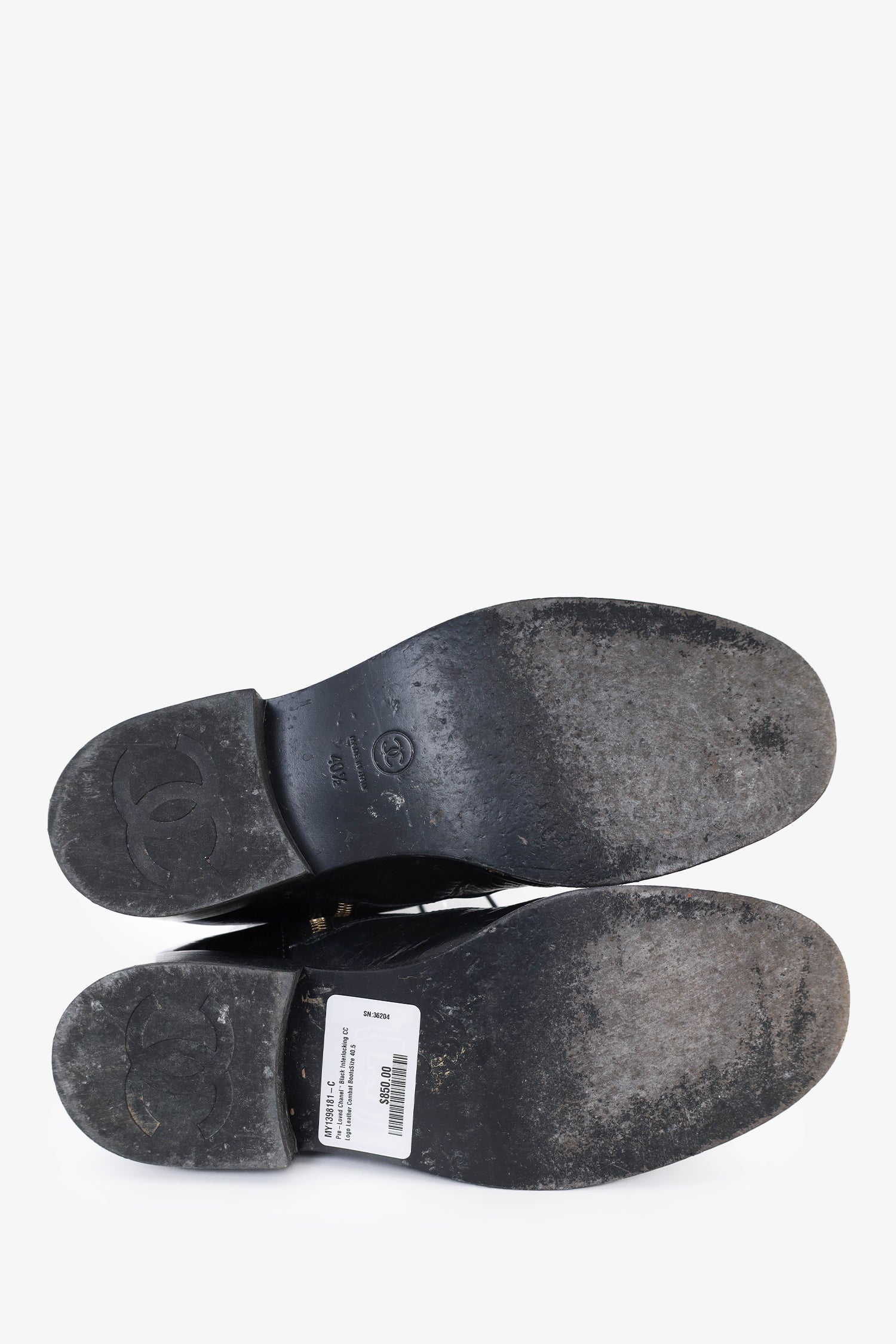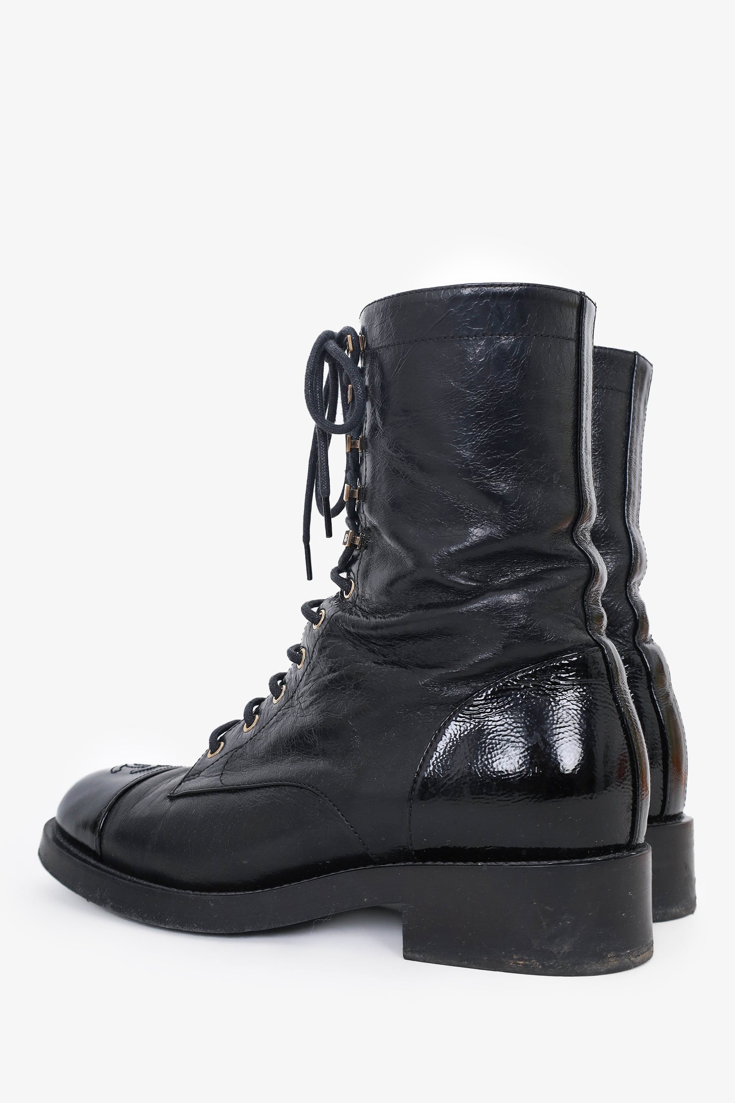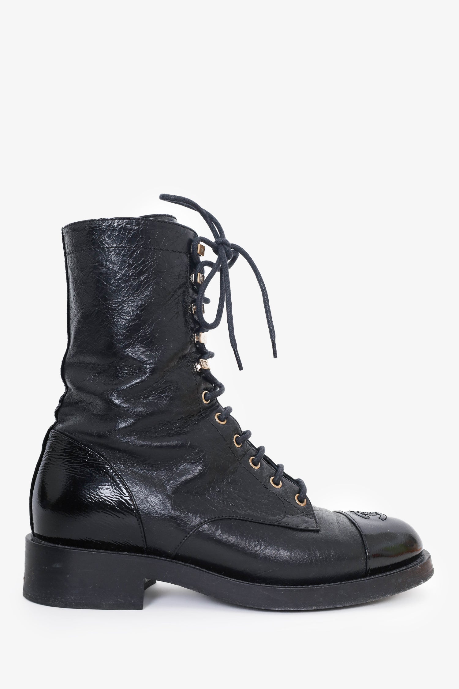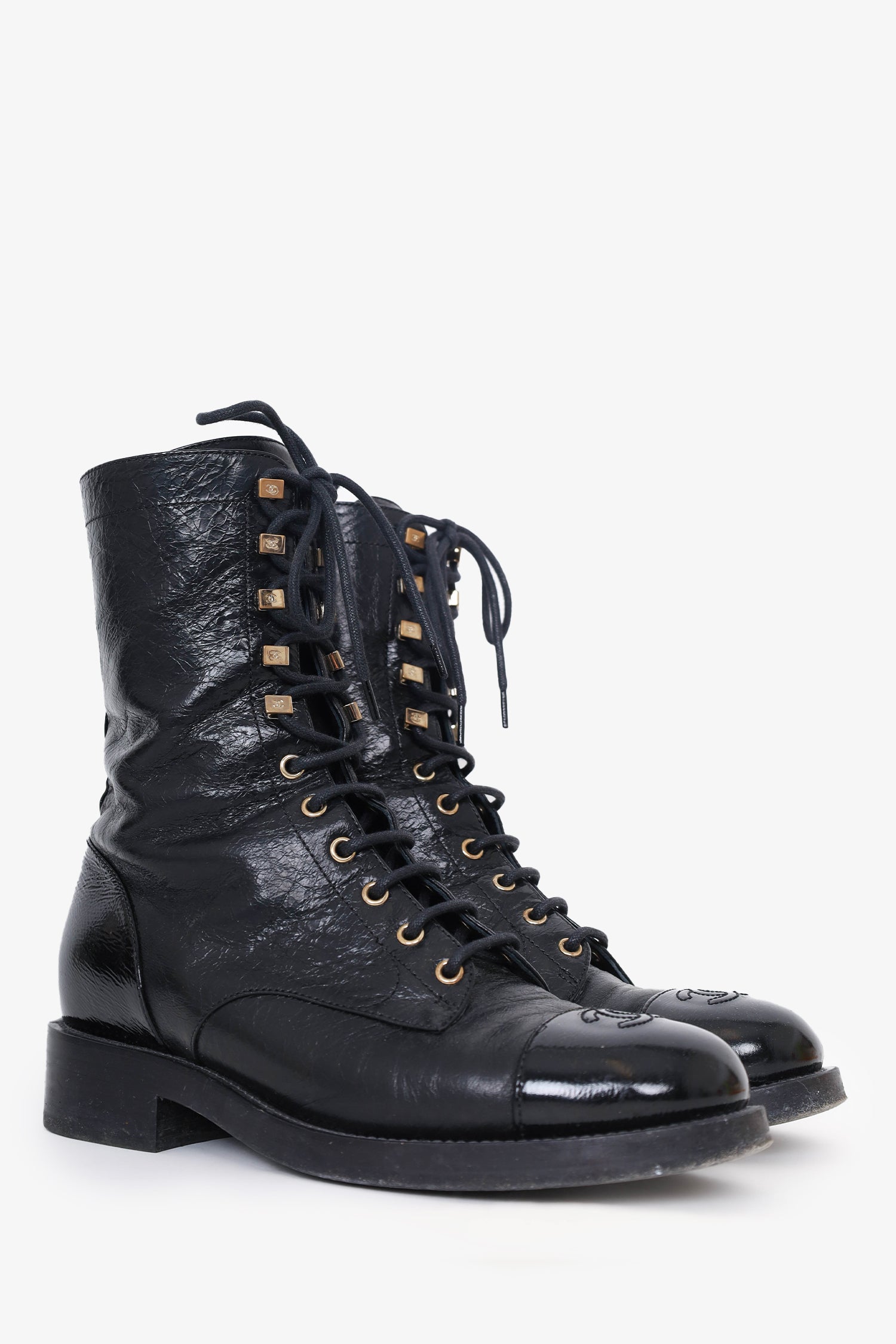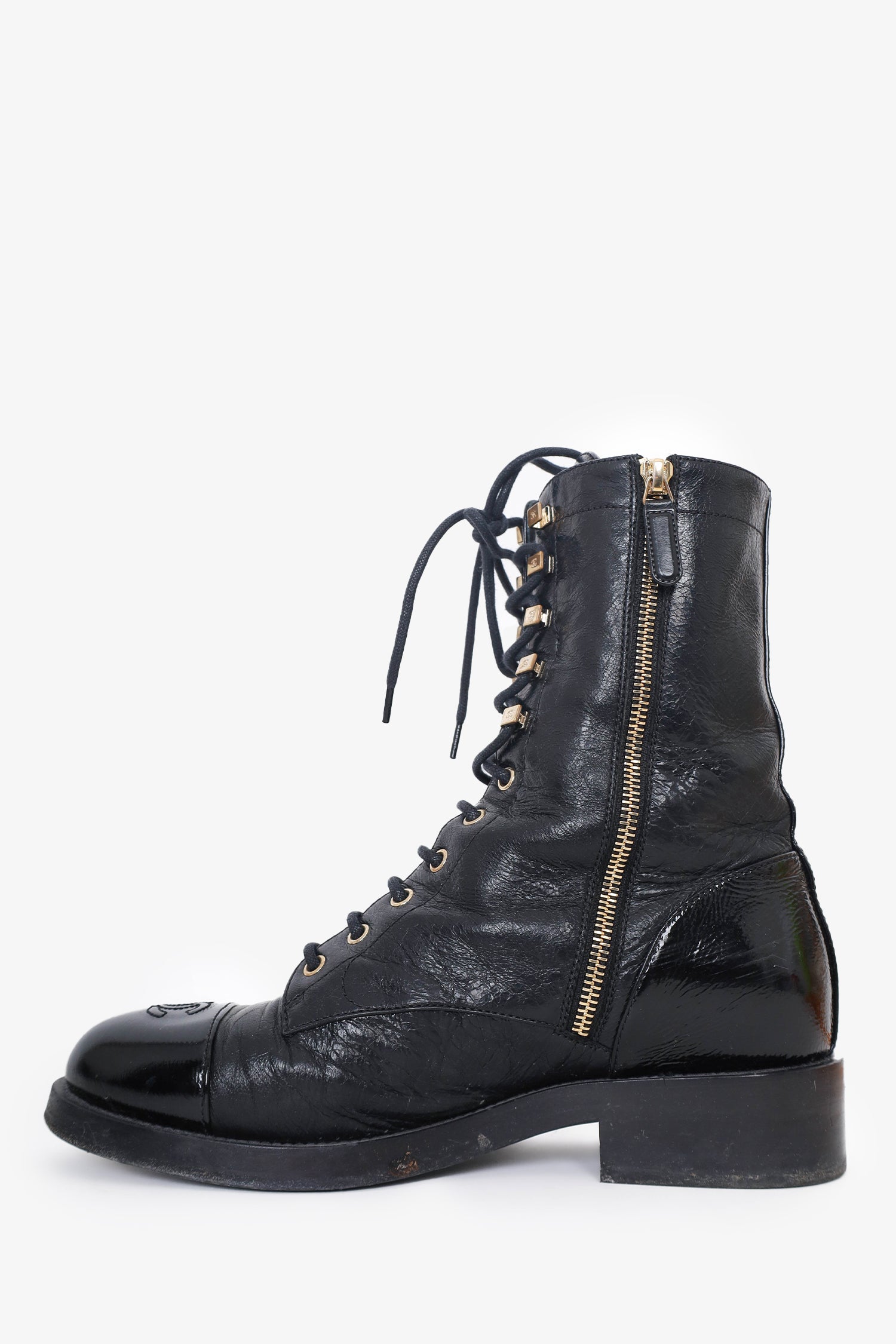 Refresh availabilityPre-Loved Chanel™ Black Interlocking CC Logo Leather Combat Boots. Lace-up front. Side zip closure. Contrast patent toe with embroidered logo. Gold-tone hardware. Tonal stitching.