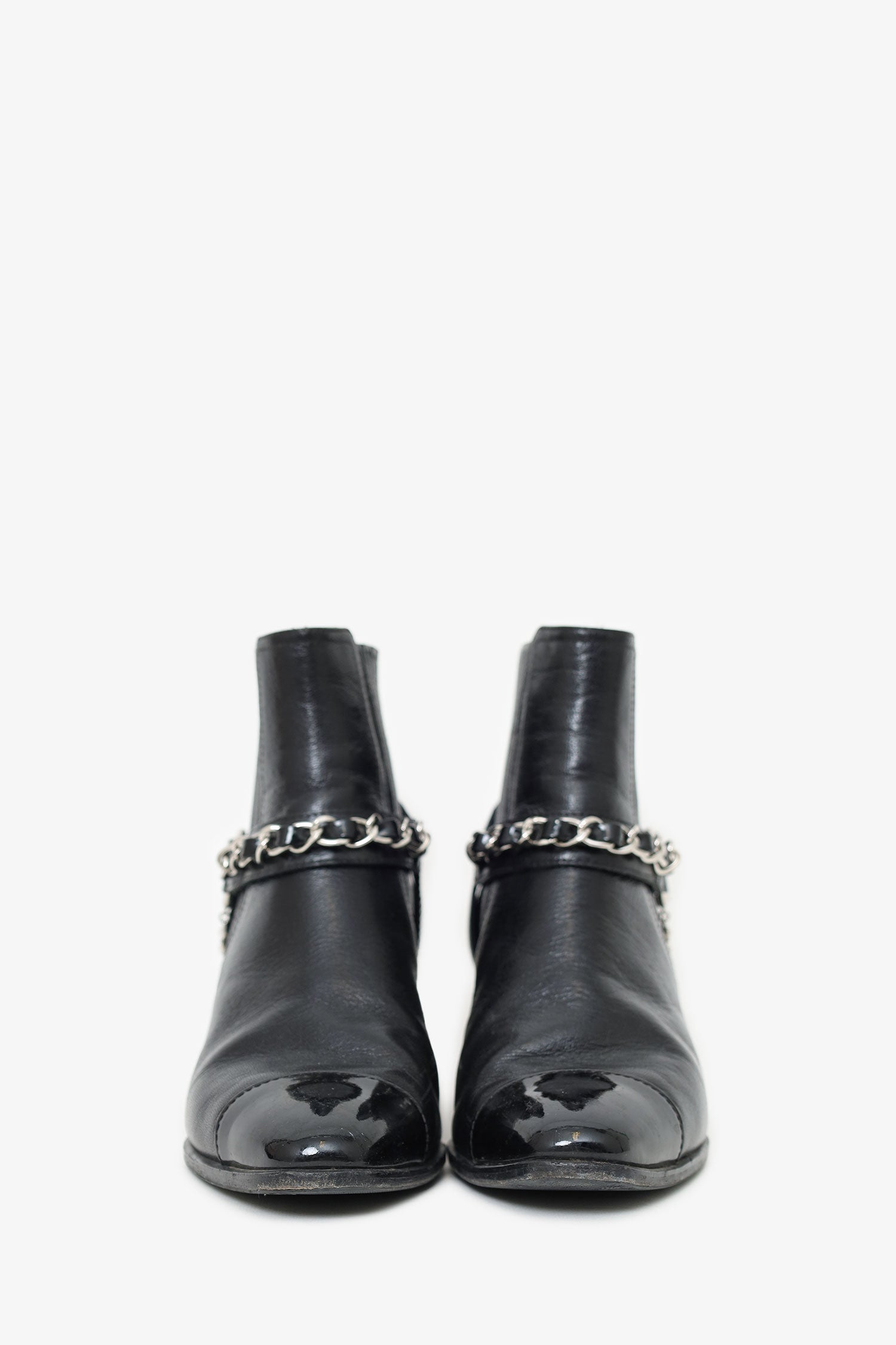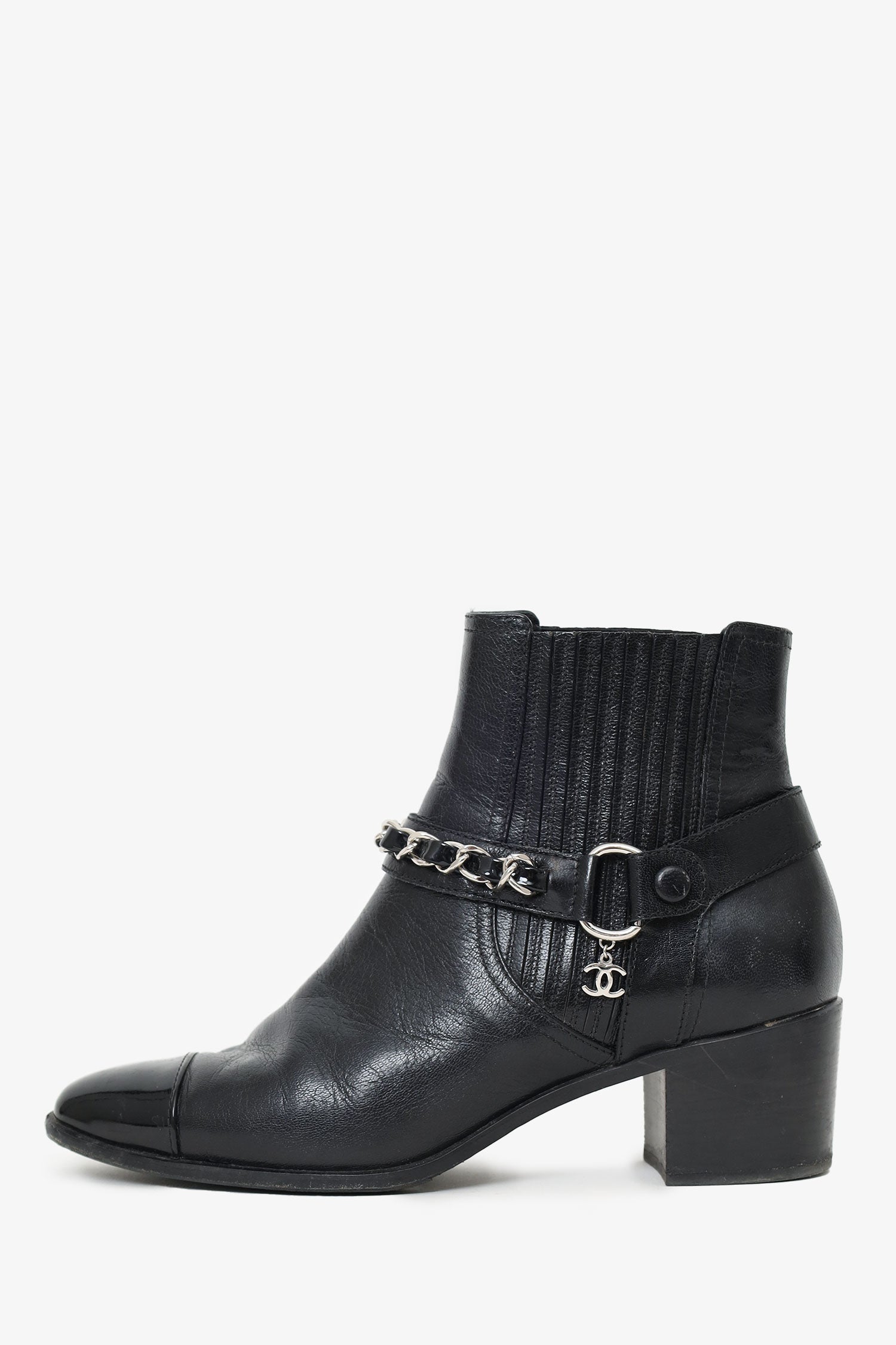 Refresh availabilityPre-Loved Chanel™ Black Patent Cap-Toe CC Moto Boots. Slip-on. Pointed toe. Attached wraparound chainlink strap on front, with charm and button closure. Elastic panels on both sides of shoe. Silver-tone hardware. Tonal stitching.