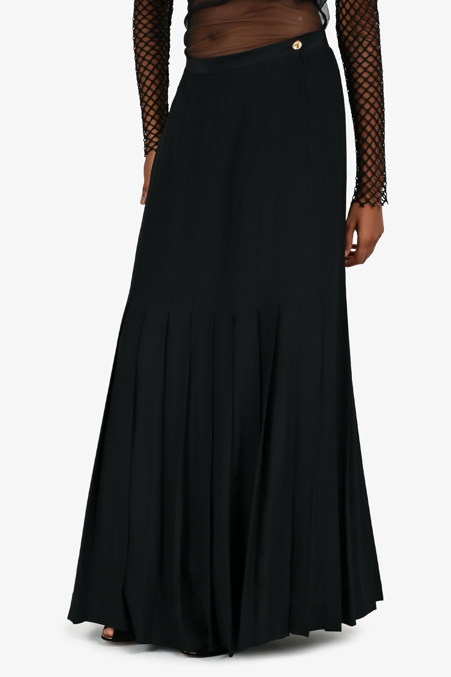 Pre-Loved Chanel™ Black Silk Pleated Maxi Skirt. Accordion pleats throughout. Side zip and button closure. Fully lined. Gold-tone hardware. Tonal stitching.