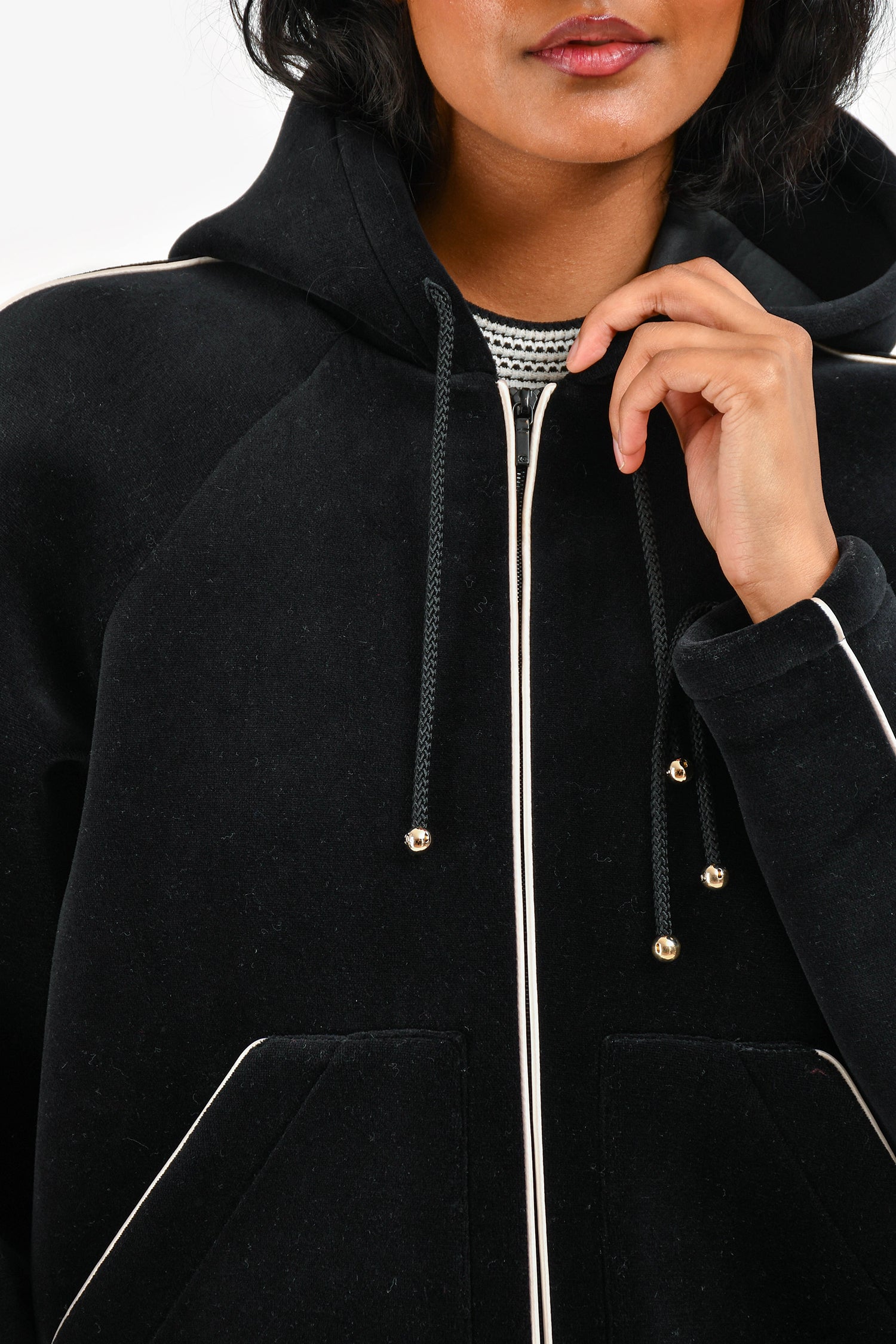 Refresh availabilityPre-Loved Chanel™ Black Velvet White Accent Scuba Jacket. Contrast white trim. Zip-up front. Long sleeves. Front pockets. Drawstring detail on the hood, hem and cuffs. Tonal stitching.