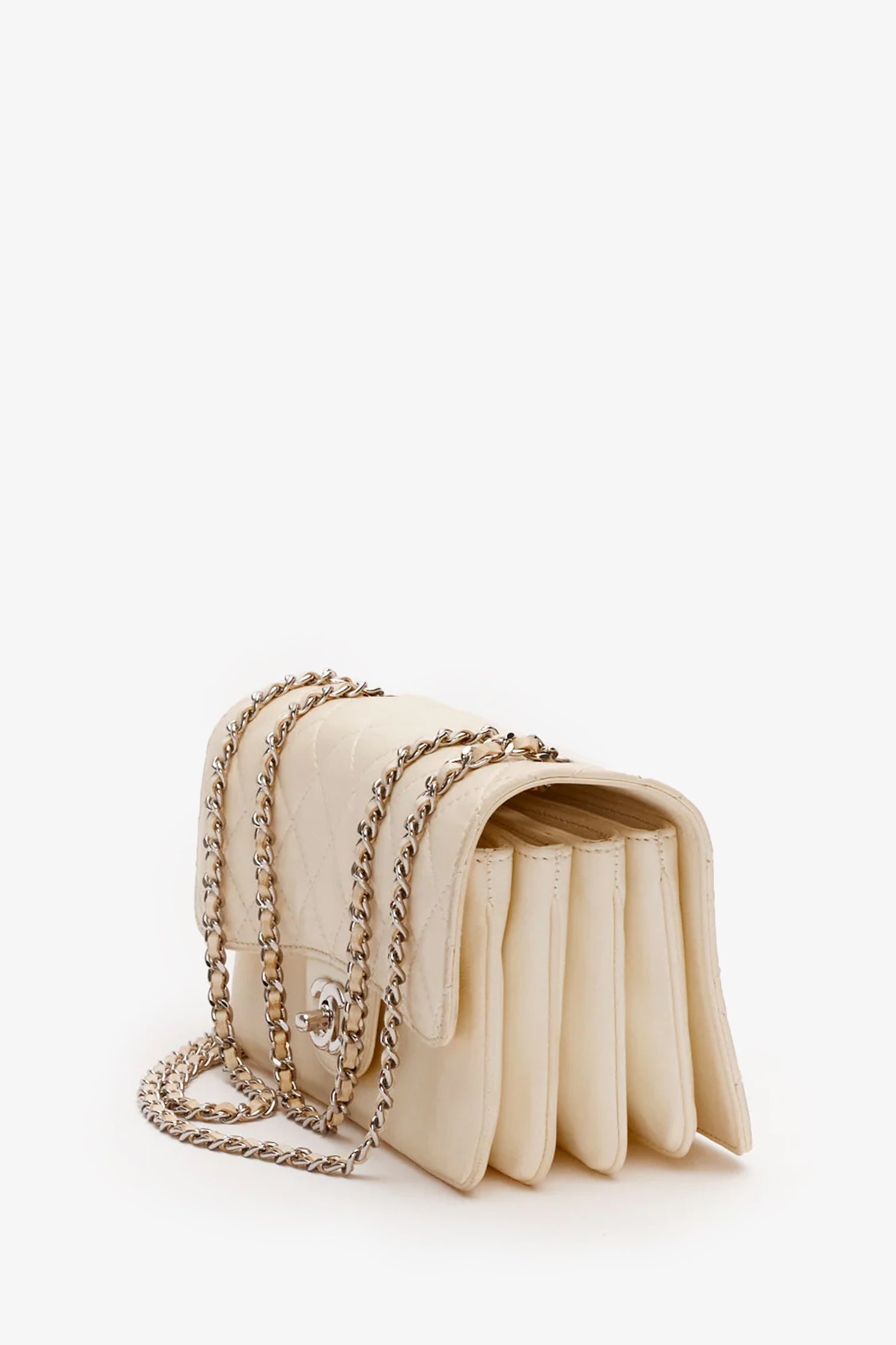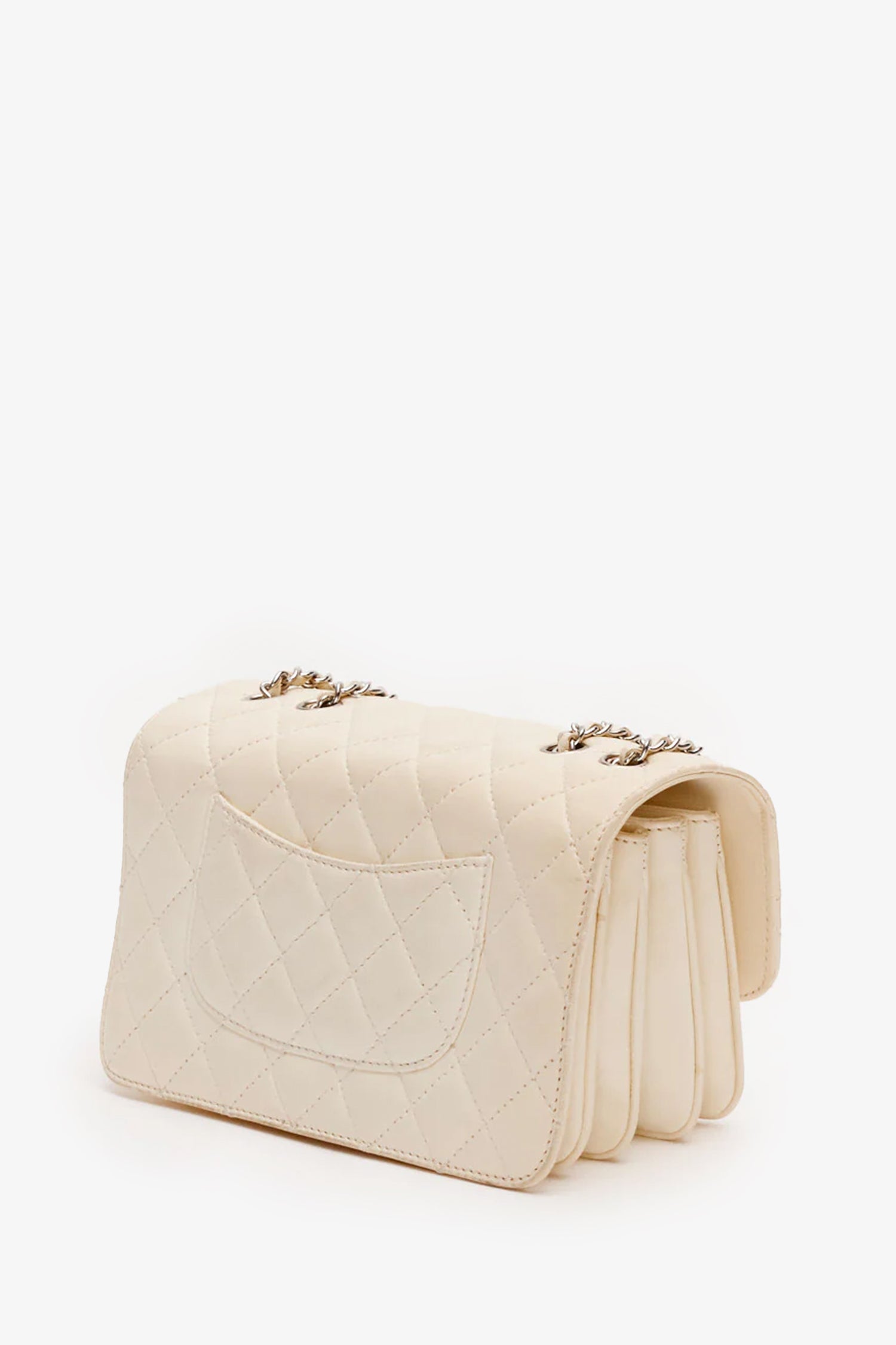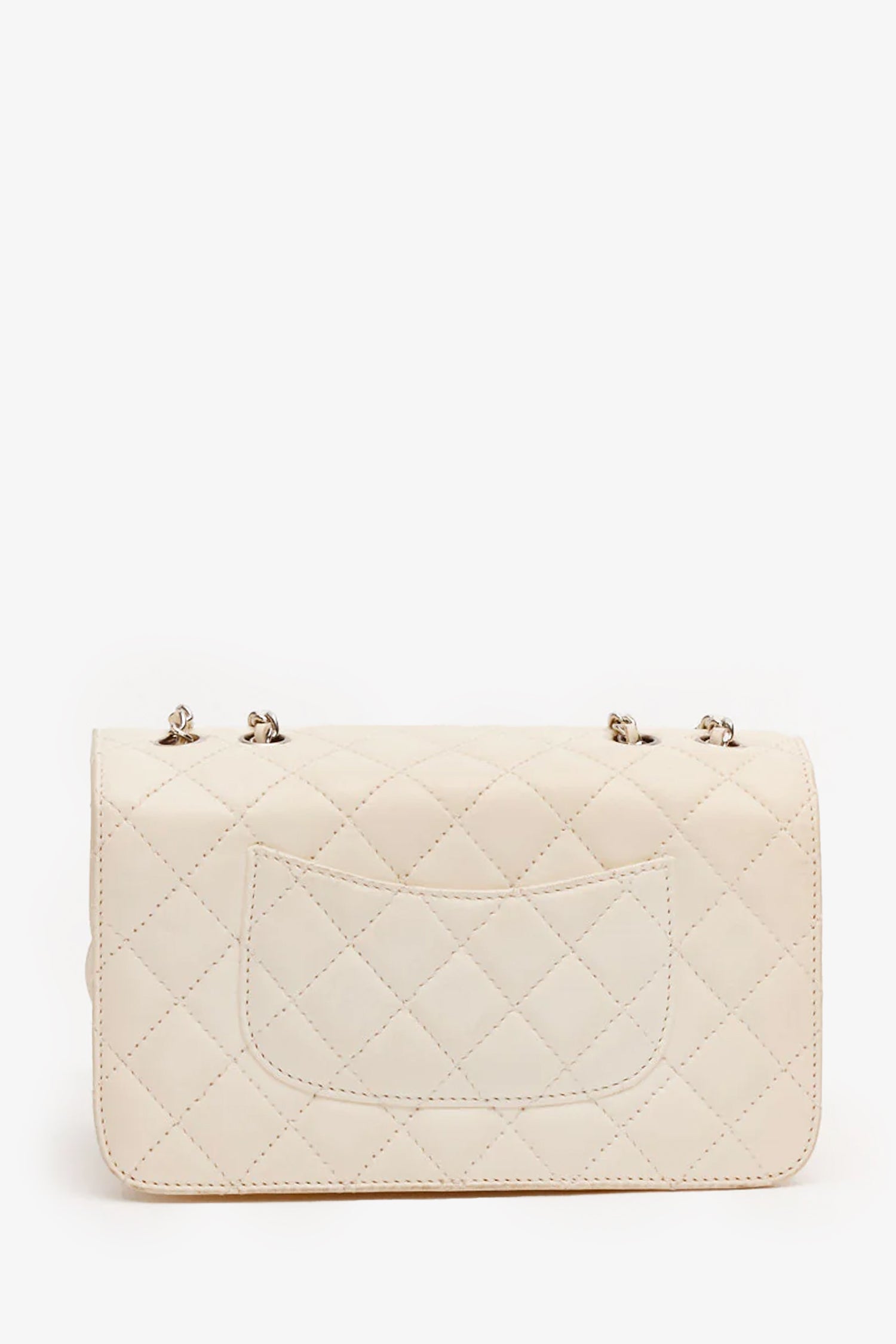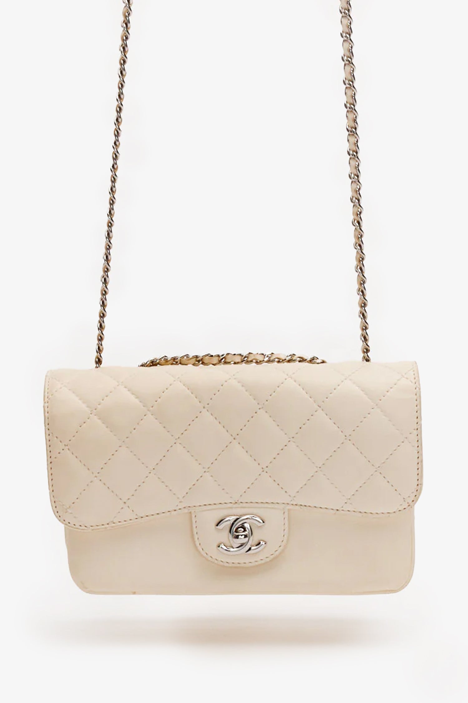 Refresh availabilityPre-Loved Chanel™ Cream Lambskin Timeless Bag. Front turn-lock closure. 4 interior compartments; 2 with zip closure and 2 open. Single rear slip pocket. Silver-tone hardware. Tonal stitching.