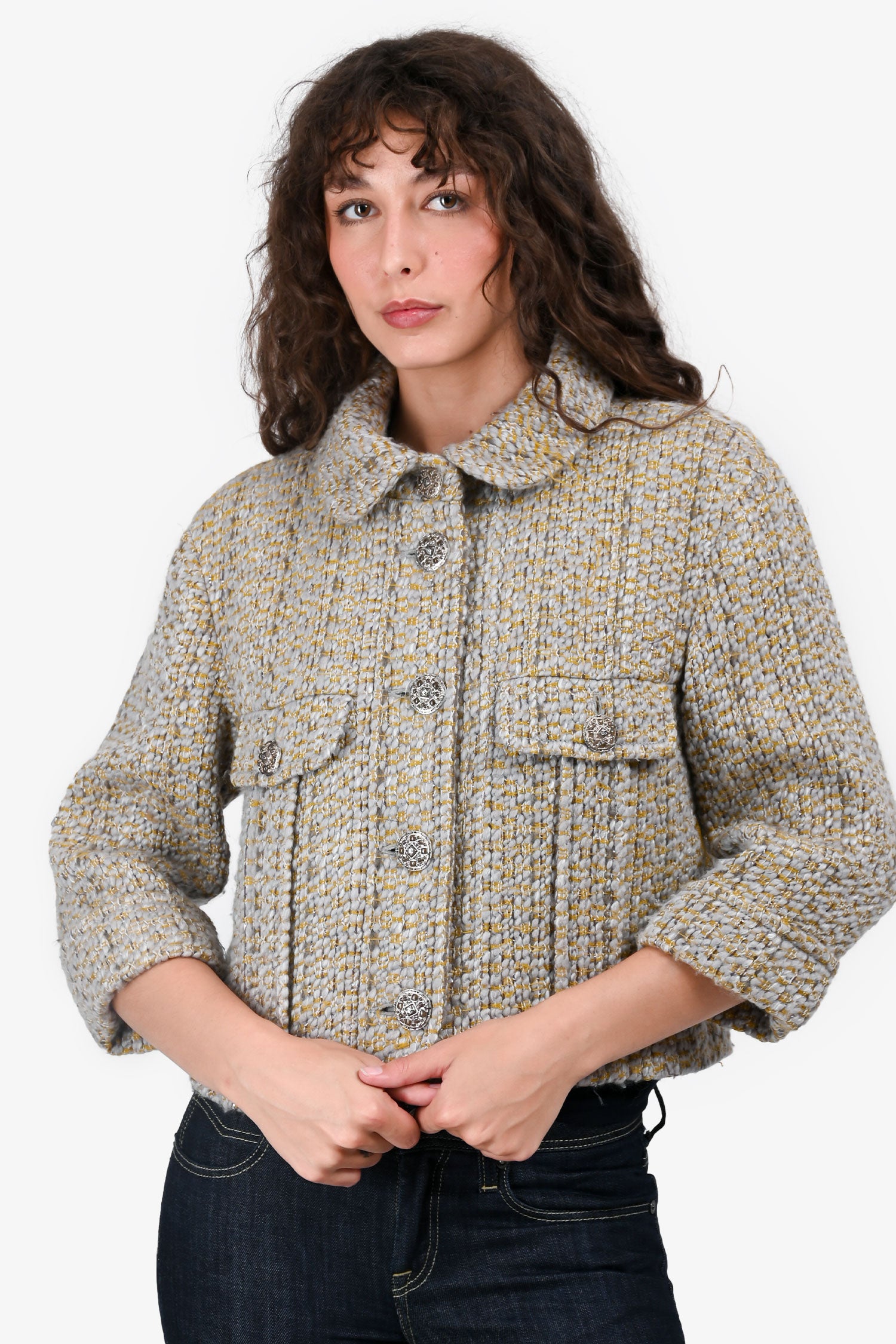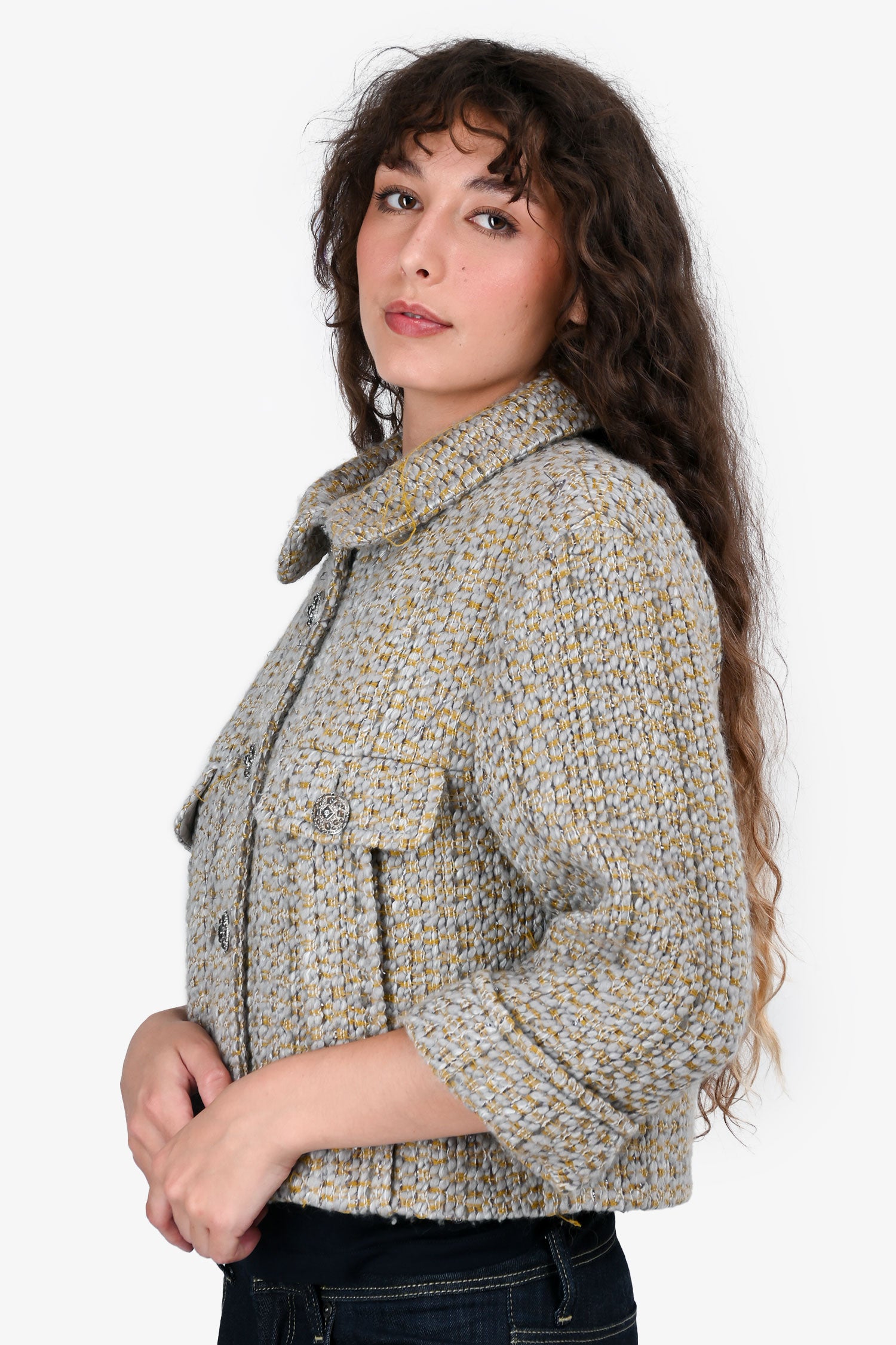 Refresh availabilityPre-Loved Chanel™ Grey/Green Tweed 3/4 Sleeve Cropped Blazer. Front button closure. Cropped silhouette. Front flap pockets. Side pockets. Tonal stitching.