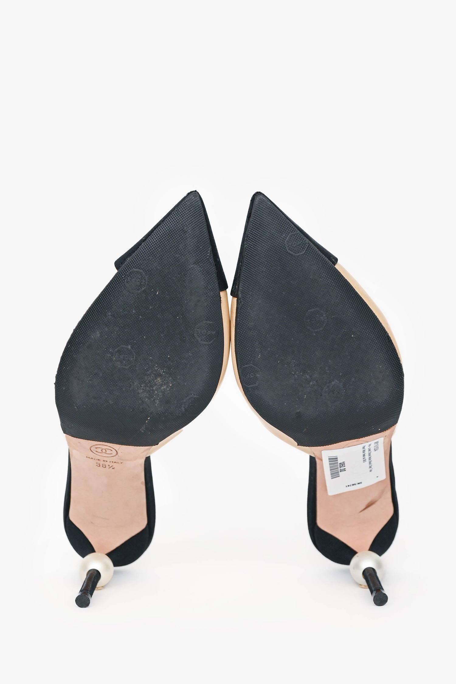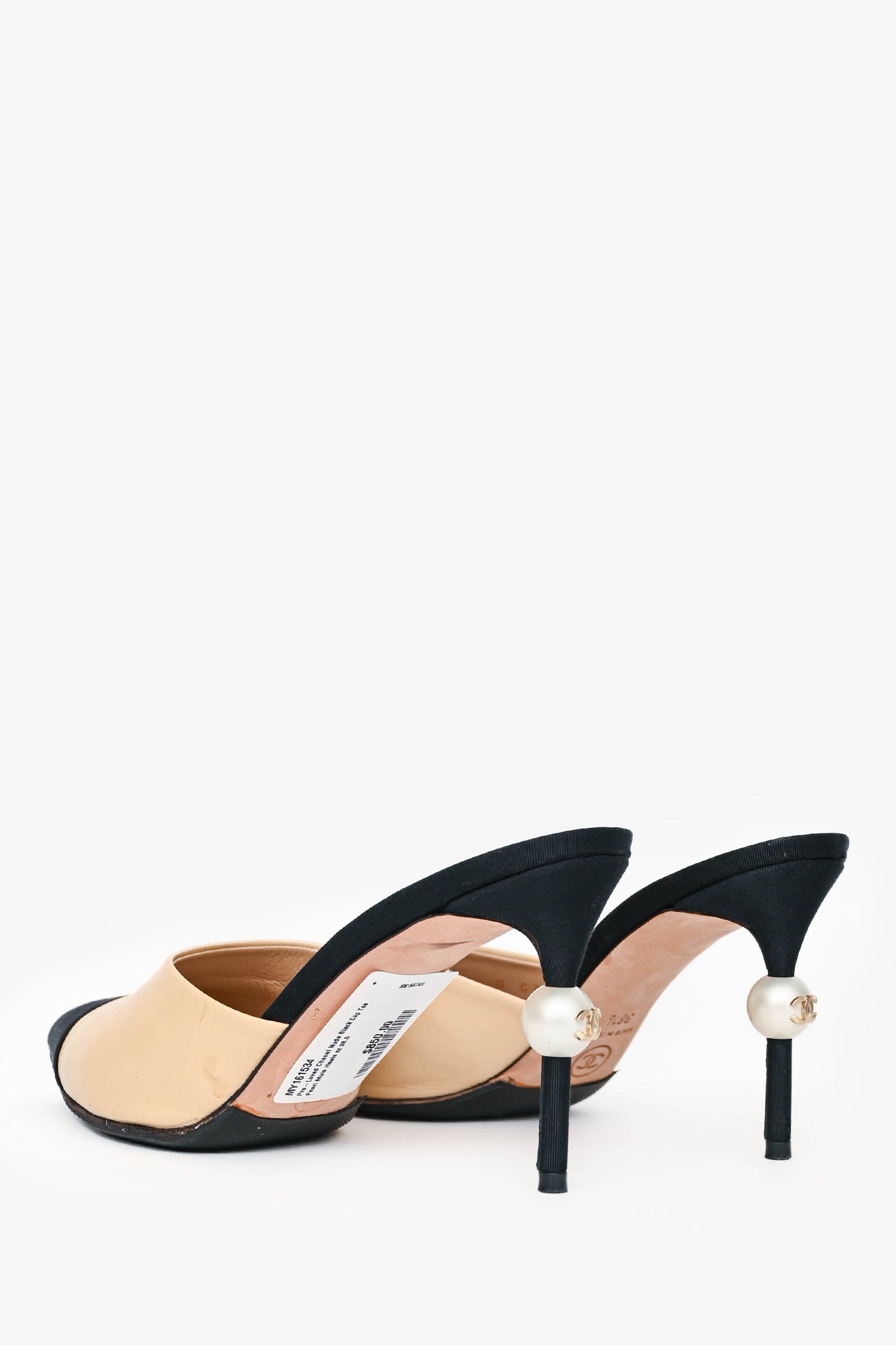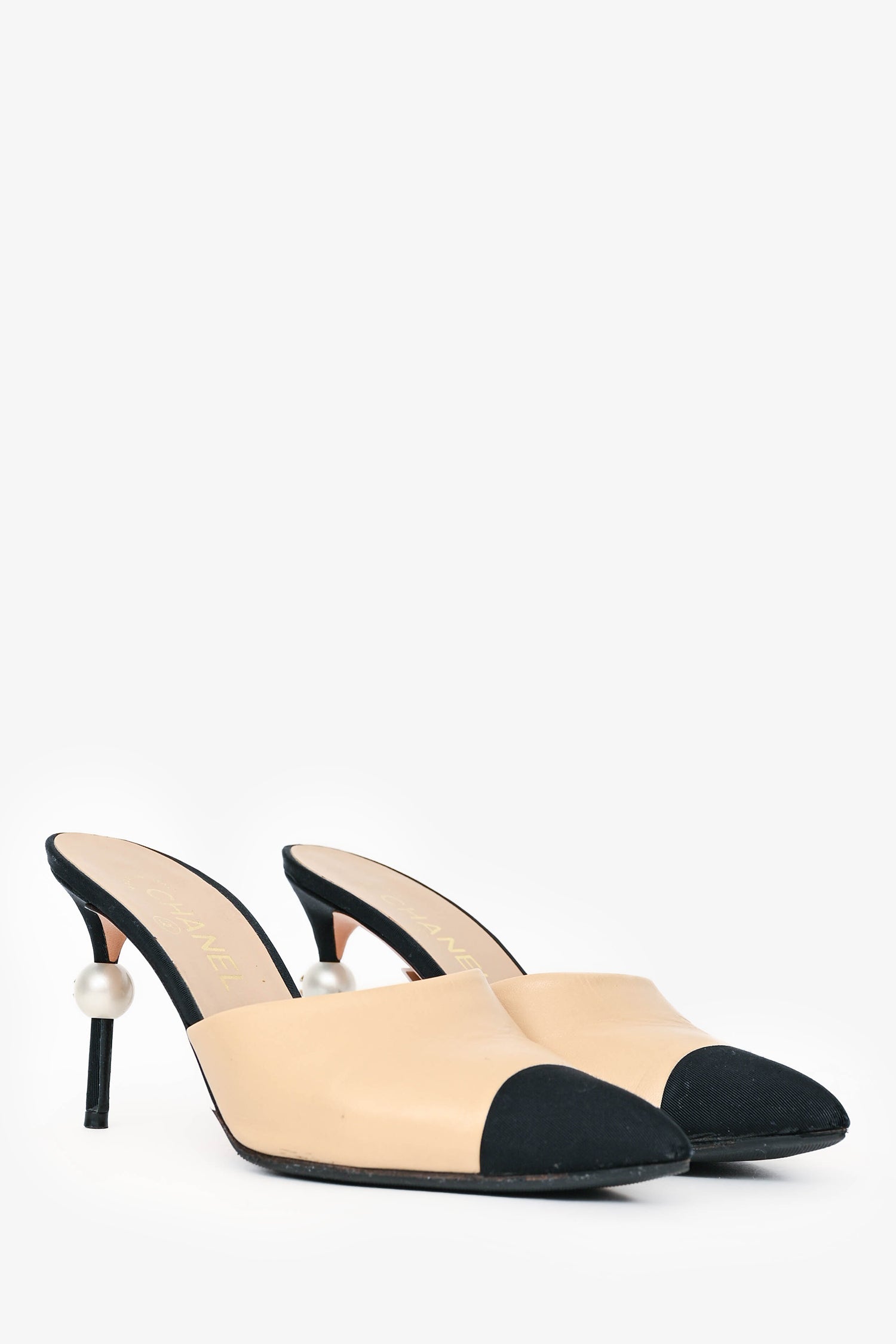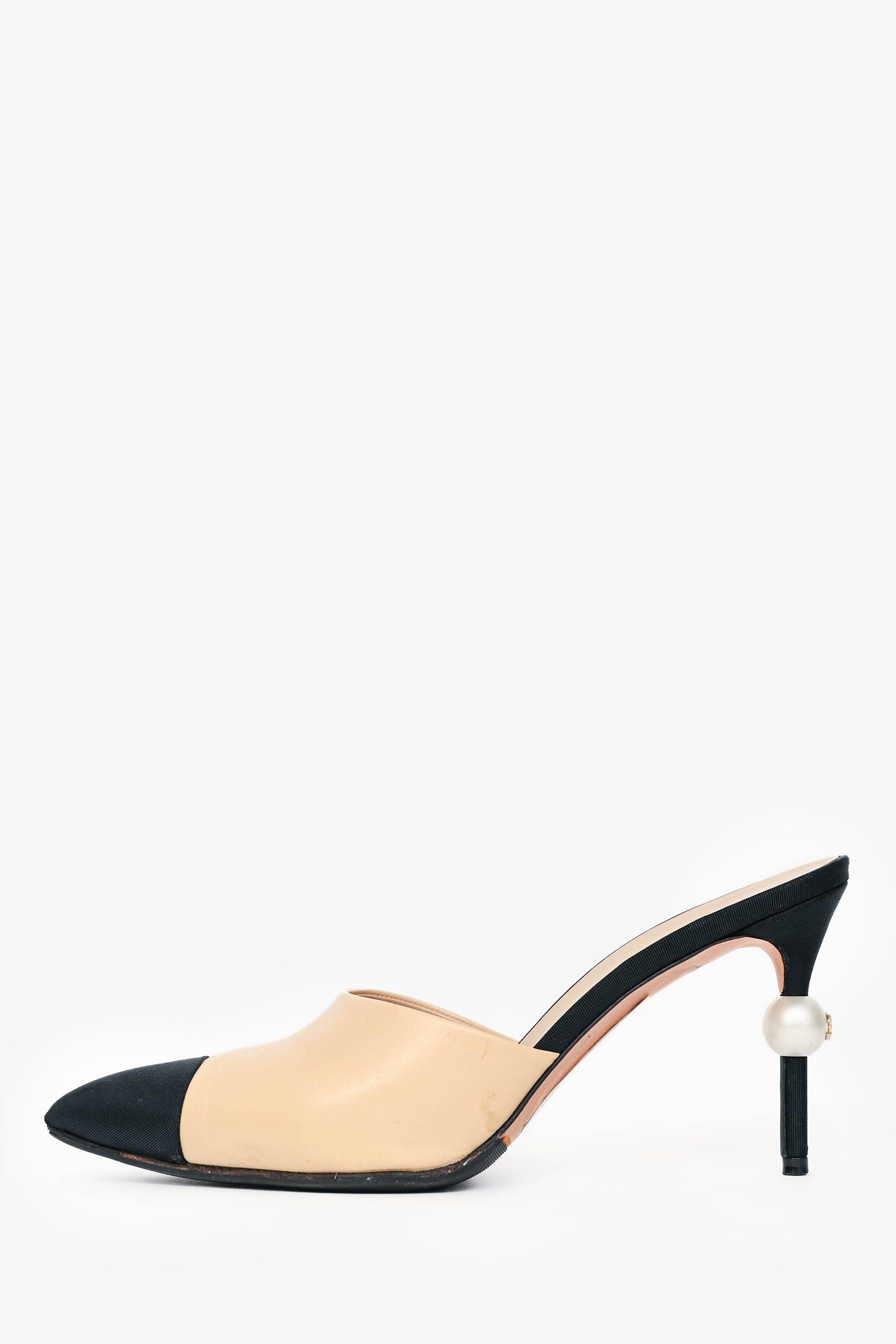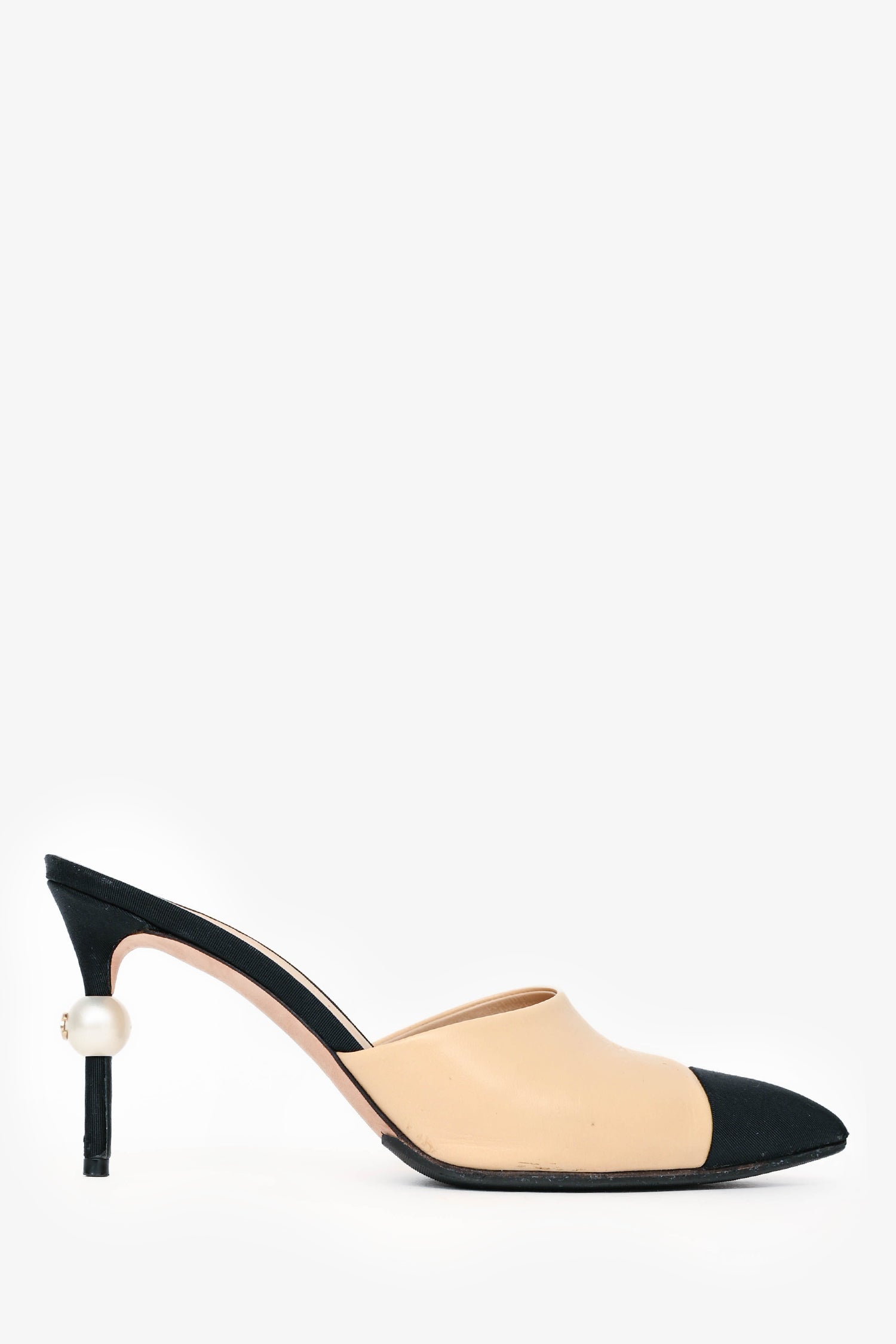 Refresh availabilityPre-Loved Chanel Nude Black Cap Toe Pearl Mule Heels. Pointed toe. Leather insole. Pearl embellished heel. Tonal stitching.