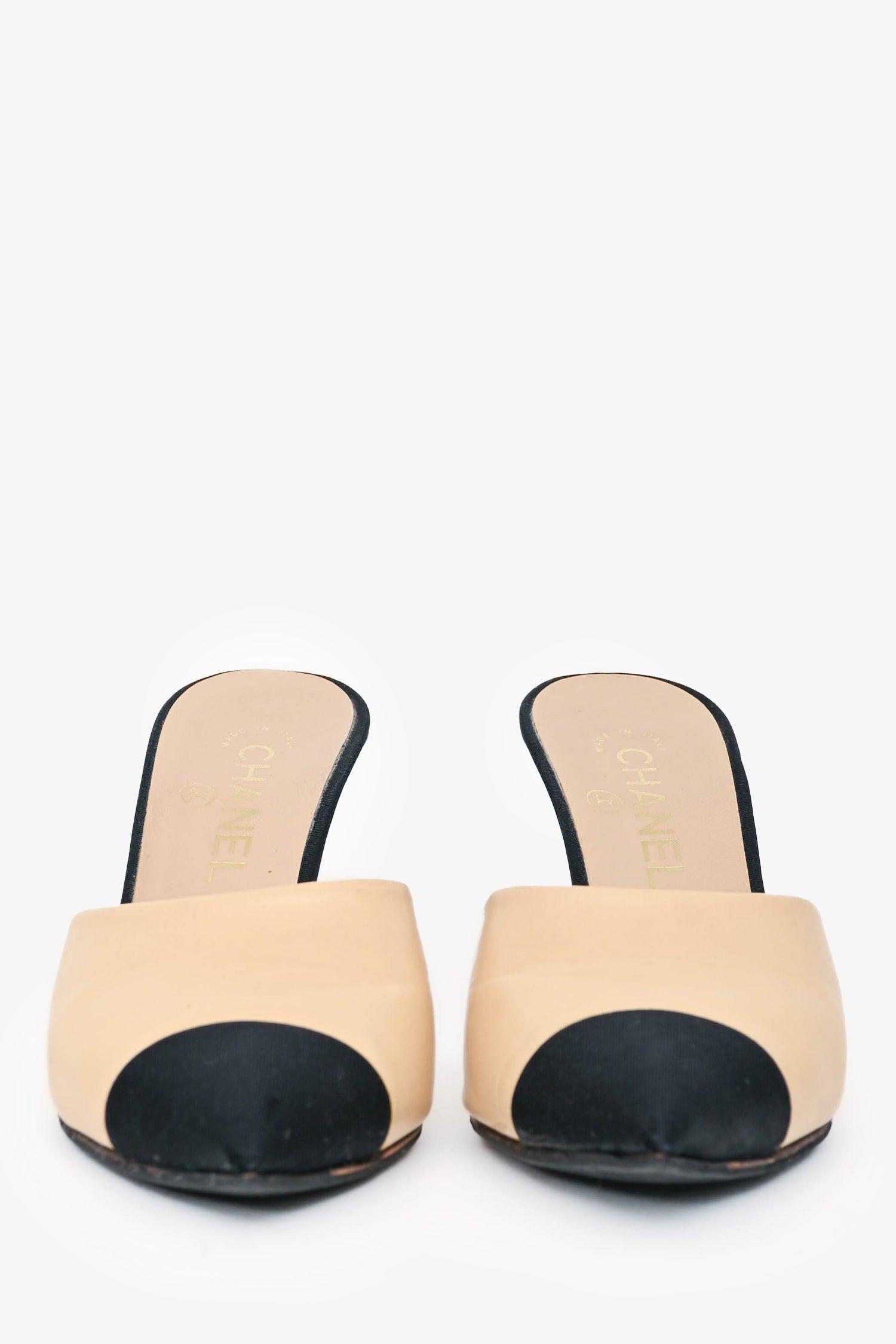 Pre-Loved Chanel Nude Black Cap Toe Pearl Mule Heels Size 38.5
