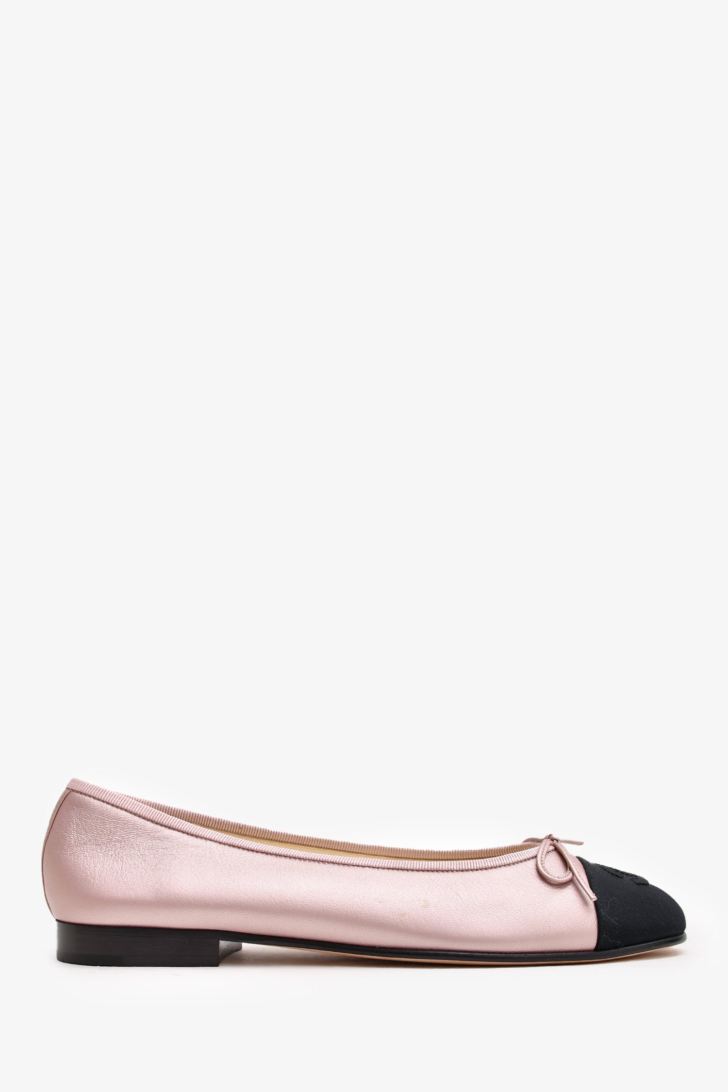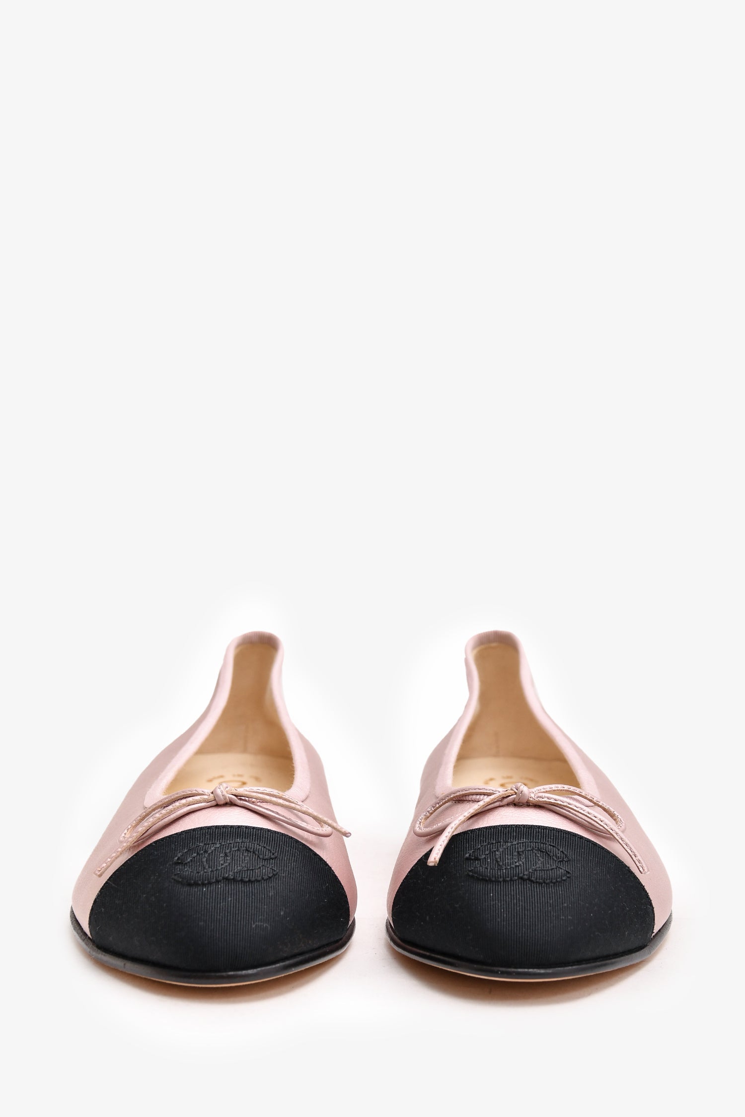 Refresh availabilityPre-Loved Chanel™ Pink/Black Leather CC Logo Ballet Flats. Toe cap logo. Small silk bow at the toe. Tonal stitching.