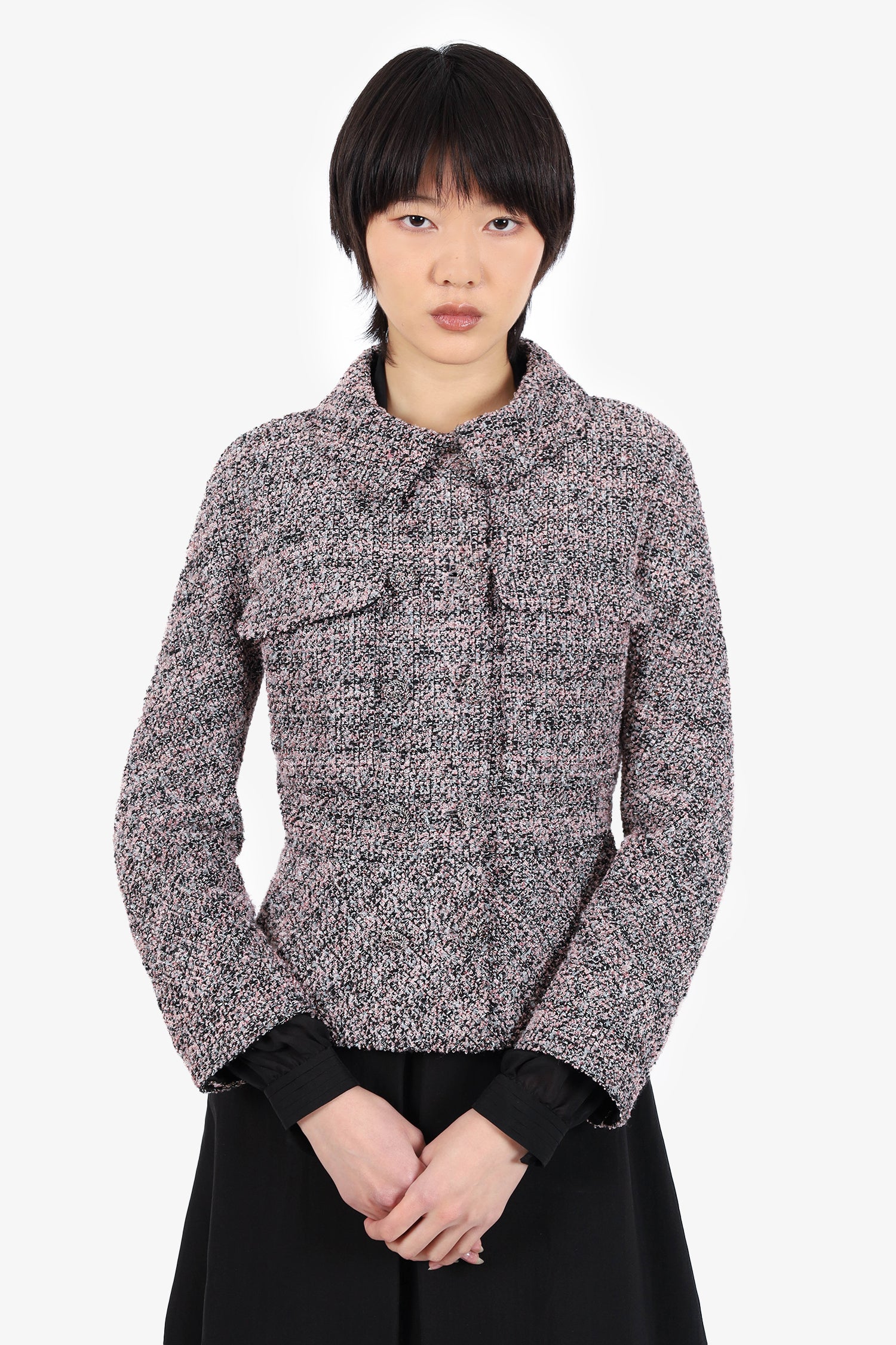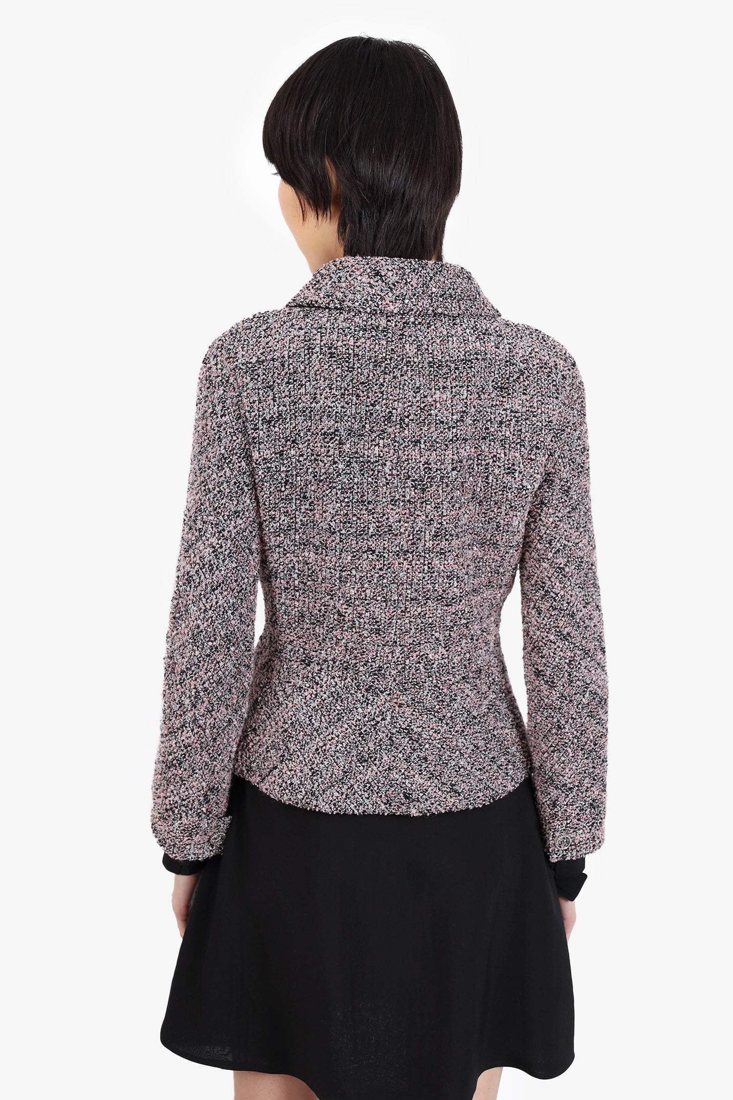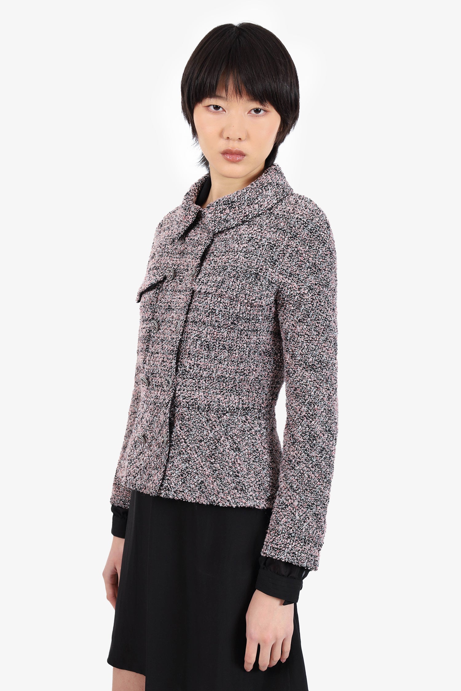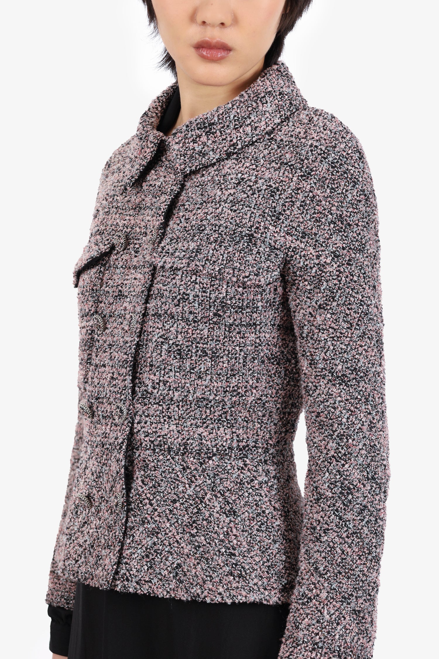 Refresh availabilityPre-Loved Chanel™ Pink/Black Tweed Jacket. Pull-on. Collared neckline. Front button-up closure. 2 chest front slip pockets. Silver-tone hardware. Lined. Tonal stitching.