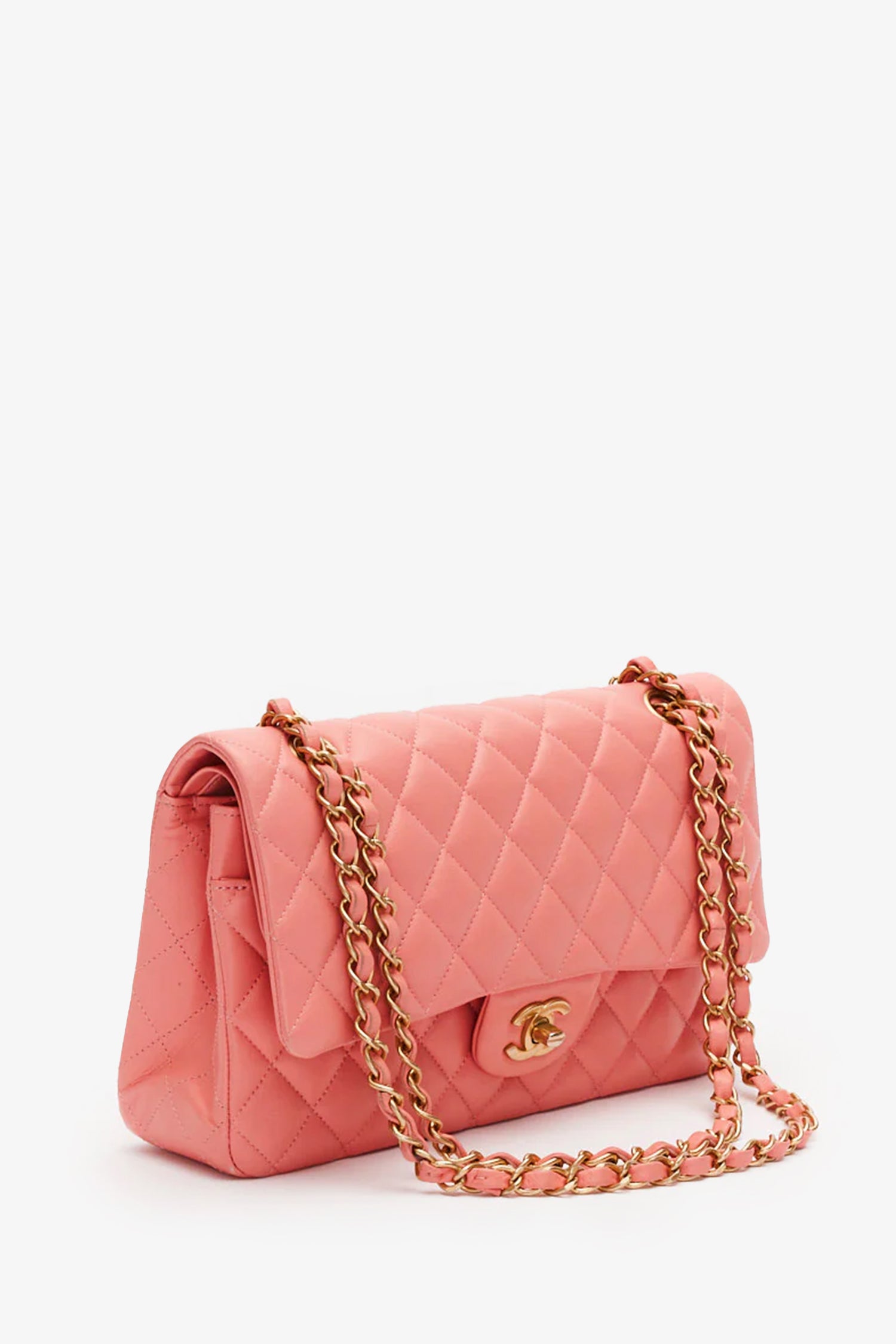 Pre-Loved Chanel™ Pink Lambskin Medium Classic Double Flap Bag 'Refurbished'. Turn-lock front closure. 3 internal compartments with 3 slip pockets. Single rear slip pocket. Gold-tone hardware. Tonal stitching.